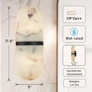- Crafted with a metal frame and a beautiful high-quality resin that resembles alabaster, this wall sconce adds a touch of modern sophistication to any space.