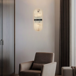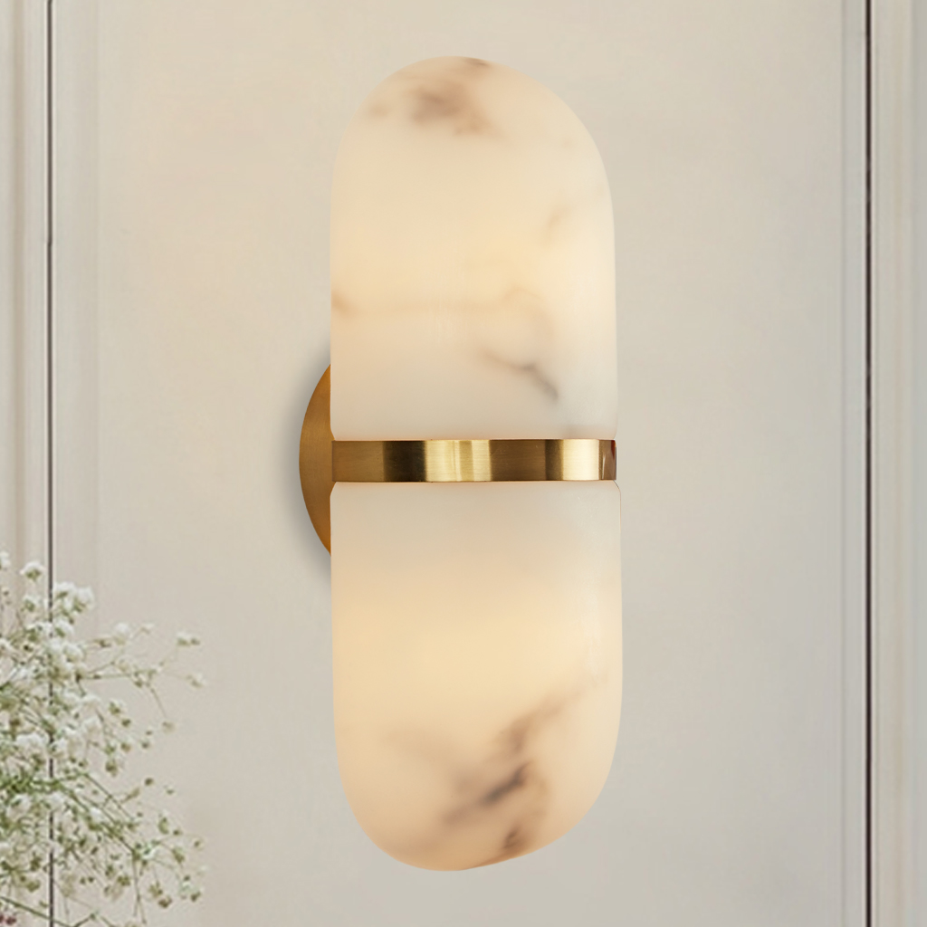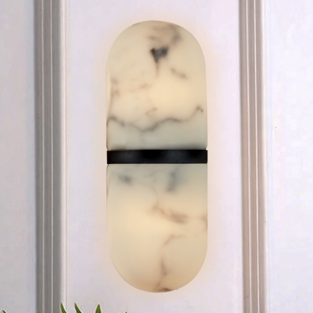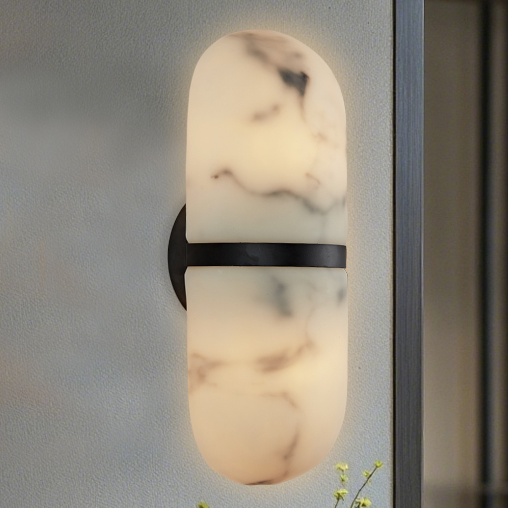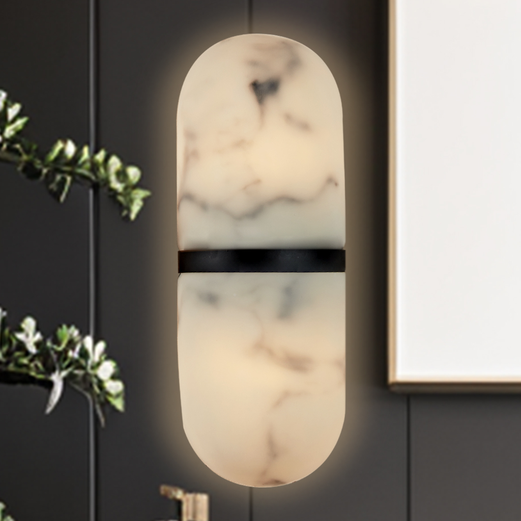 - Material and Finish: Crafted with a metal structure and a resin shade that mimics alabaster, the sconce combines durability with a touch of luxury.