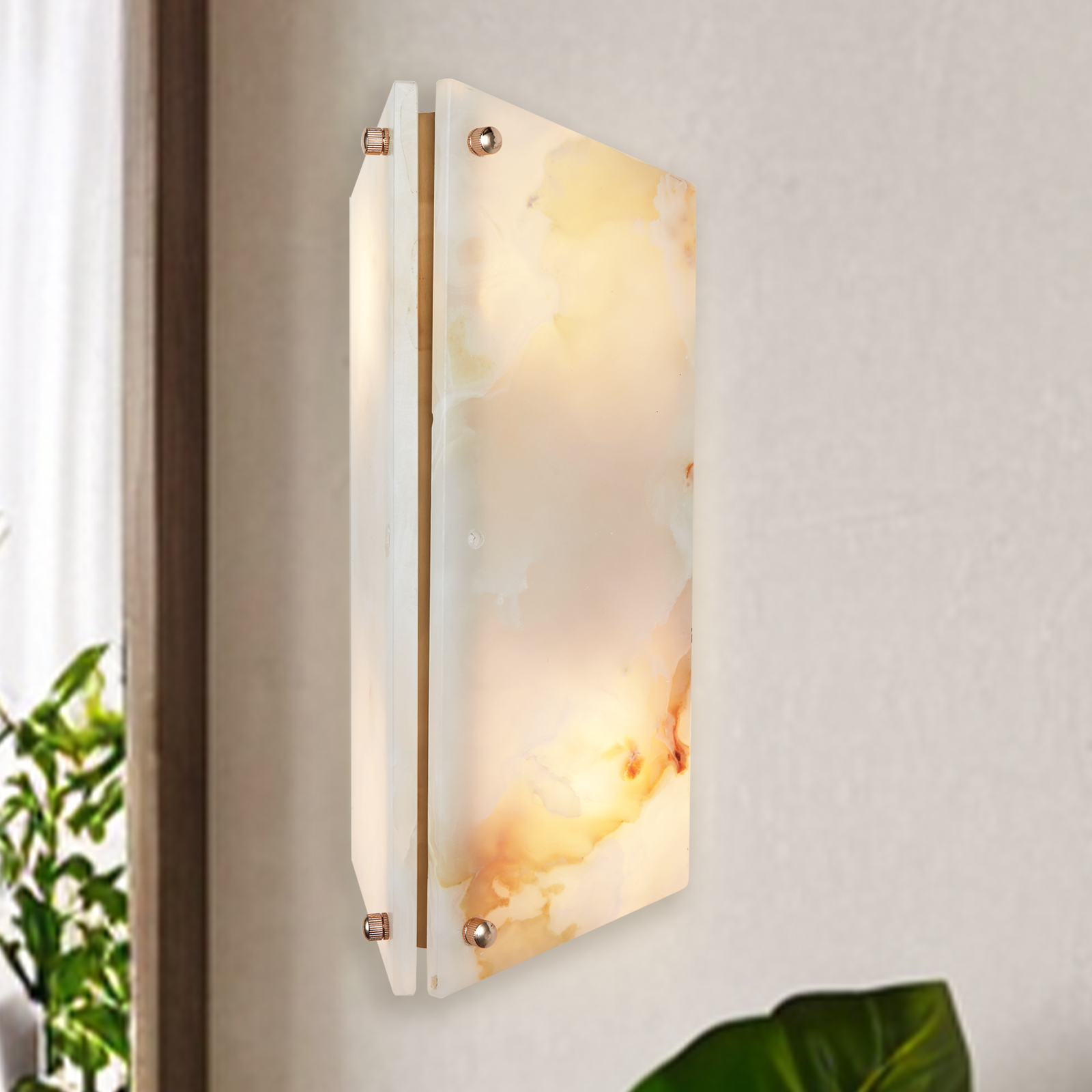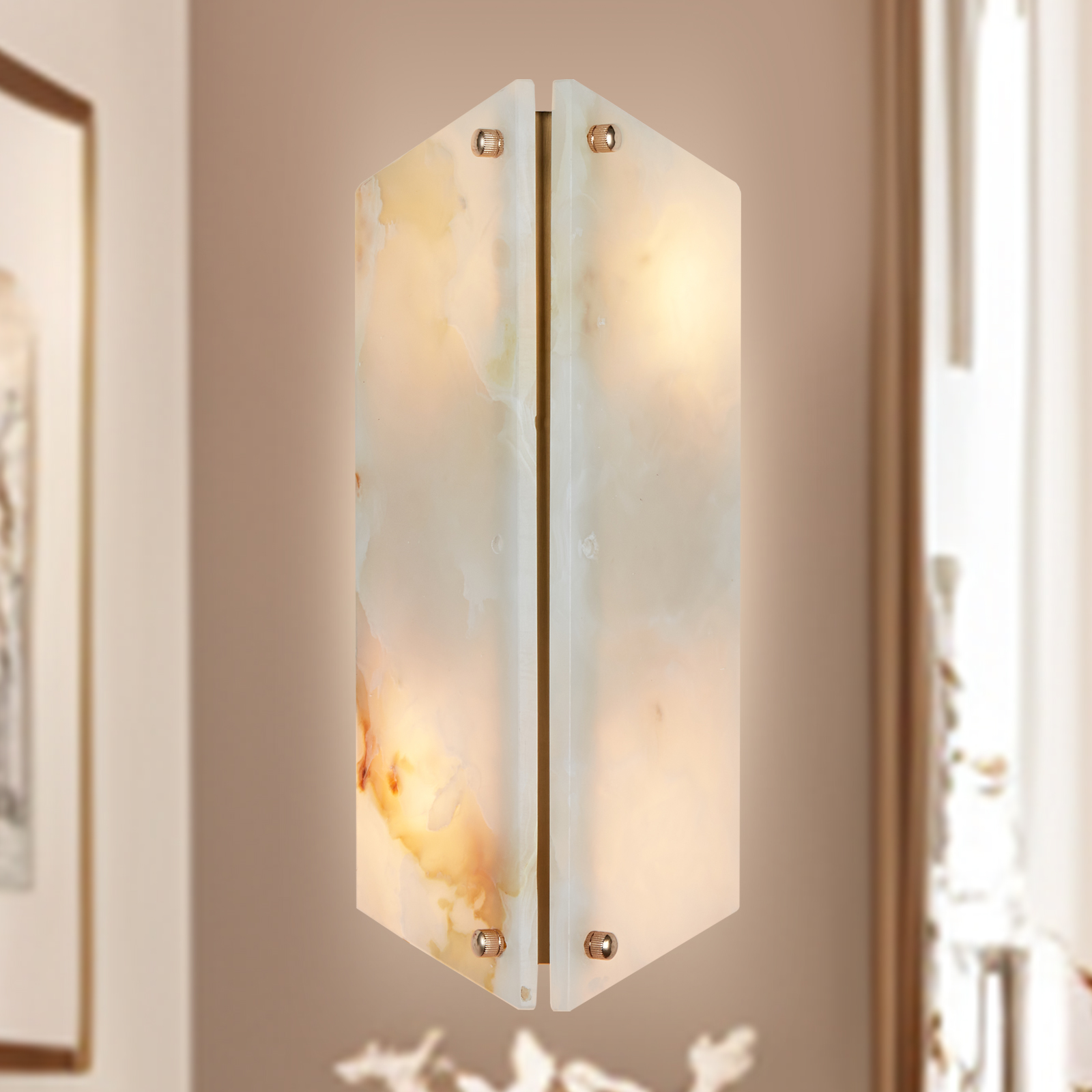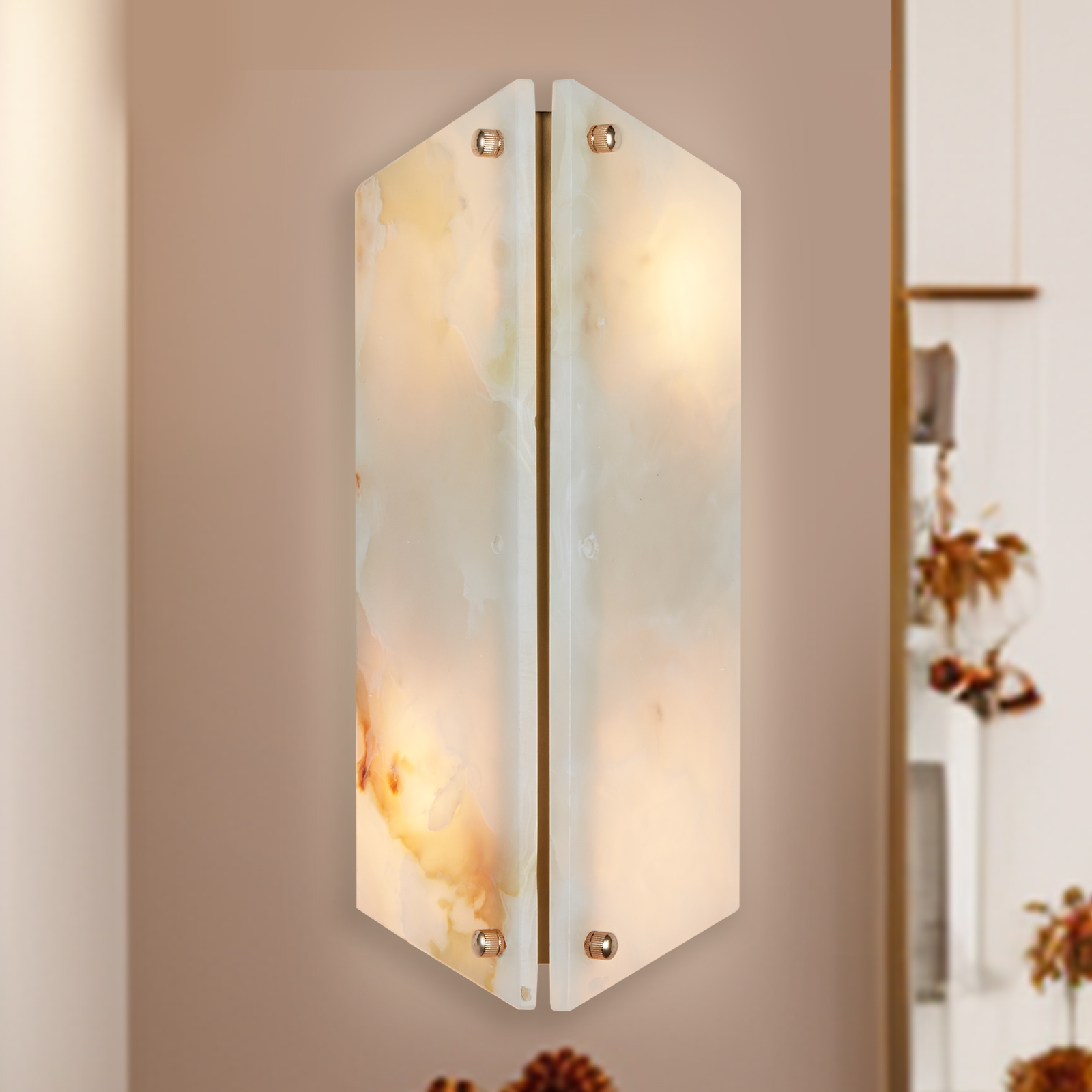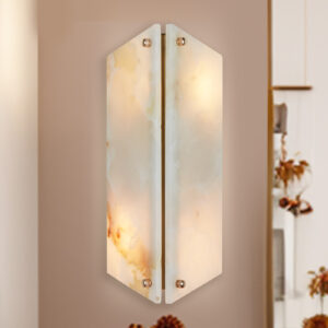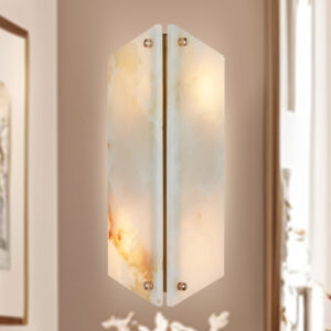 - Perfect for creating a cozy ambiance in your living room, bedroom, entryway or even as a bathroom sconce, this wall light is a versatile choice. Each sconce is unique due to the natural variations in the onyx stone.