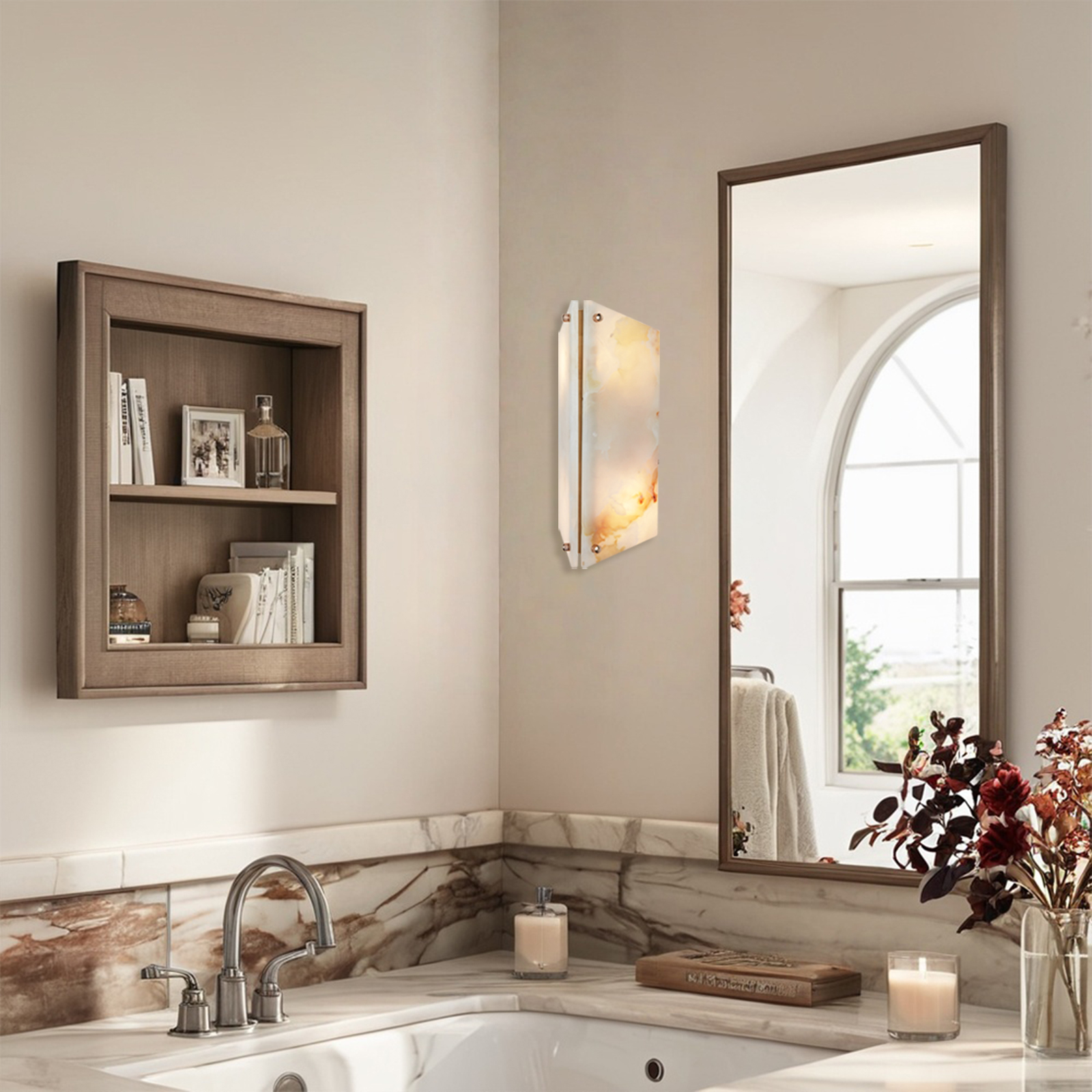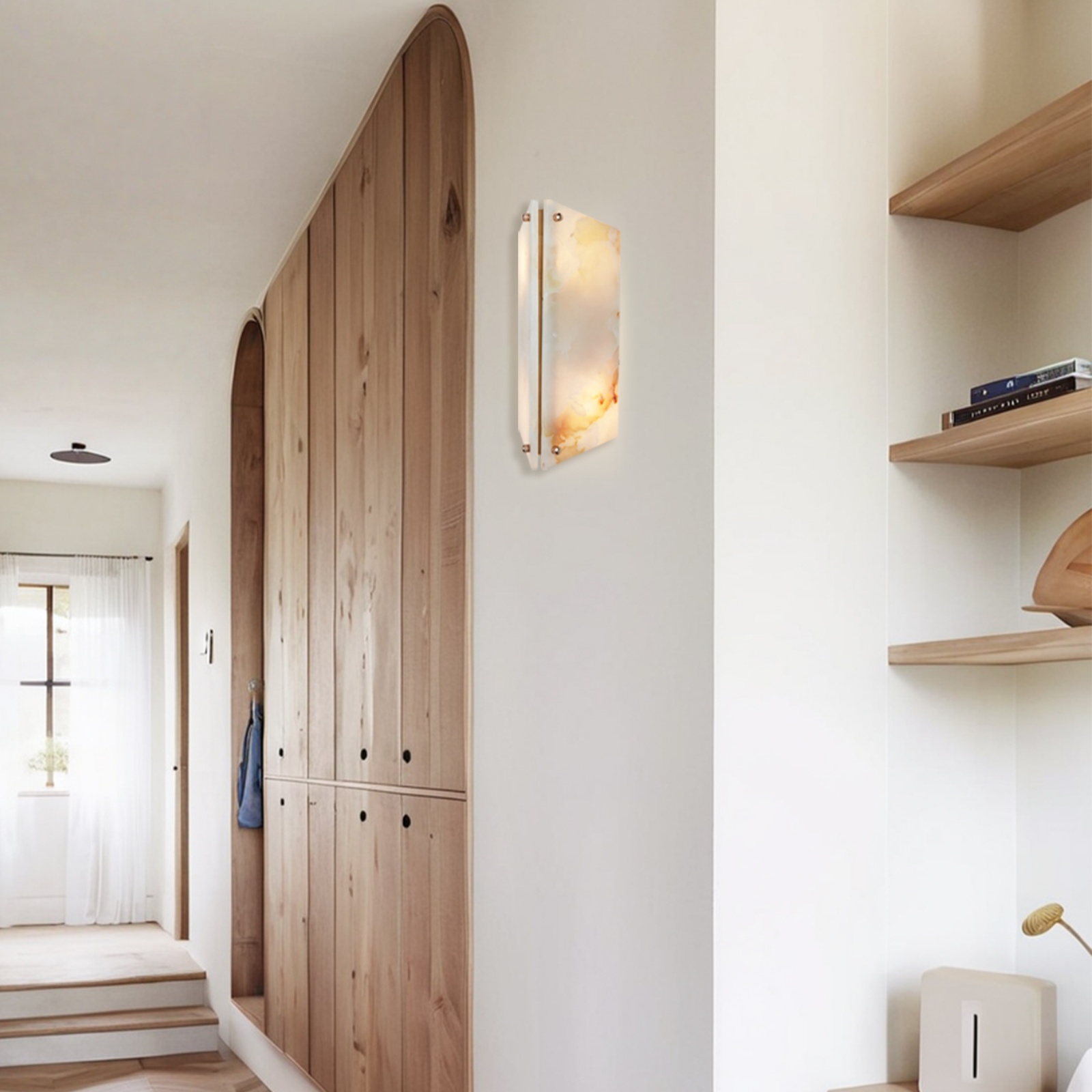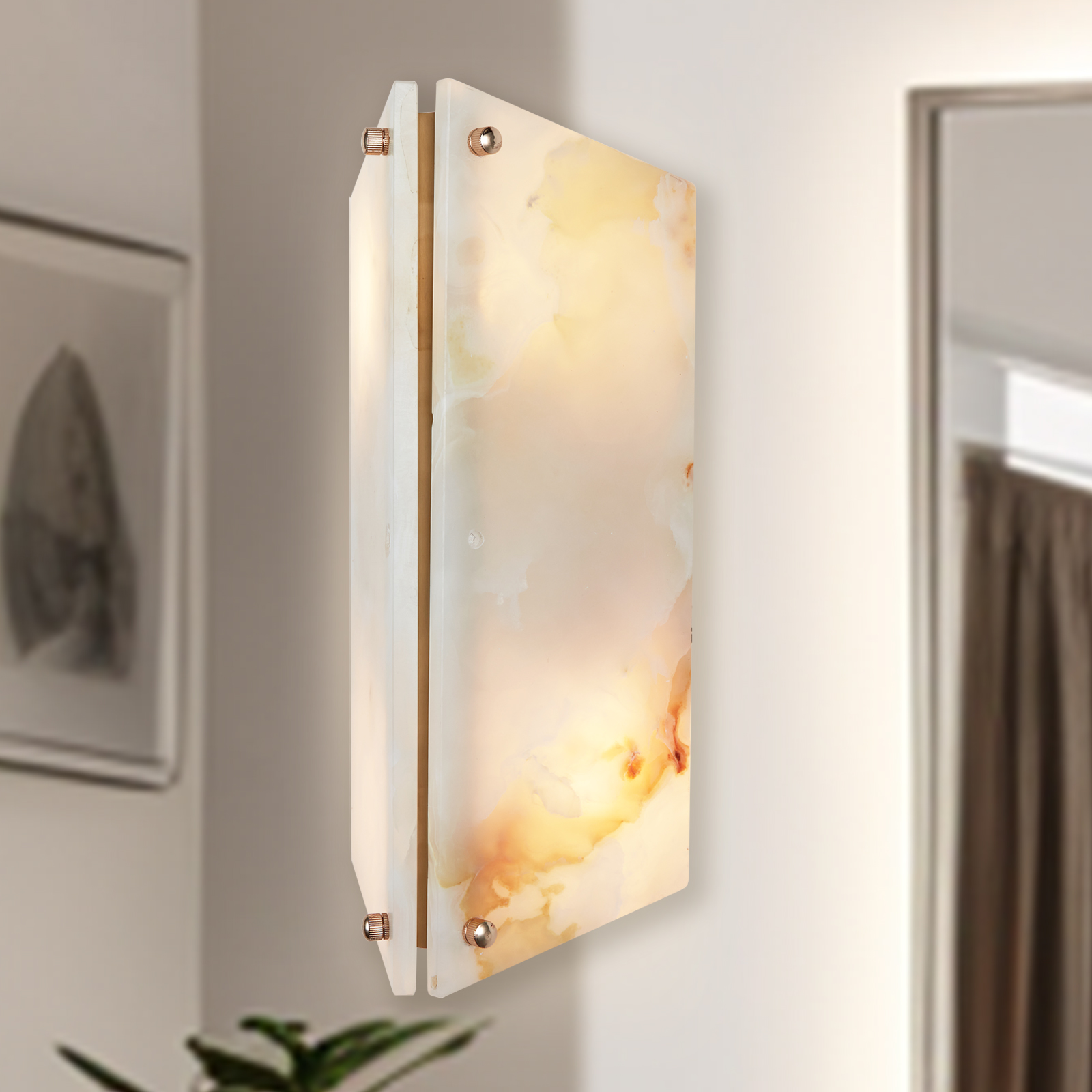 - Perfect for creating a cozy ambiance in your living room, bedroom, entryway or even as a bathroom sconce, this wall light is a versatile choice. Each sconce is unique due to the natural variations in the onyx stone.