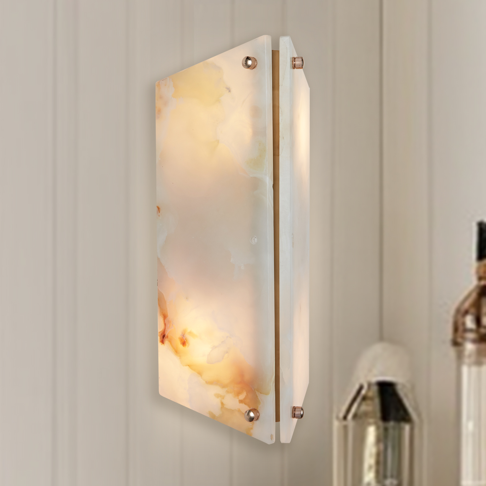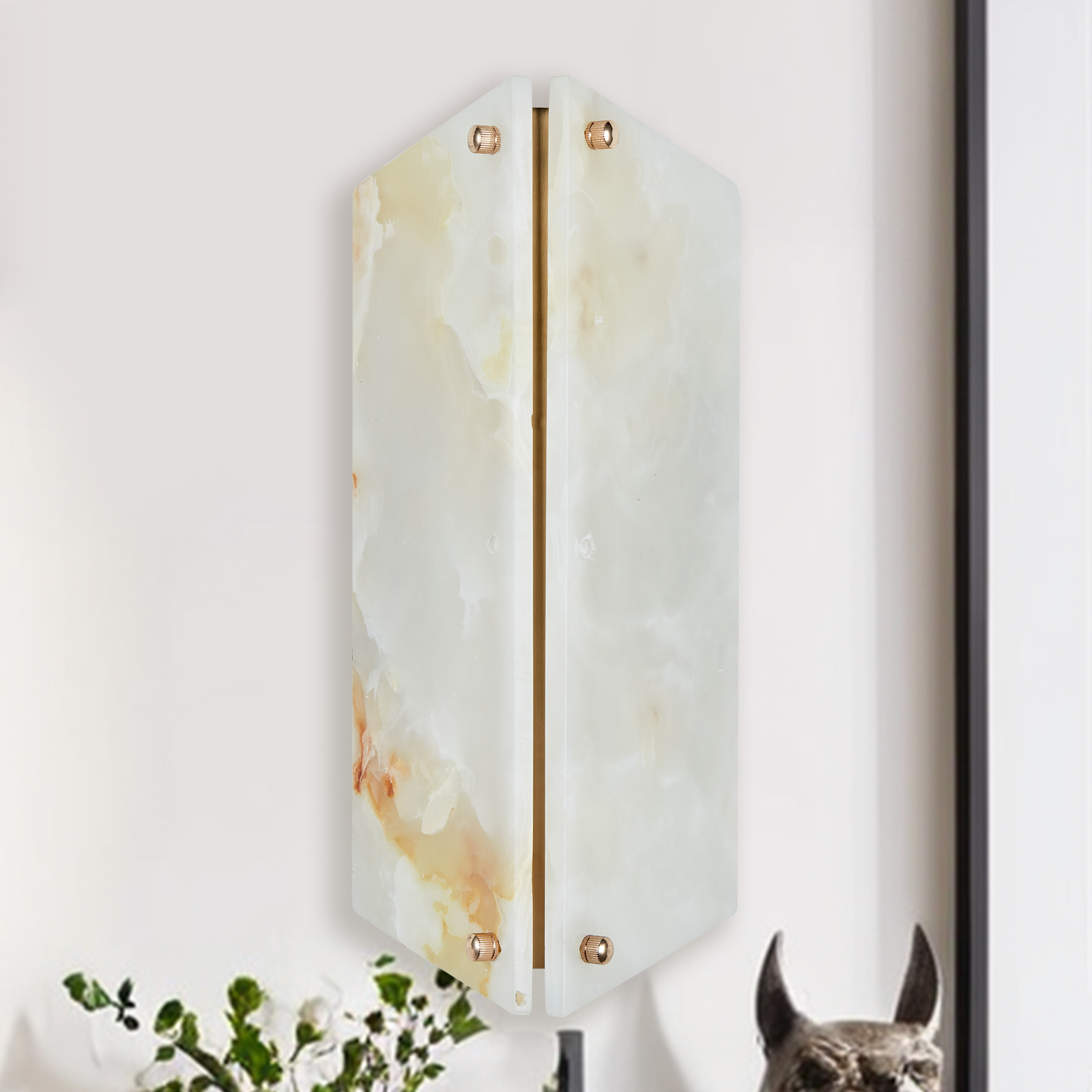 - Inspired by Art Deco design, our Vivien sconce delights with the unique glow of translucent stone. Faceted slabs of cream onyx wash walls with warm light, the natural veining creating beautiful, organic variation, a stunning addition to your home decor.