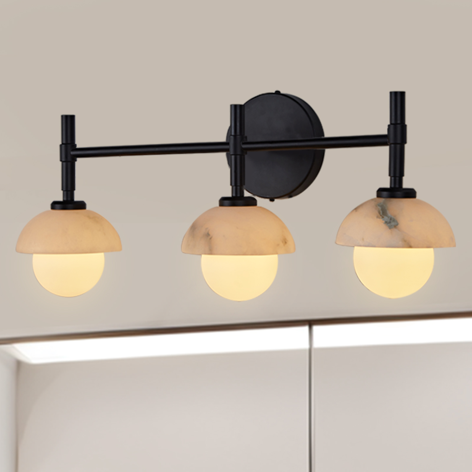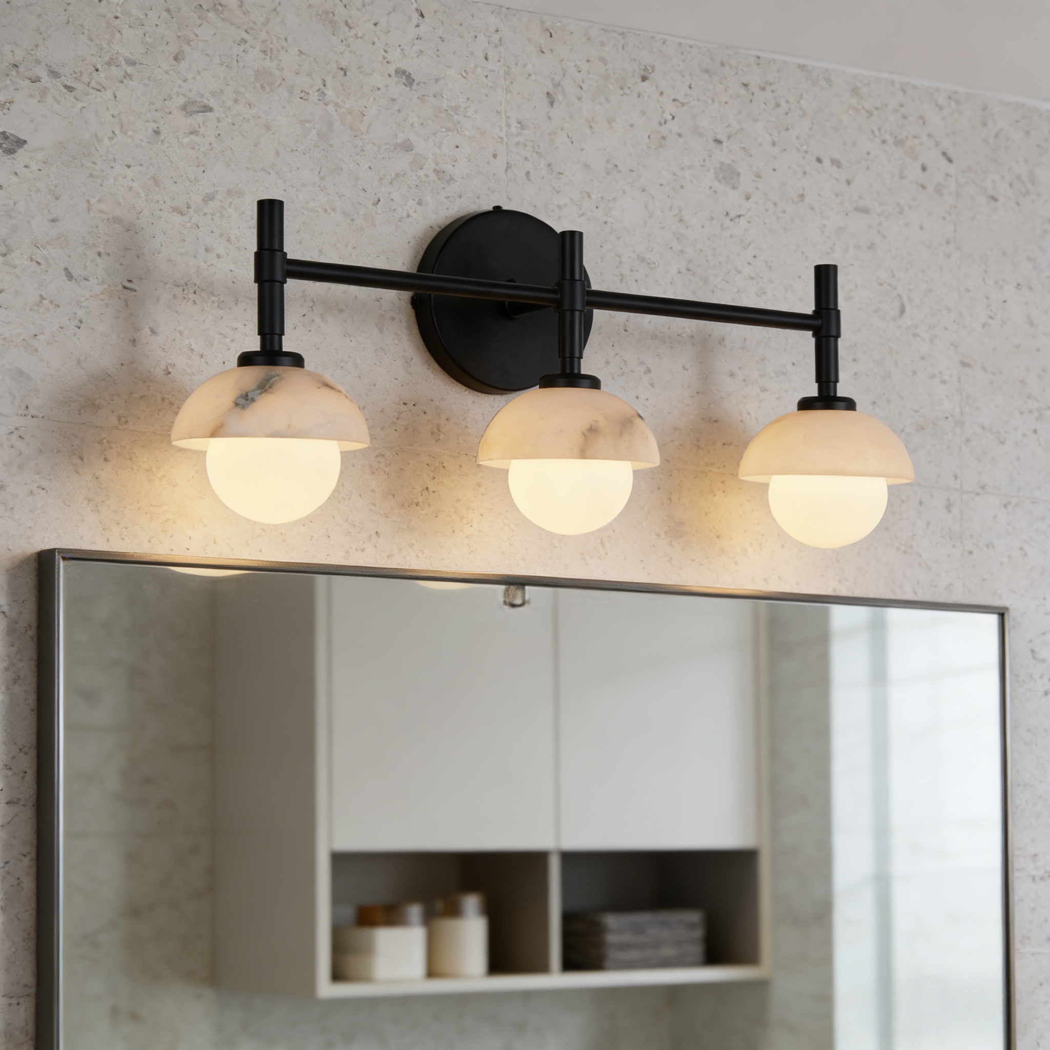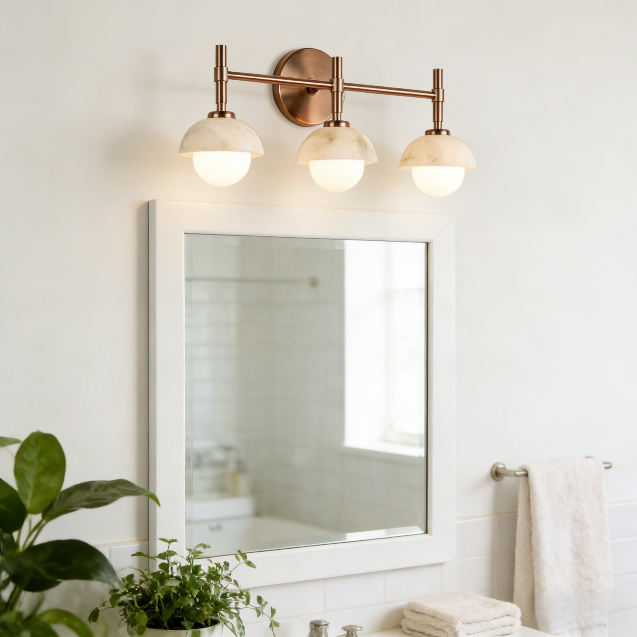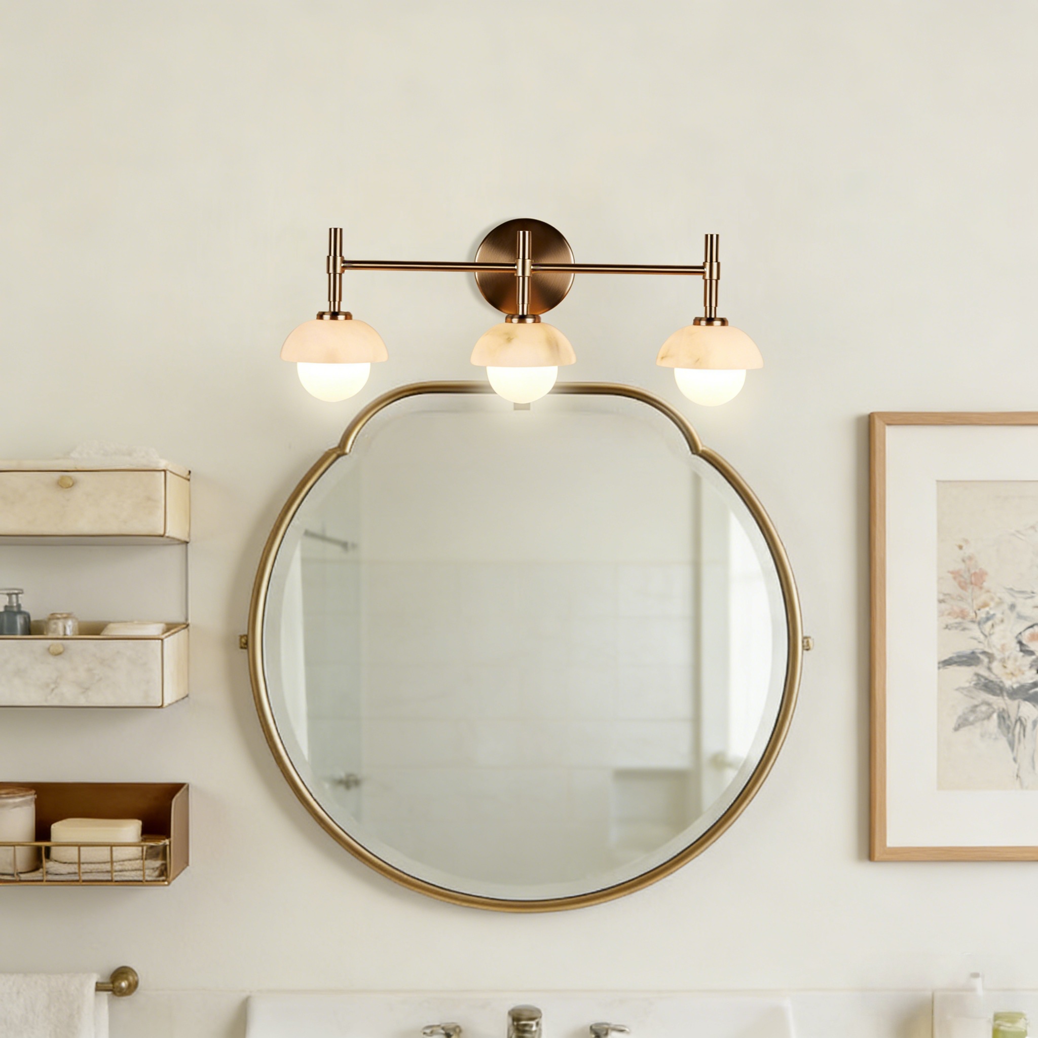 - Enhance your bathroom decor with the exquisite Modern Alabaster Glass Shades Rounded Triple Sconce, a versatile vanity wall lamp that elevates your space with elegance.