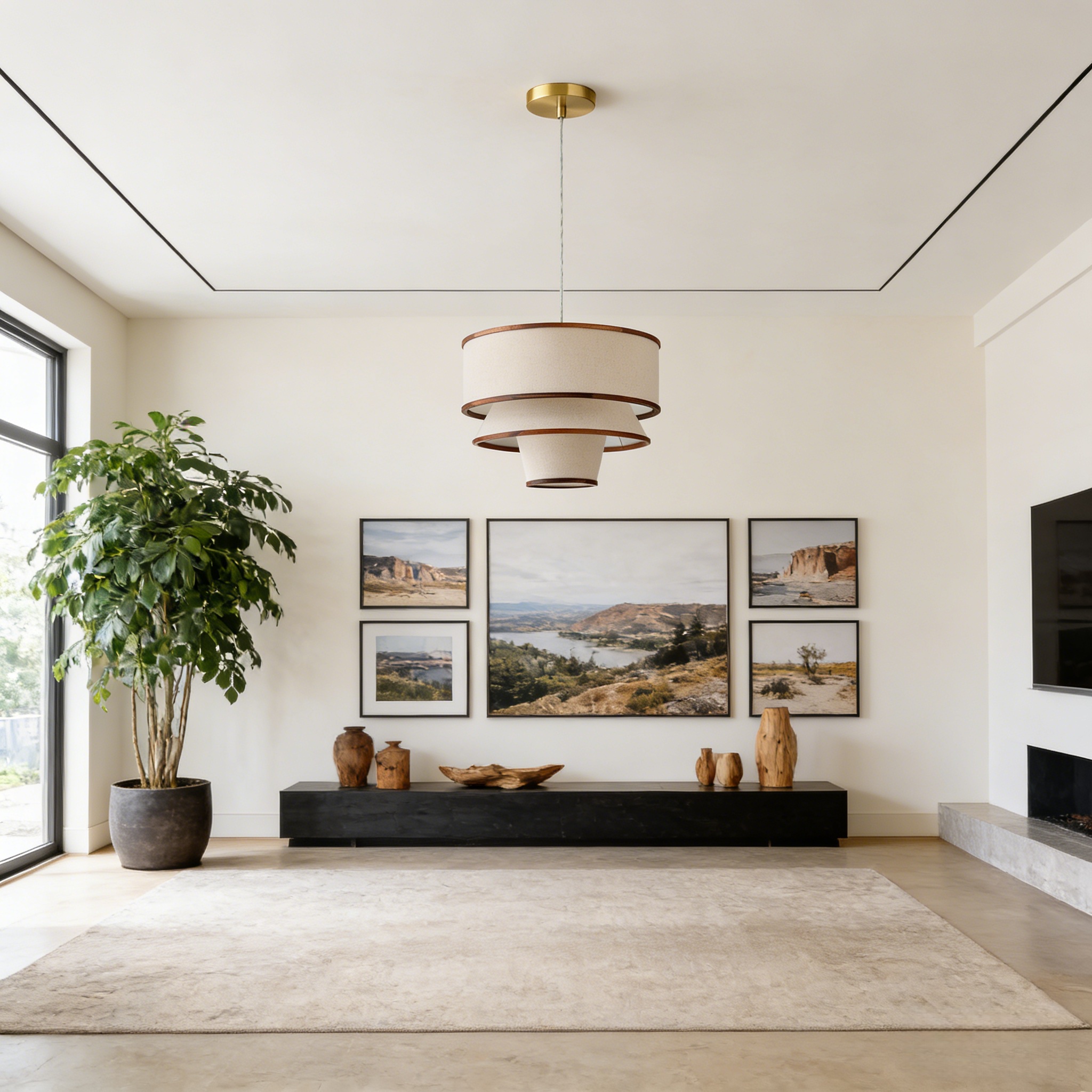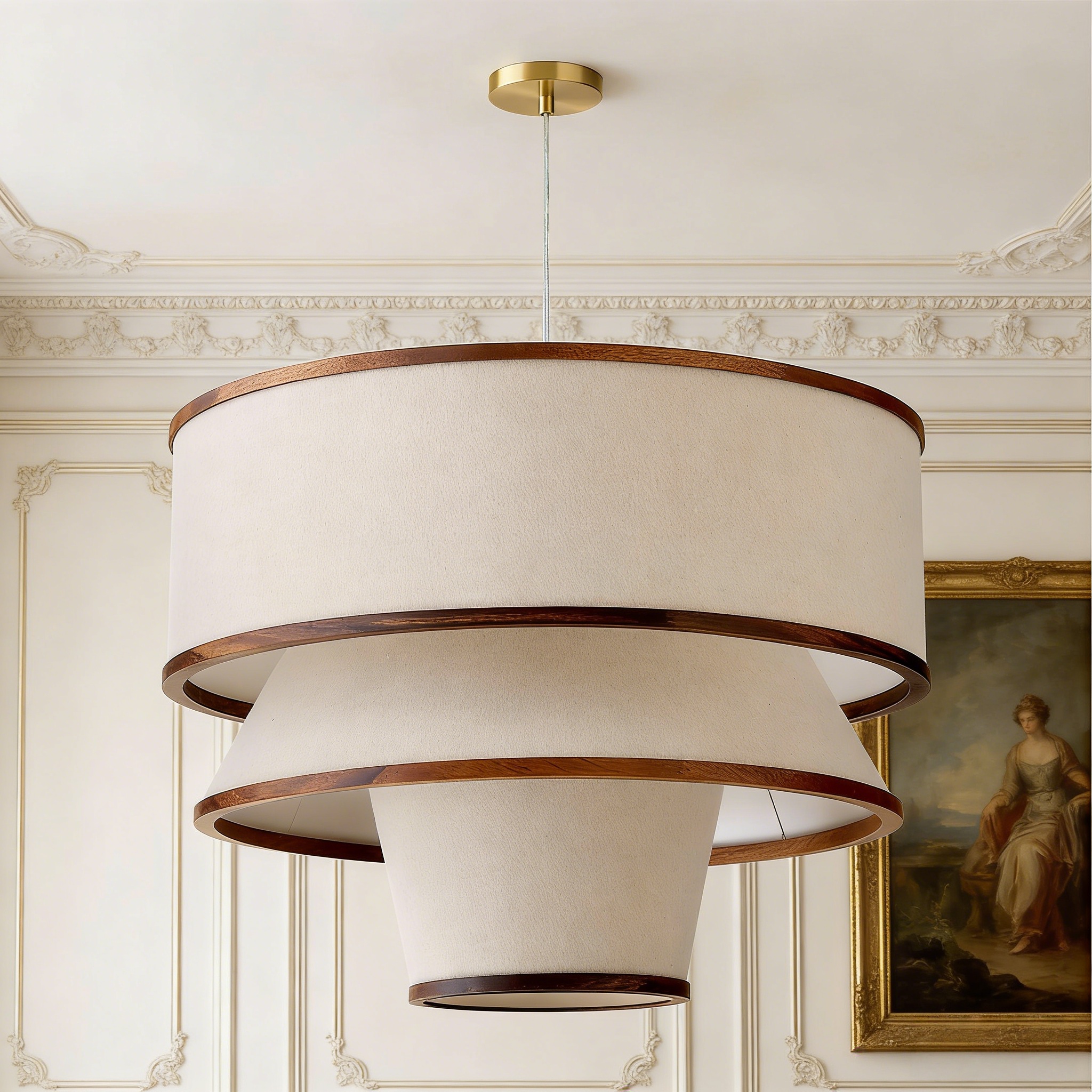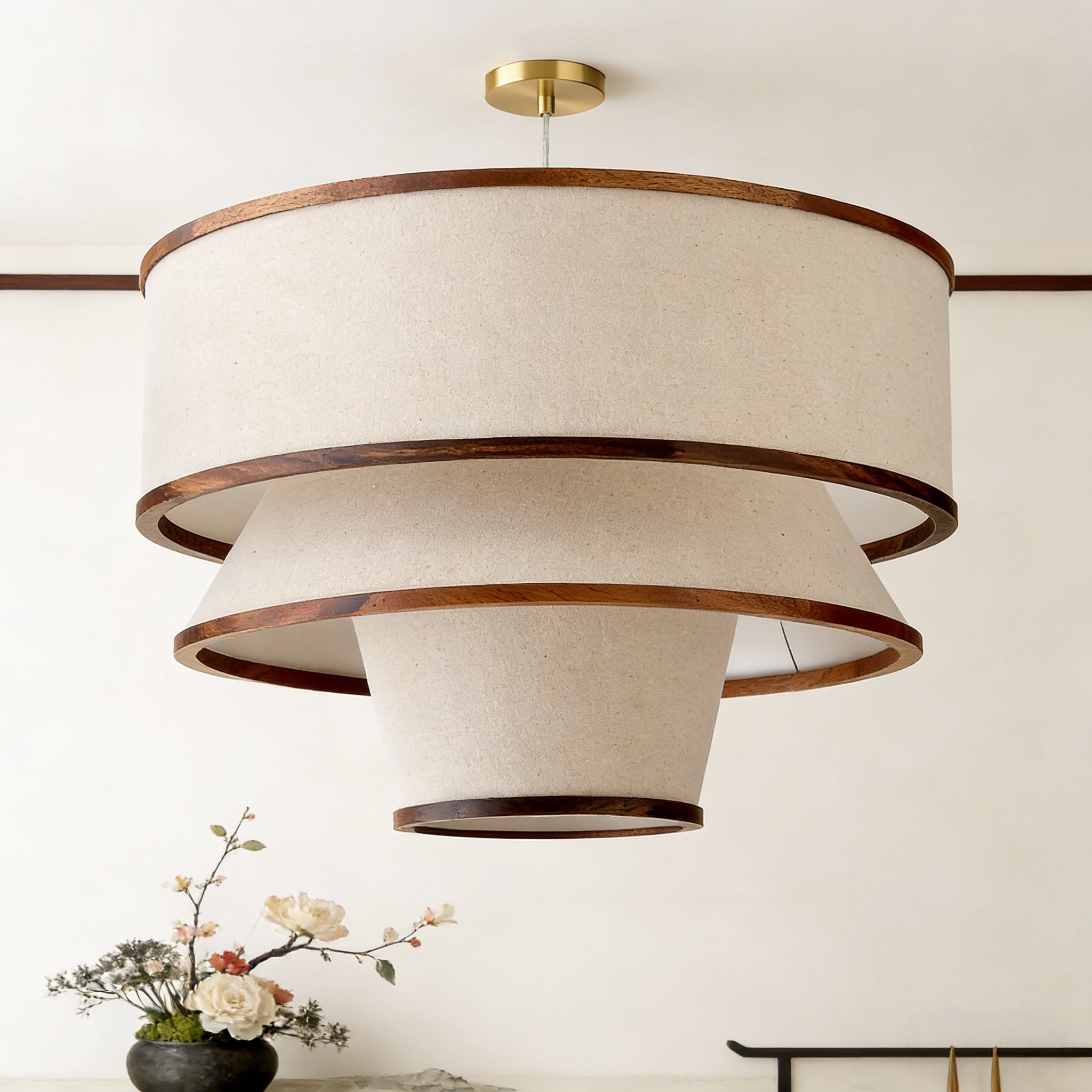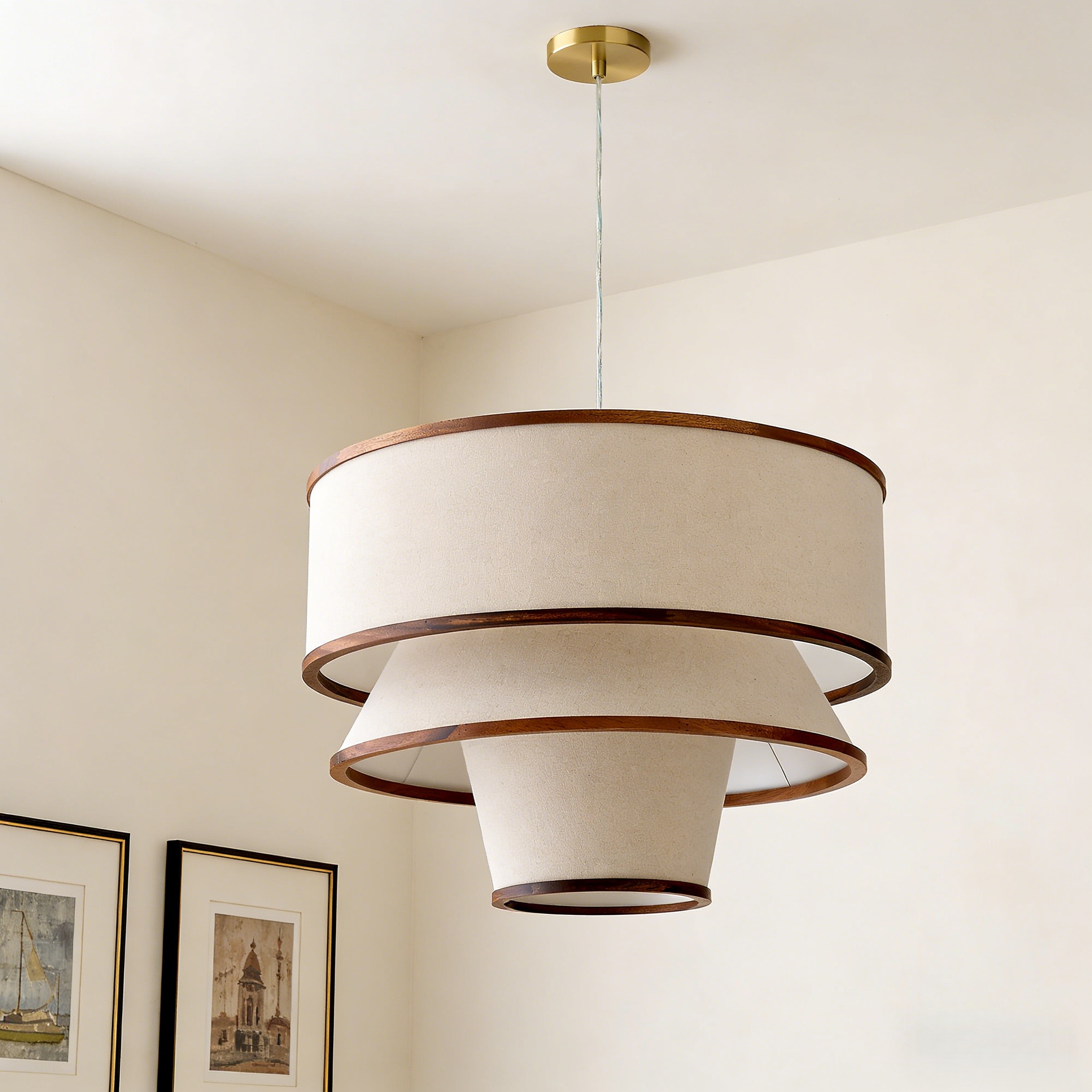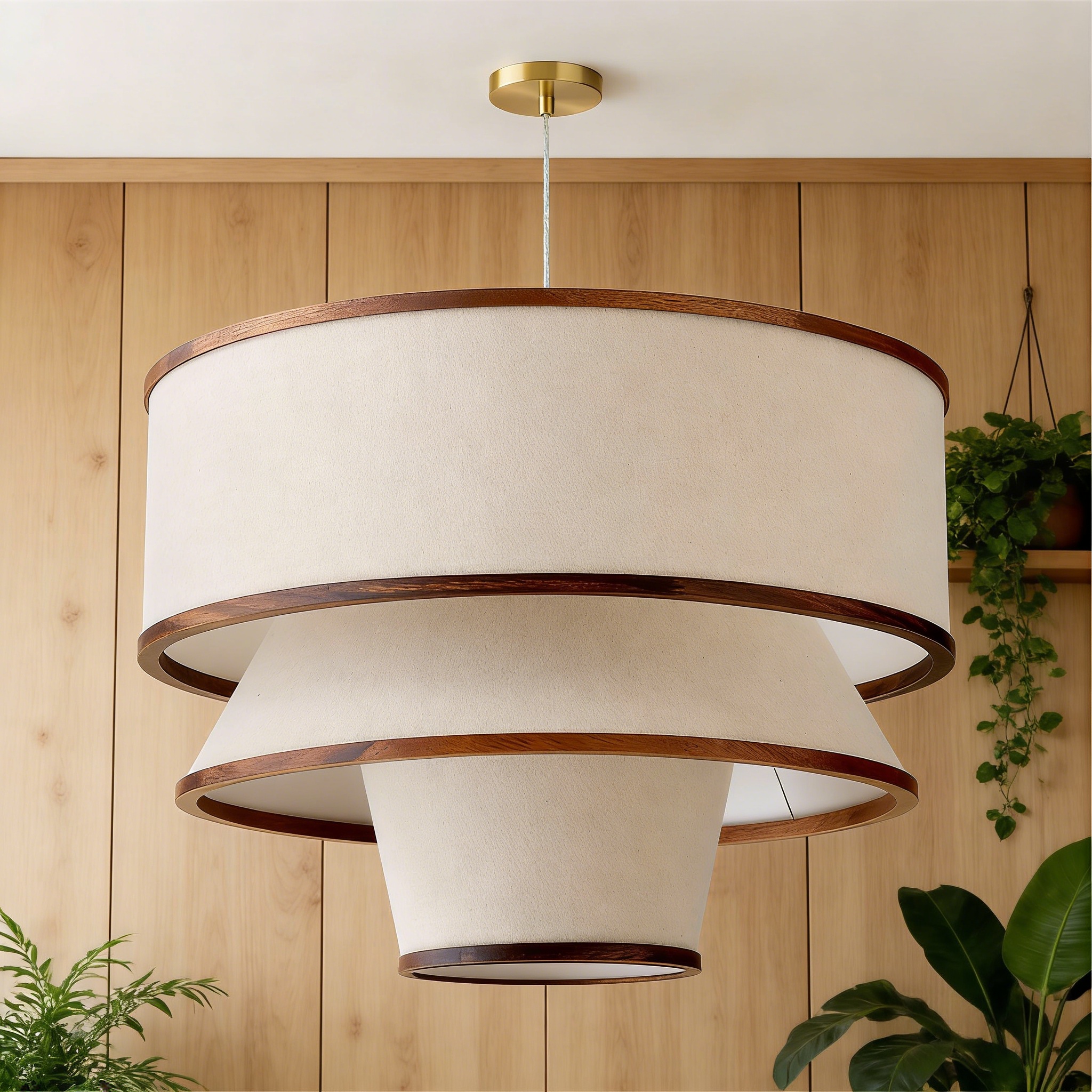 - Elevate your space with a Brazilian modern-inspired pendant light, expertly designed by Studio Anansi to infuse any room with a warm, inviting glow through its natural linen shade. This striking fixture combines understated elegance with thoughtful design, featuring handsome American walnut trim that adds an elevated touch, complementing every surface and decor element it illuminates.