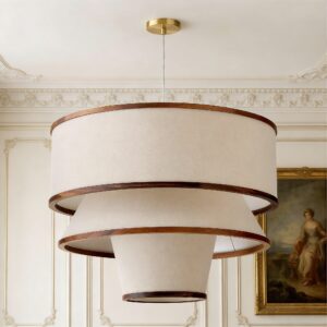 - Fixture Materials: Natural linen shade; American walnut trim; solid unlacquered polished brass canopy and interior frame