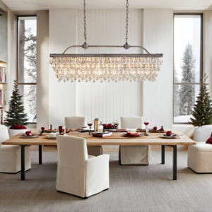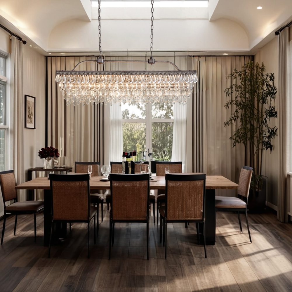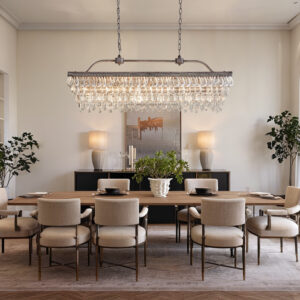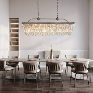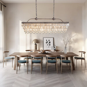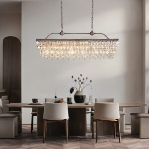 • A timeless classic chandelier reimagined with a rectangular silhouette, blending traditional charm with a modern twist, making it a versatile and stylish lighting option for various settings.