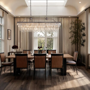 This chandelier’s crown showcases a mesmerizing display of raindrops, providing stunning illumination for dining tables or entryways.
