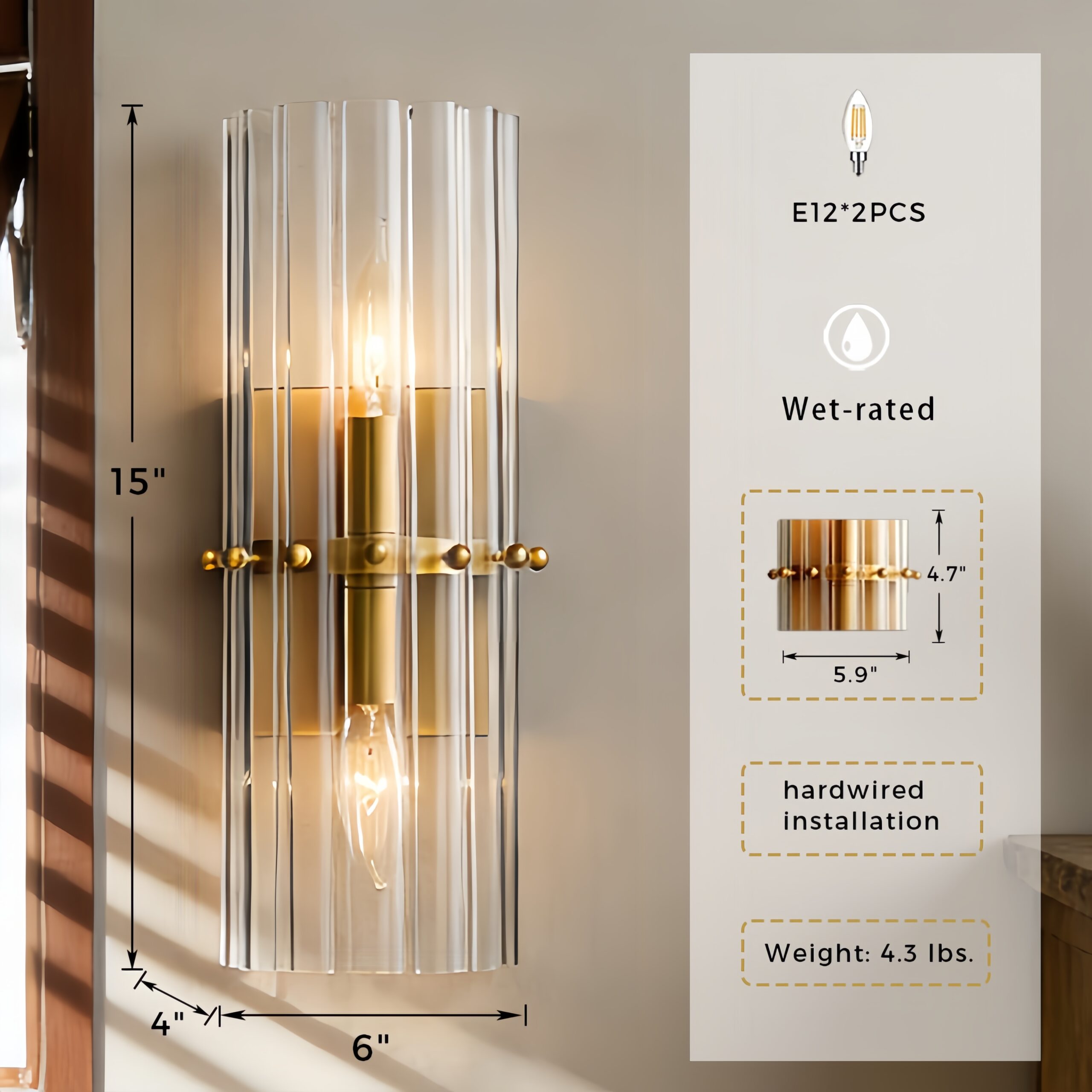 - Dimensions: The overall dimensions of the sconce are 6″ wide x 4″ deep x 15″ high, with a backplate measuring 4.5″ wide x 3″ deep x 6″ high, making it a perfect fit for various wall spaces.