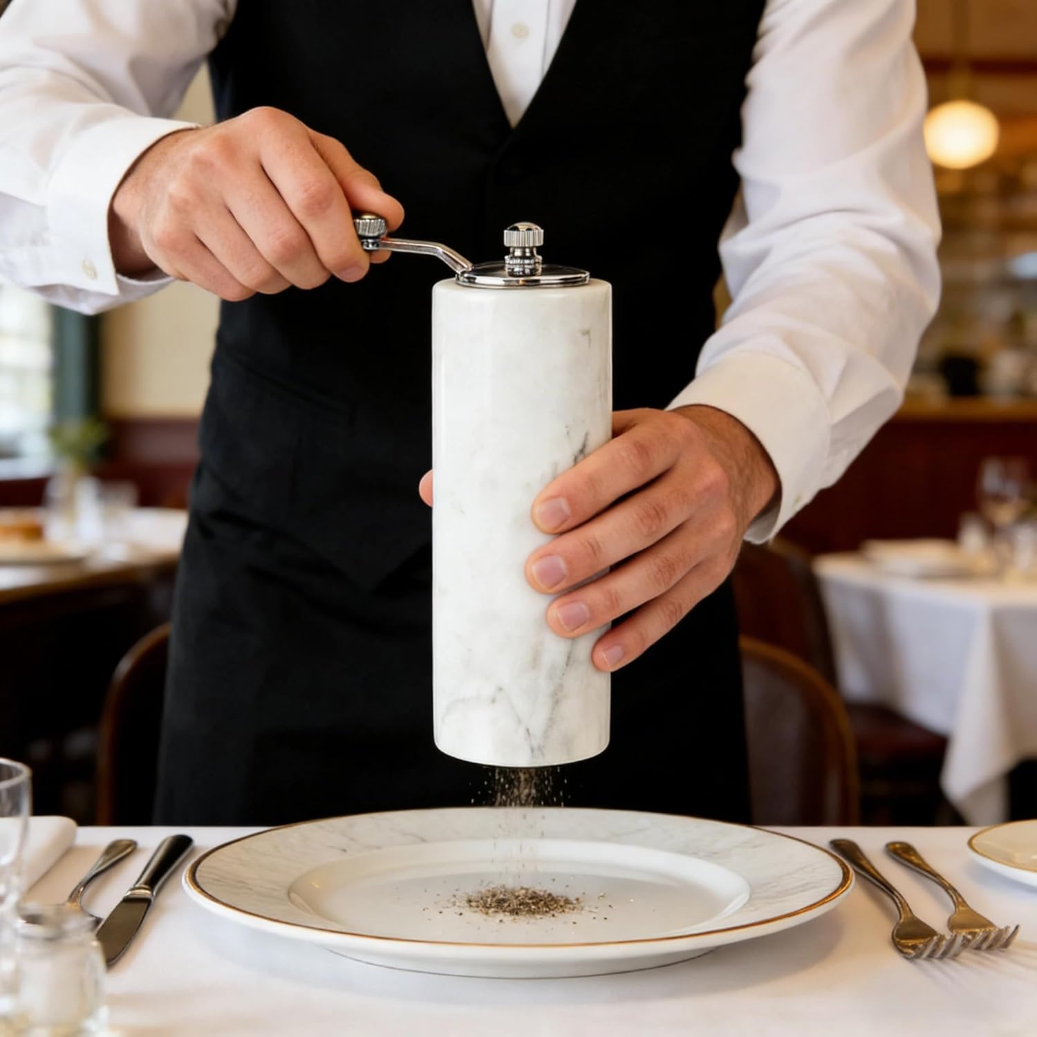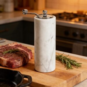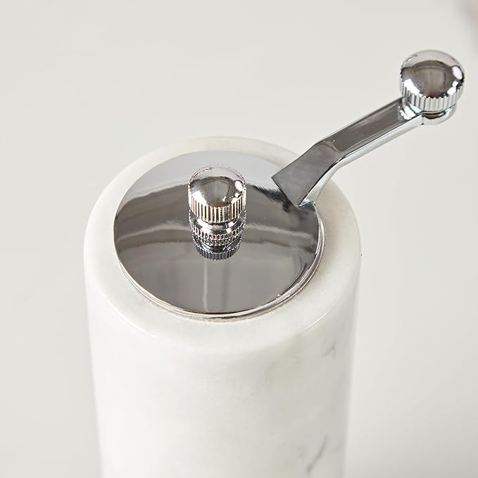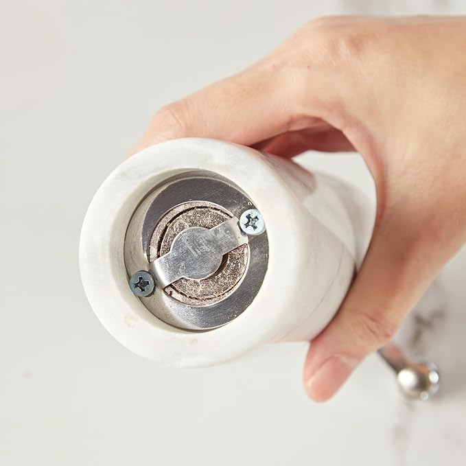 - Add a touch of elegance to your kitchen or dining room with this sleek Marble Salt and Pepper Mill set.