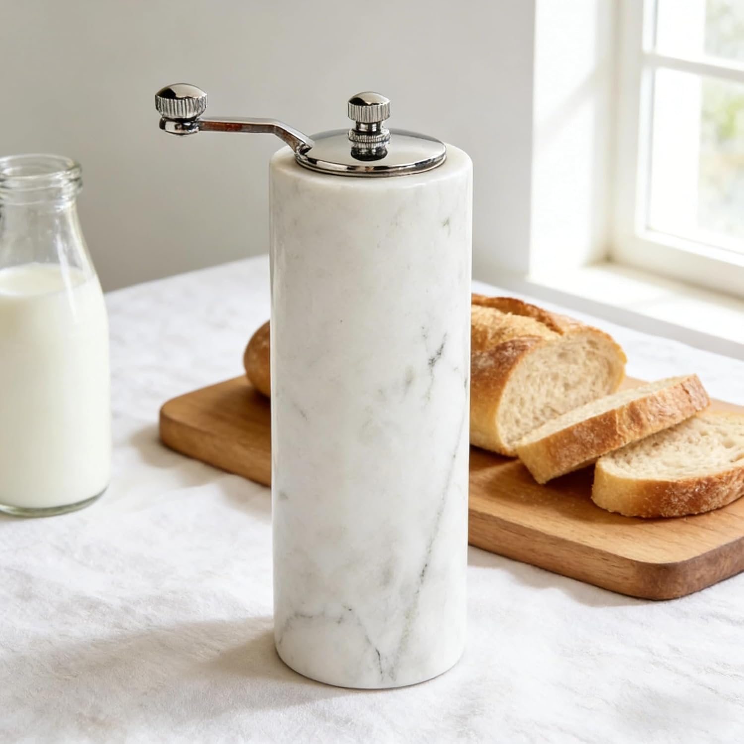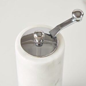 - Crafted from cool, white marble, this tall and slim pepper mill allows adjustable grinds from coarse to fine, perfect for seasoning.