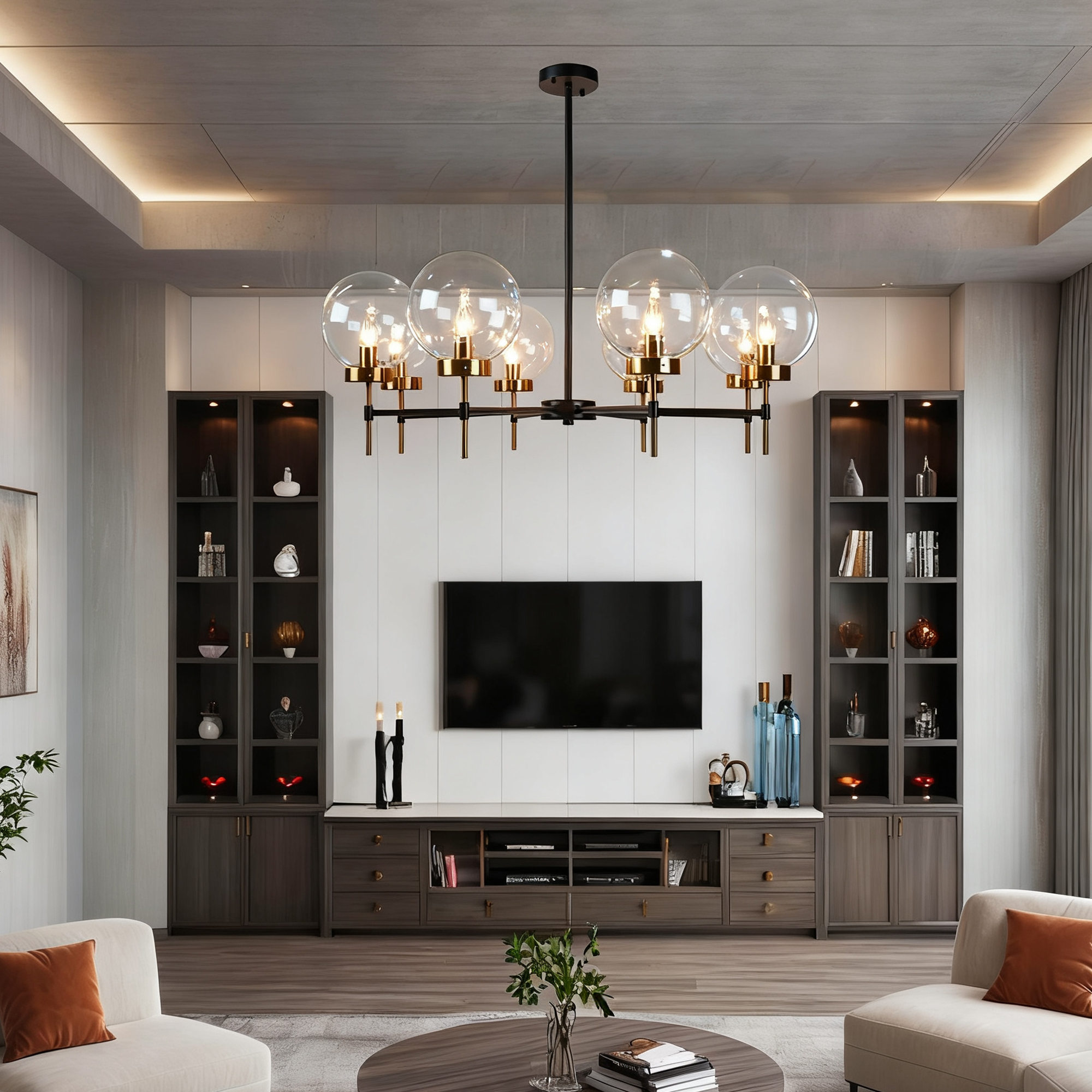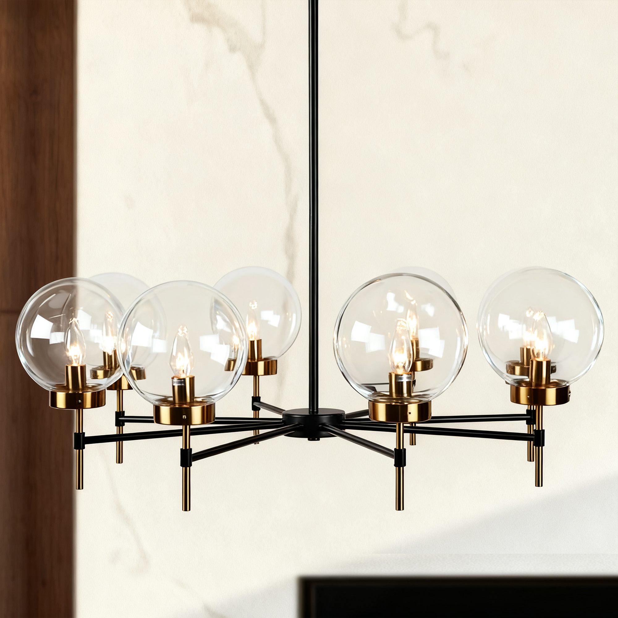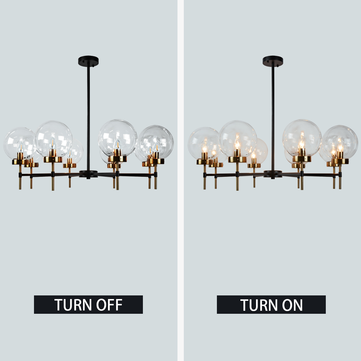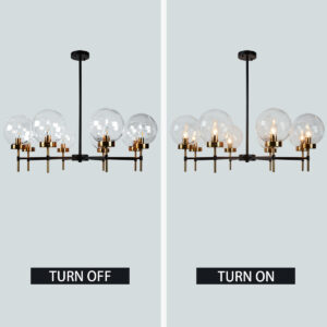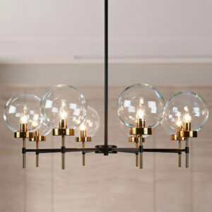 - The glass globe round chandelier features a brilliant display of two-toned metals and blown-glass orbs, creating a modern and sleek aesthetic inspired by mid-century form.