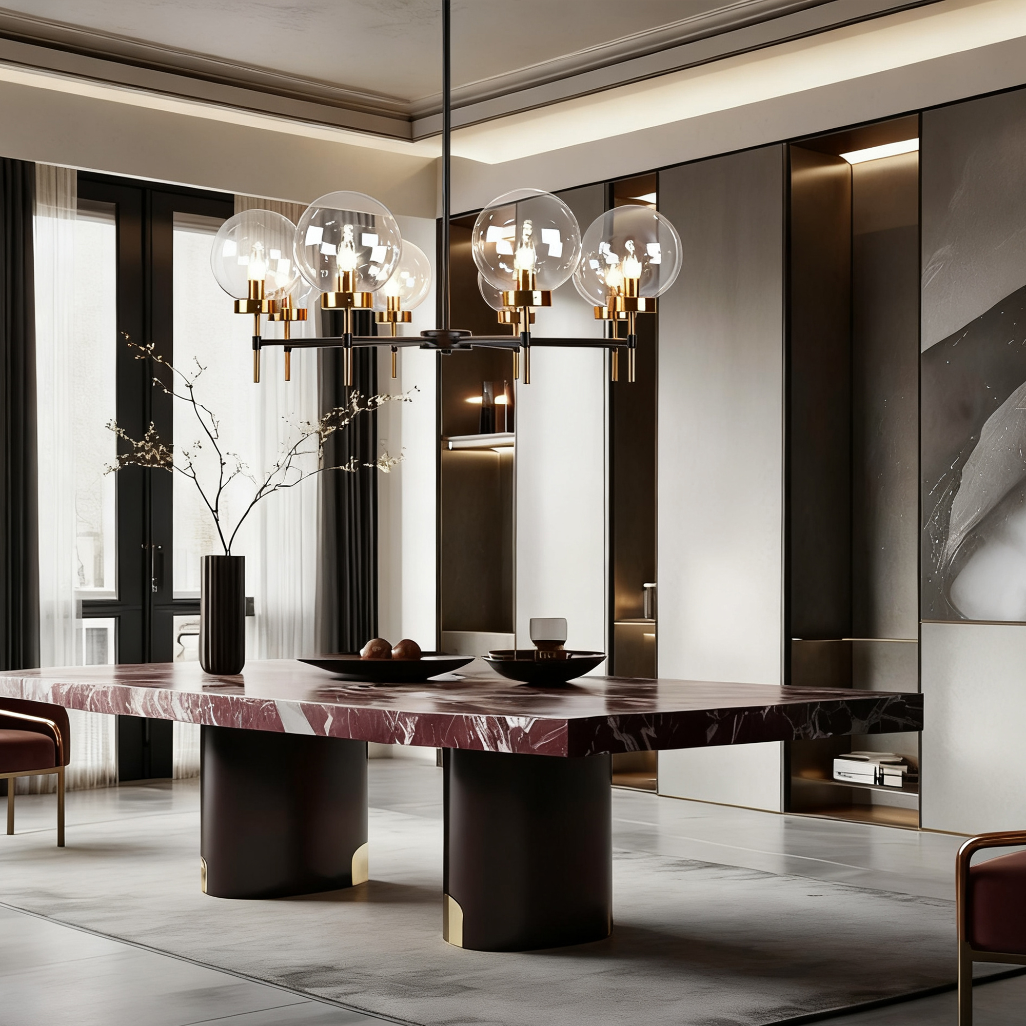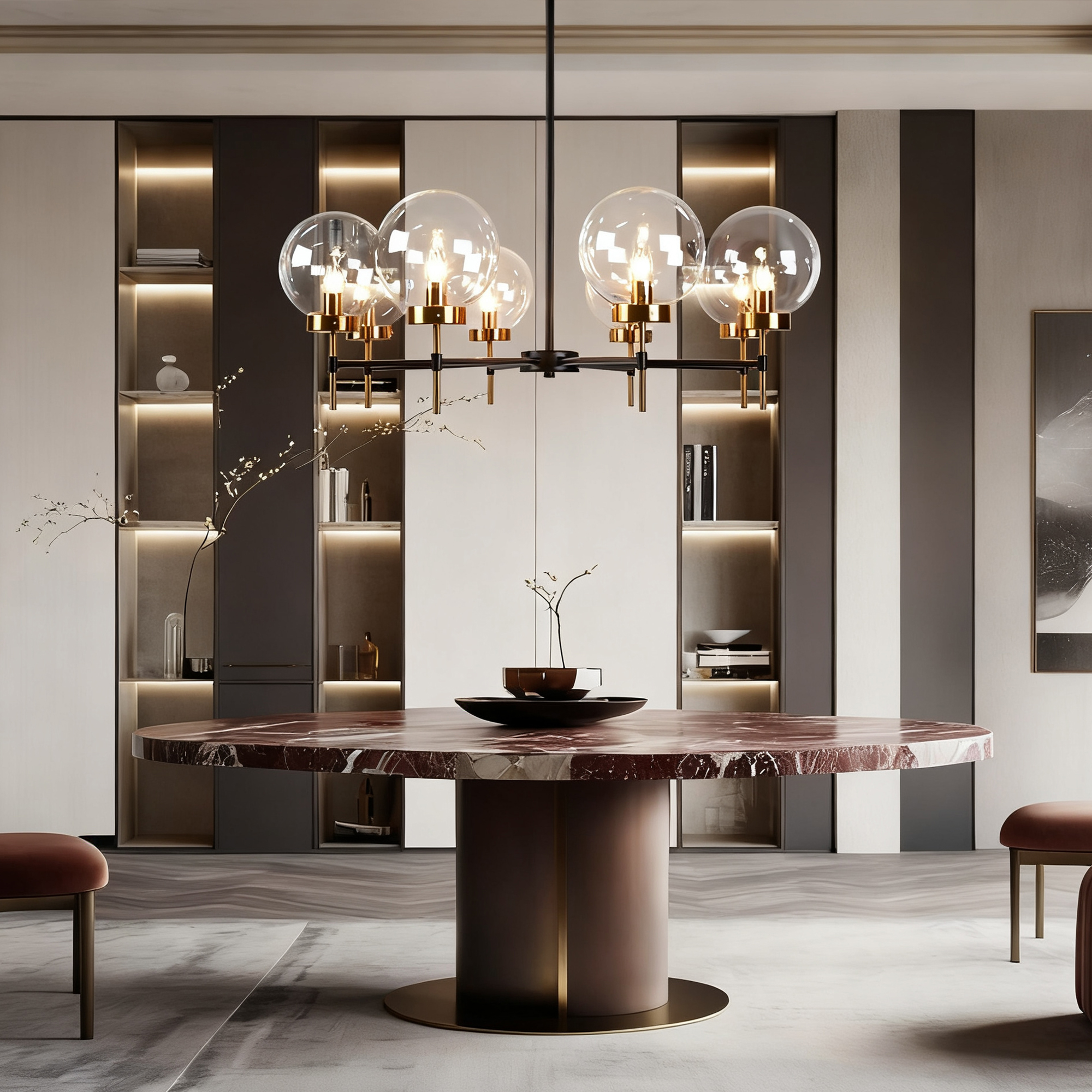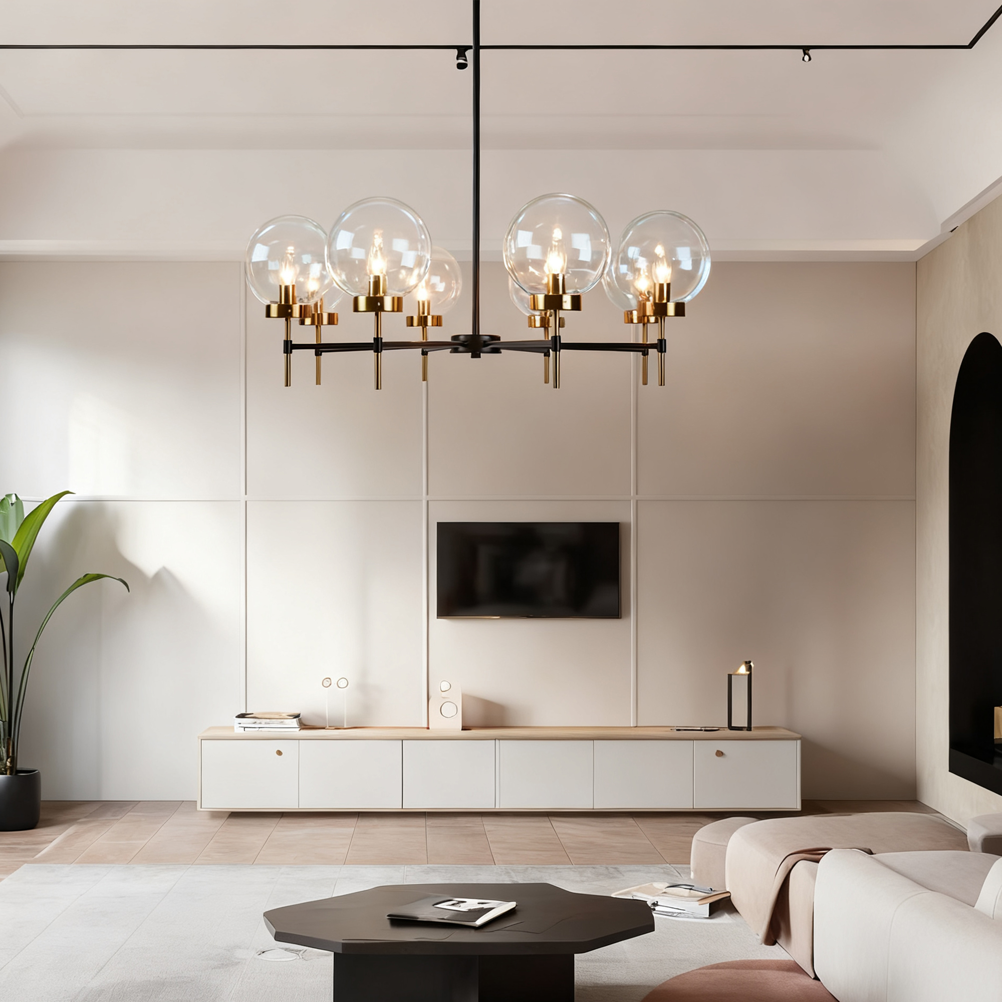 - The glass globe round chandelier features a brilliant display of two-toned metals and blown-glass orbs, creating a modern and sleek aesthetic inspired by mid-century form.
