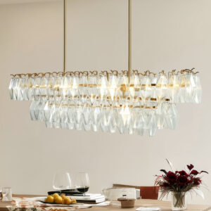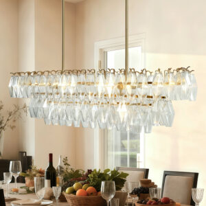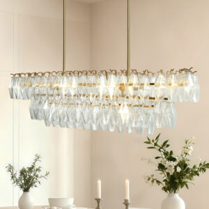 - Design Aesthetic: The Crystal Linear Chandelier merges timeless elegance with modern sophistication. Its fluted crystal effect enhances visual interest and casts a stunning play of light, beautifully complemented by a luxe metallic sheen for refined elegance.