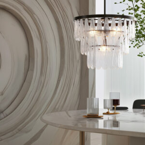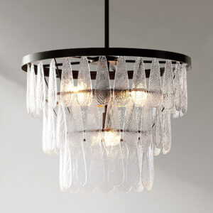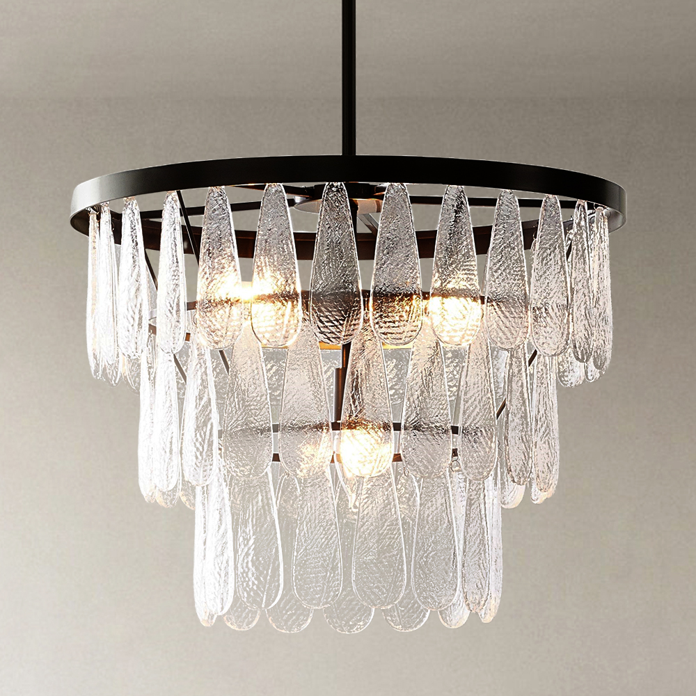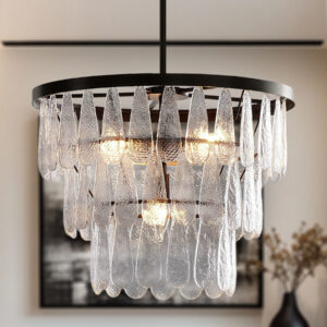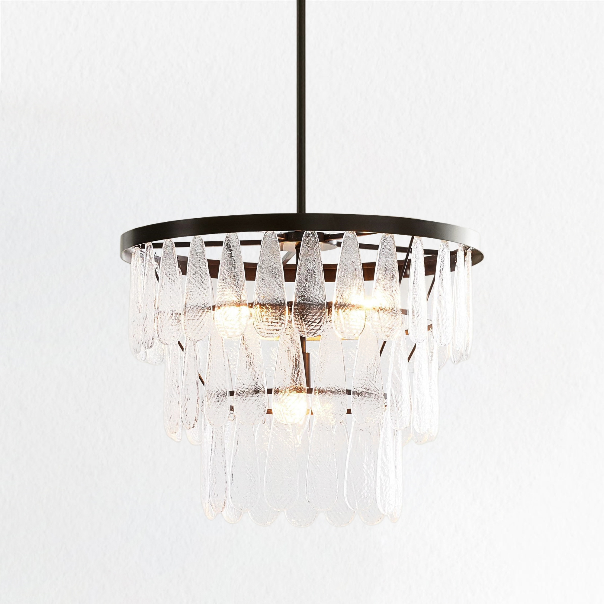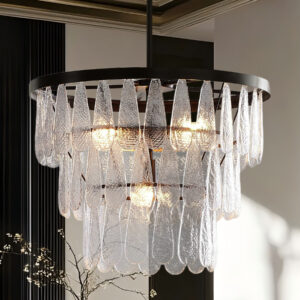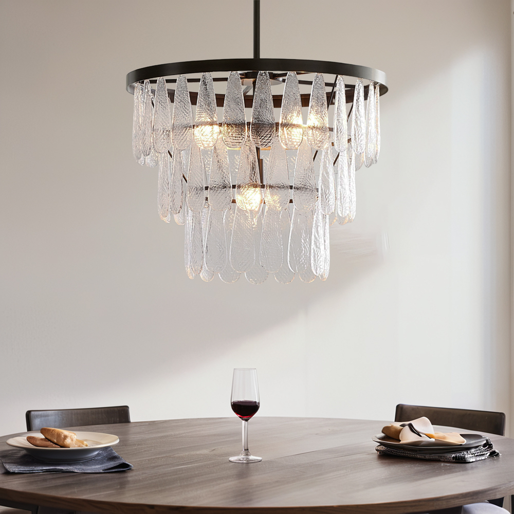 - Crafted with care, the chandelier features a sleek finished ring paired with textured teardrop tiles, creating a rustic yet elegant look that adds character to any room.