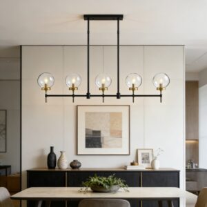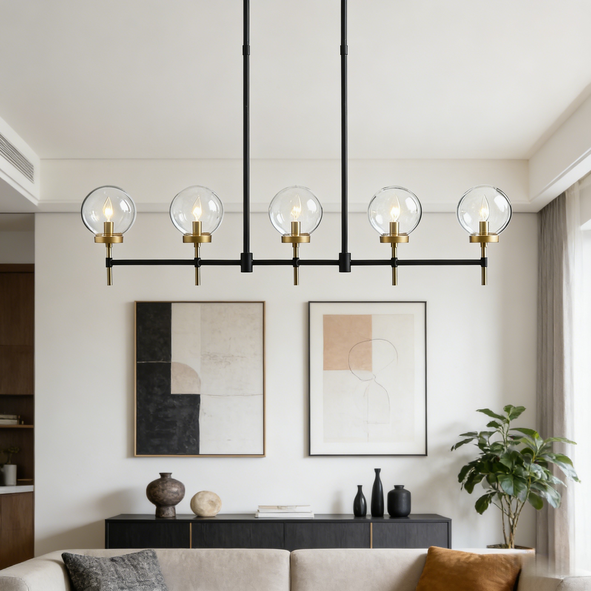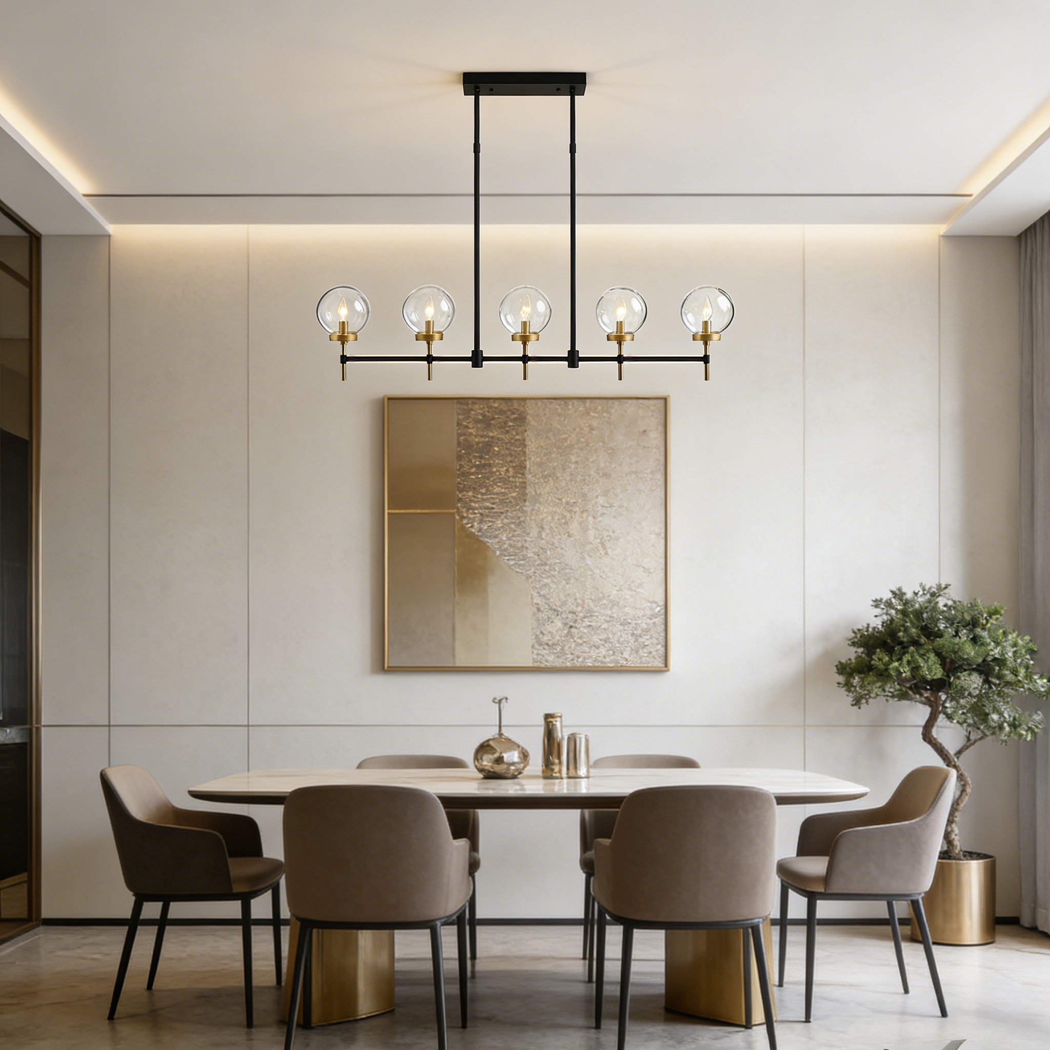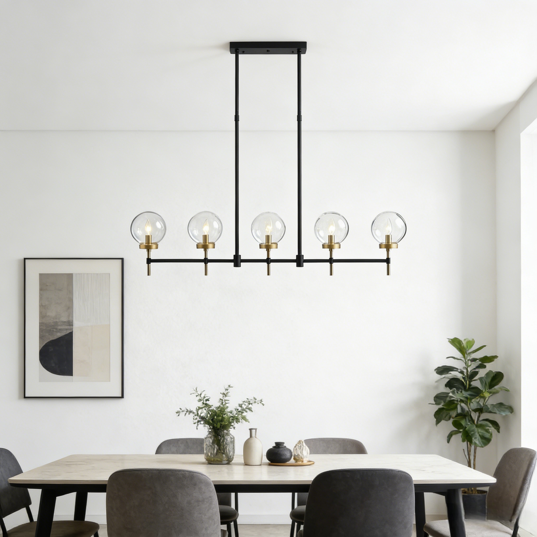 - Upgrade your dining room with this stunning Glass Globe Linear Chandelier Perfect for dining areas, this industrial-inspired globe light fixture combines a timeless spherical silhouette with classic detailing to bring a touch of modern retro charm to your space.