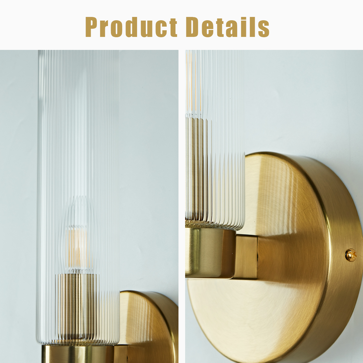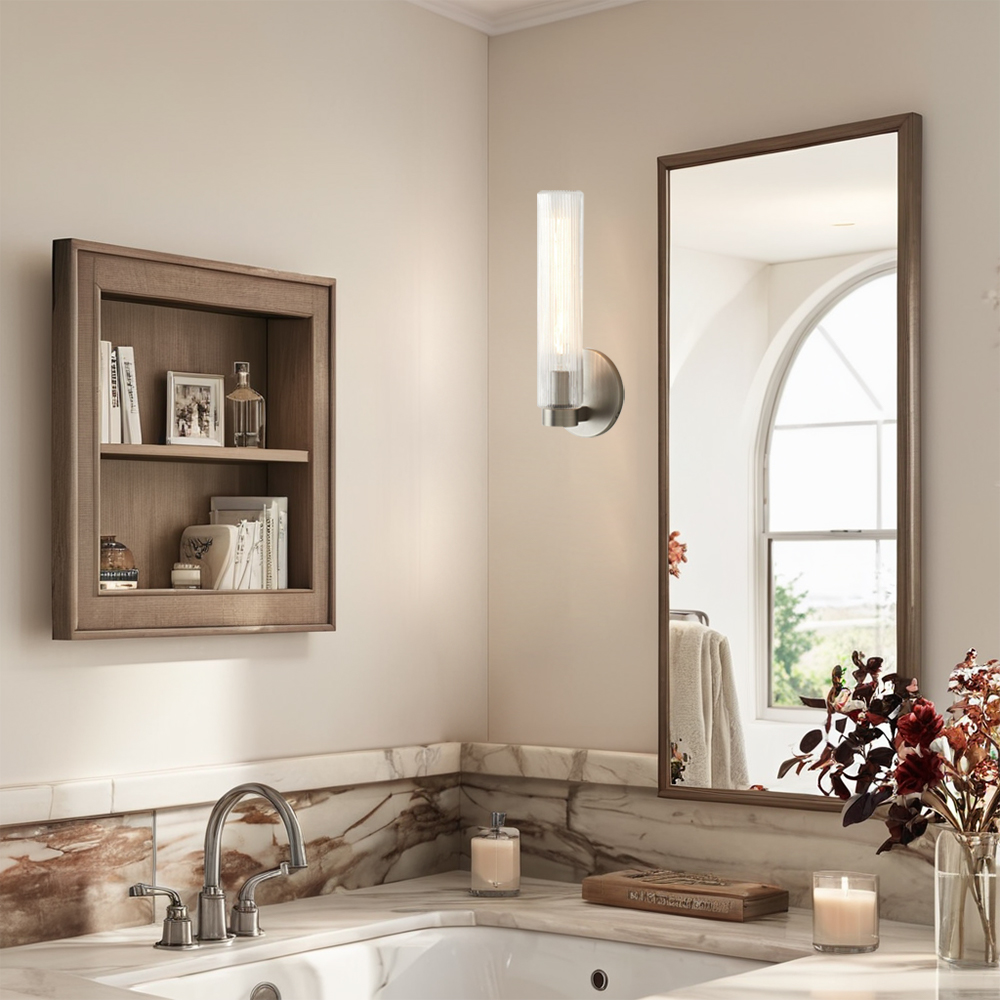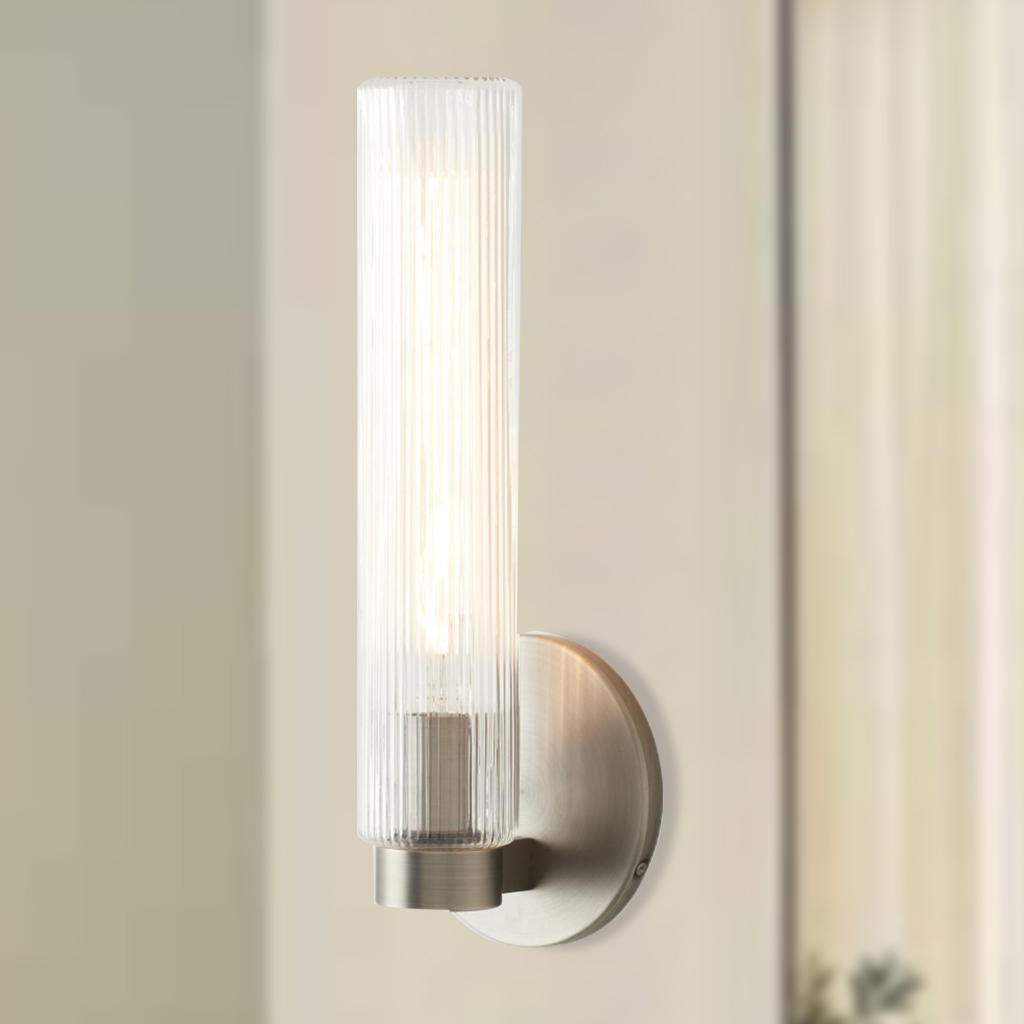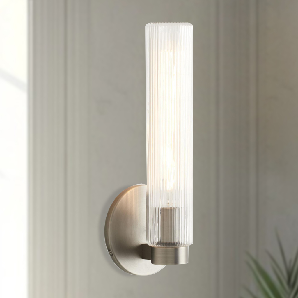 Introducing our stylish Bathroom Sconce, the perfect addition to your bathroom wall lights collection! This elegant Bathroom Wall Sconce features a beautiful fluted glass shade that adds a unique textural touch to your space. The metal canopy comes in a variety of sleek metallic finishes to suit your style preferences.