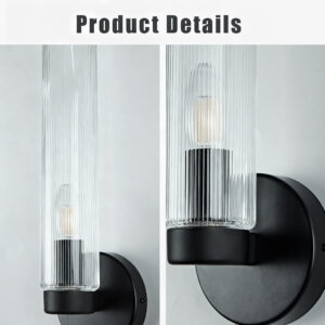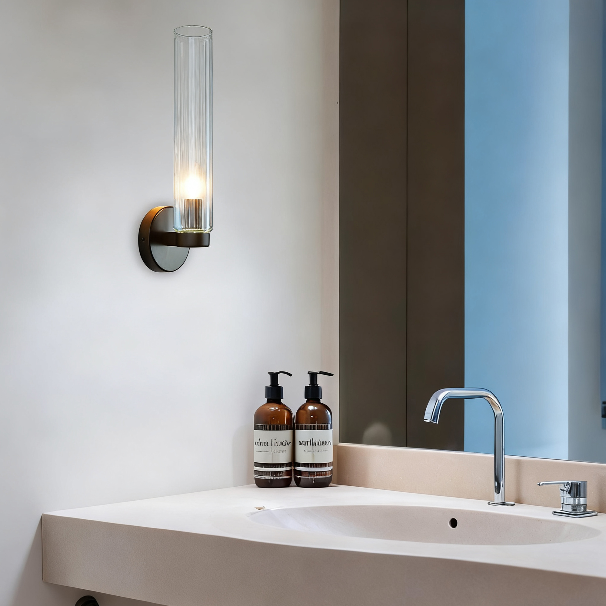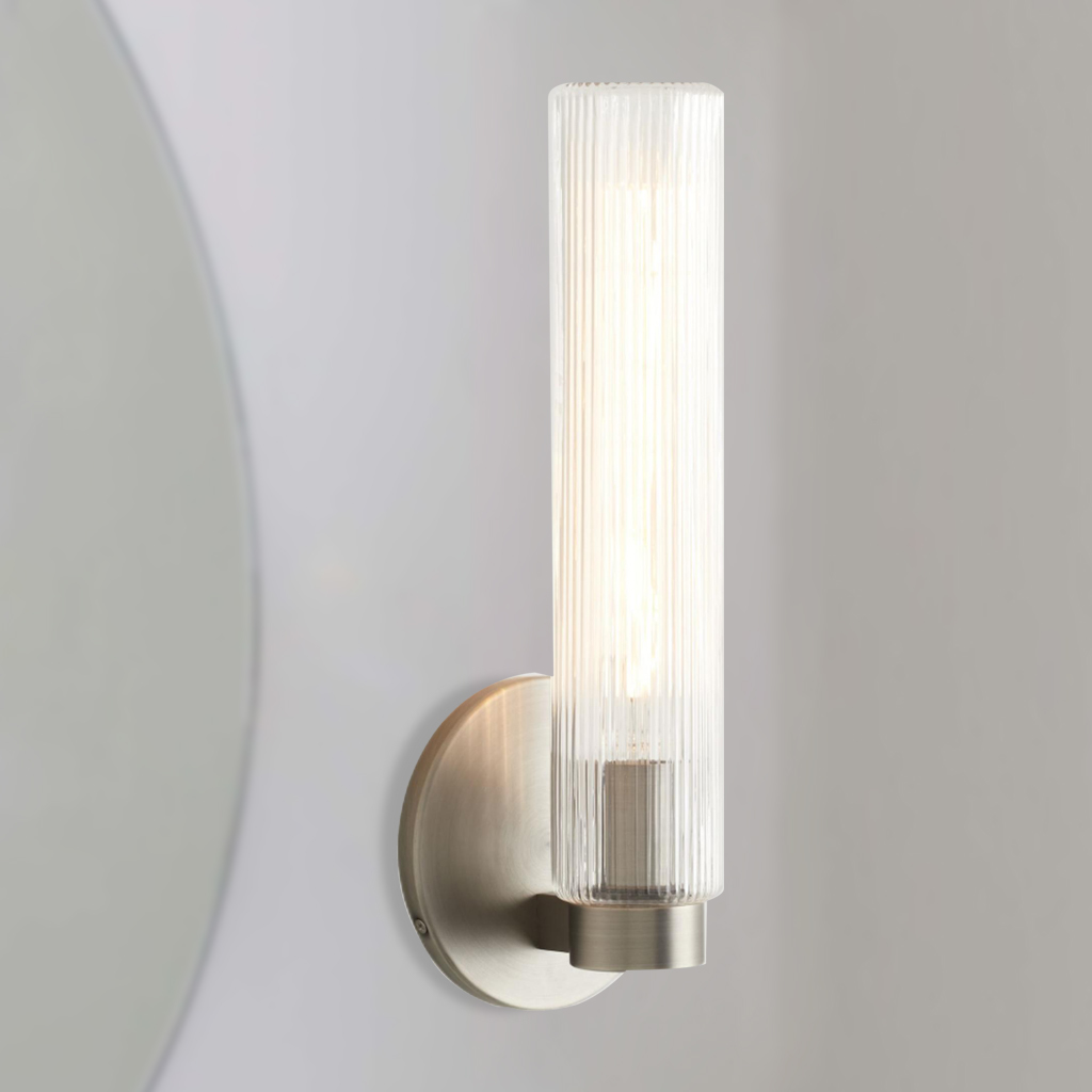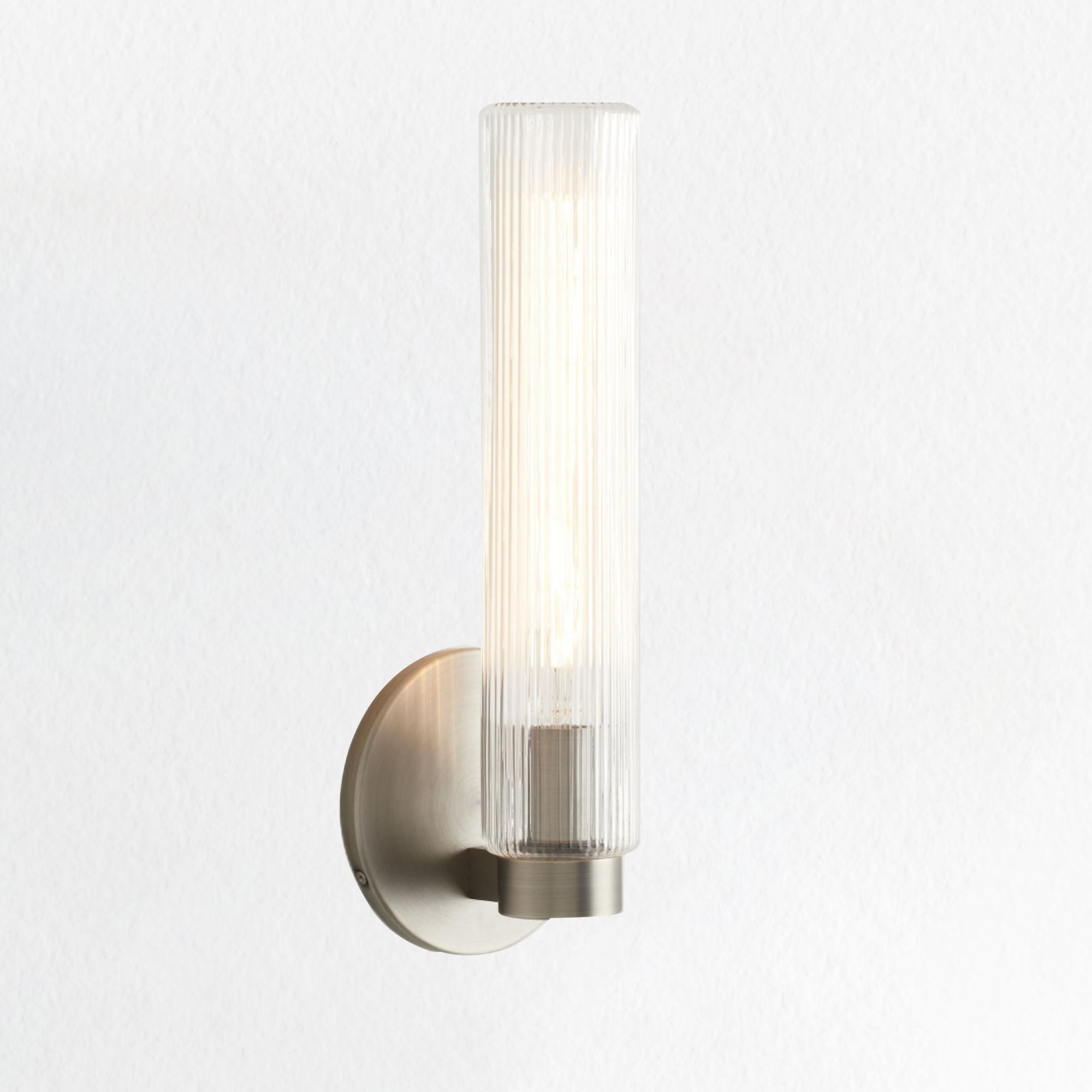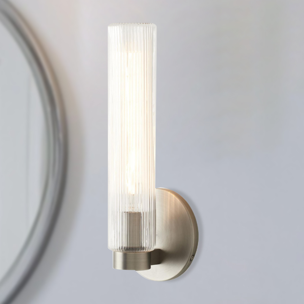 Introducing our stylish Bathroom Sconce, the perfect addition to your bathroom wall lights collection! This elegant Bathroom Wall Sconce features a beautiful fluted glass shade that adds a unique textural touch to your space. The metal canopy comes in a variety of sleek metallic finishes to suit your style preferences.