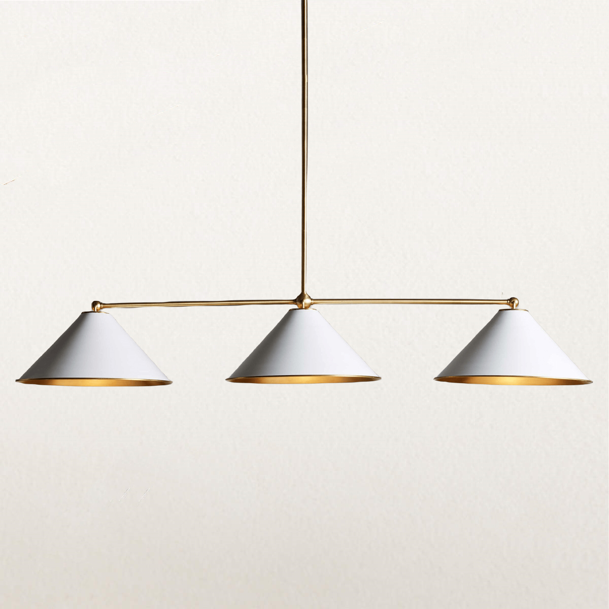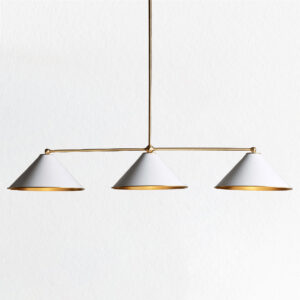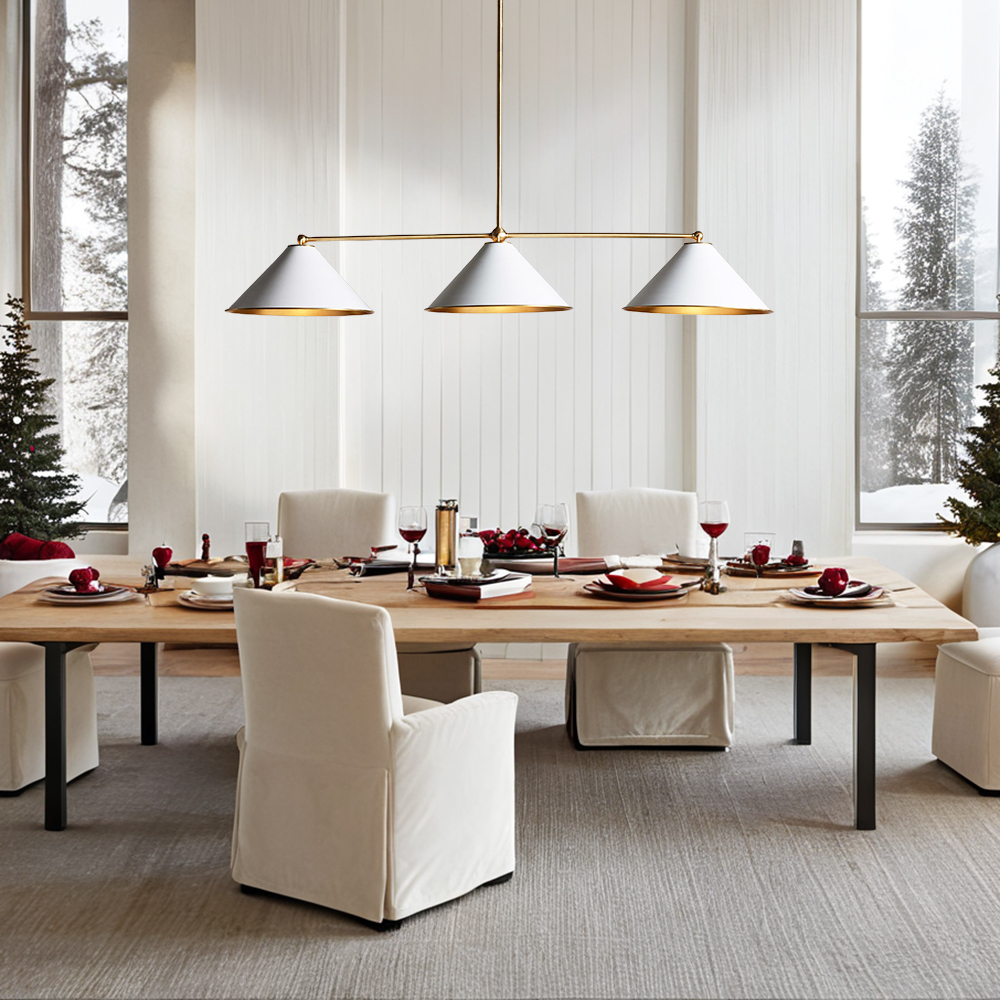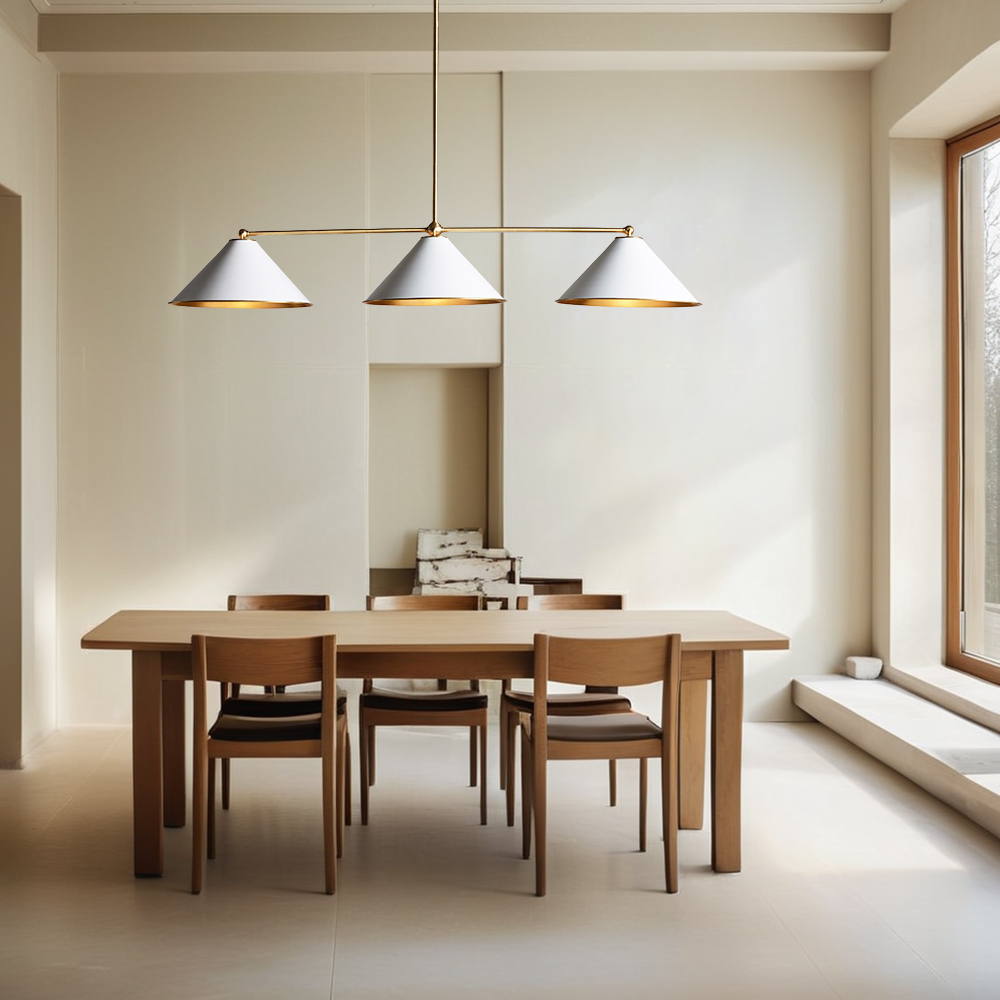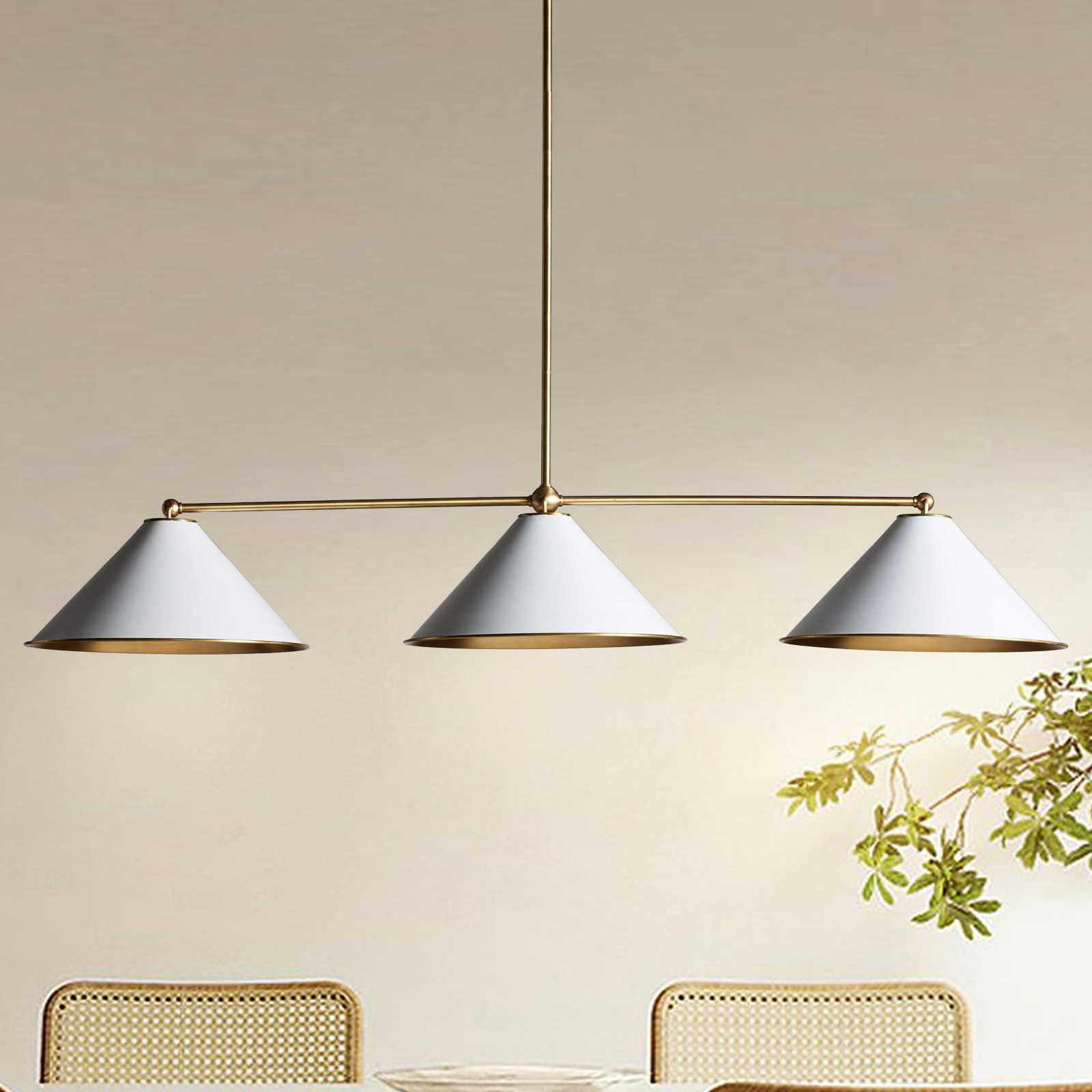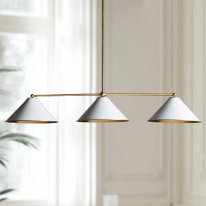 - Featuring a contemporary design with beautiful cone-shaped shades, this dining room chandelier casts a soft, inviting glow, making it ideal for cozy family dinners or lively dinner parties. With its polished brass accents, this chandelier serves as a stylish centerpiece that enhances your dining area light fixtures.