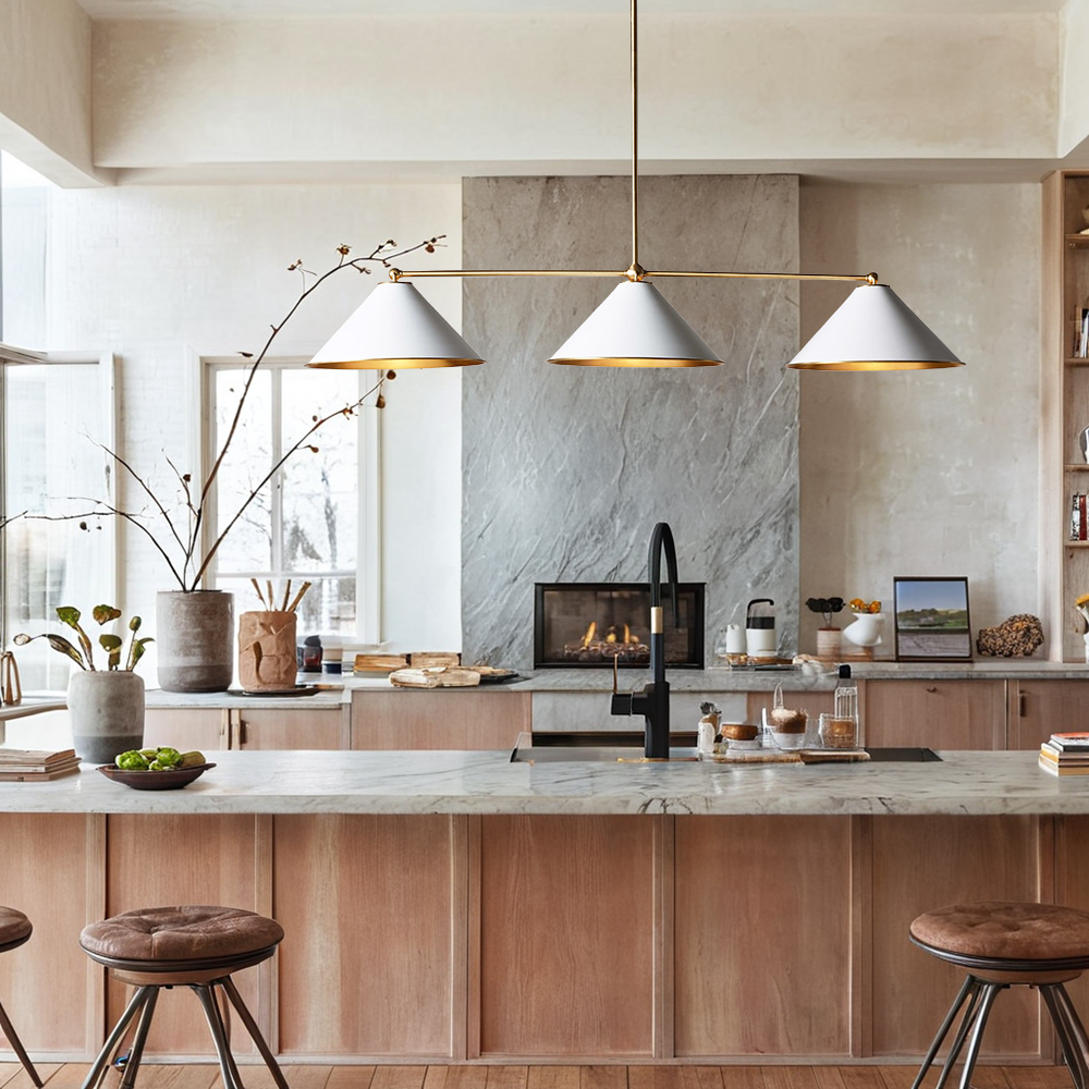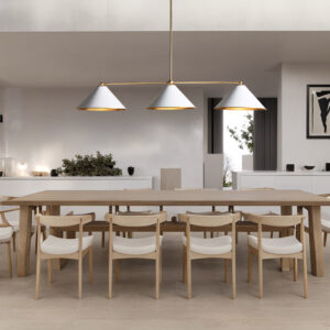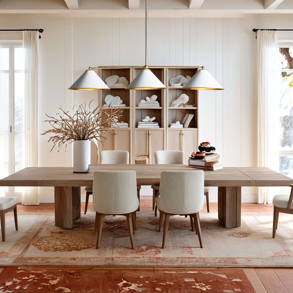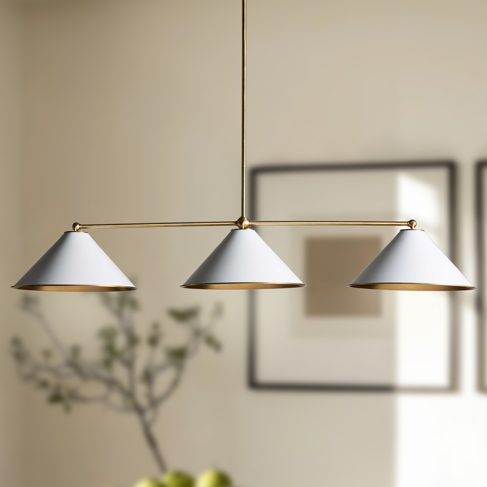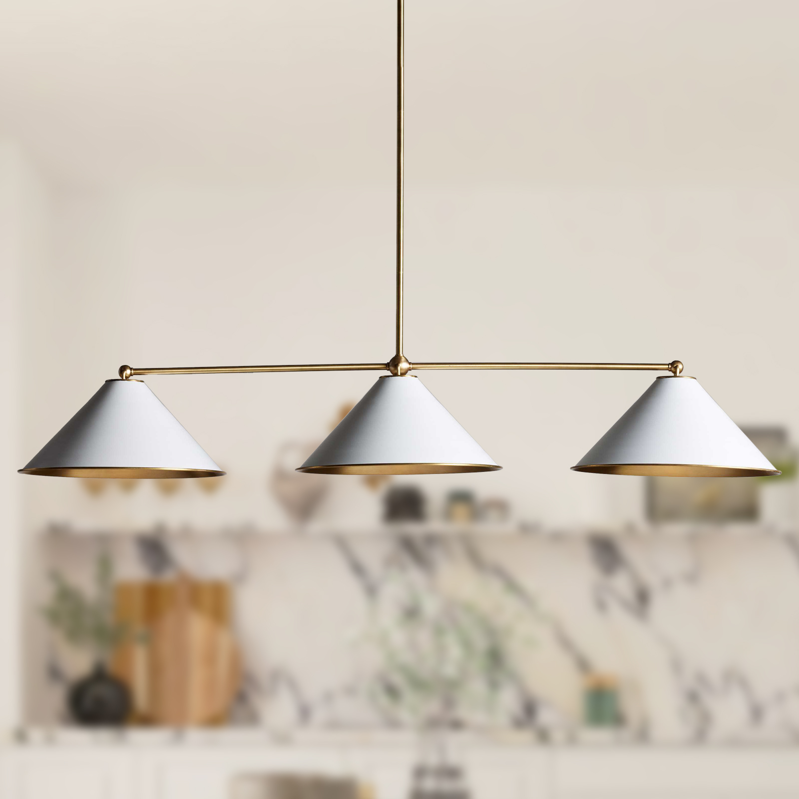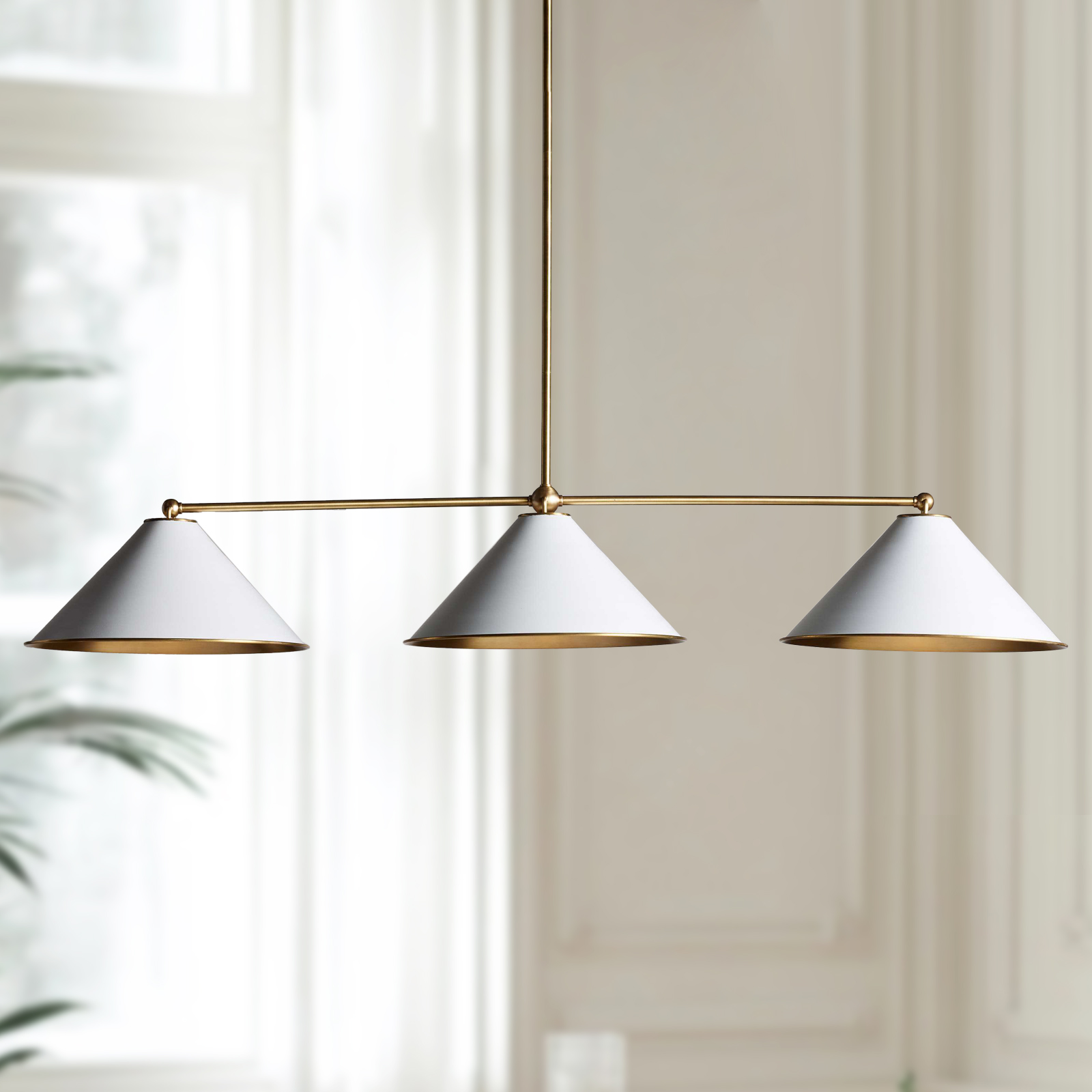 - Featuring a contemporary design with beautiful cone-shaped shades, this dining room chandelier casts a soft, inviting glow, making it ideal for cozy family dinners or lively dinner parties. With its polished brass accents, this chandelier serves as a stylish centerpiece that enhances your dining area light fixtures.