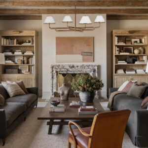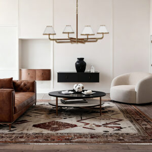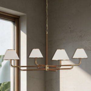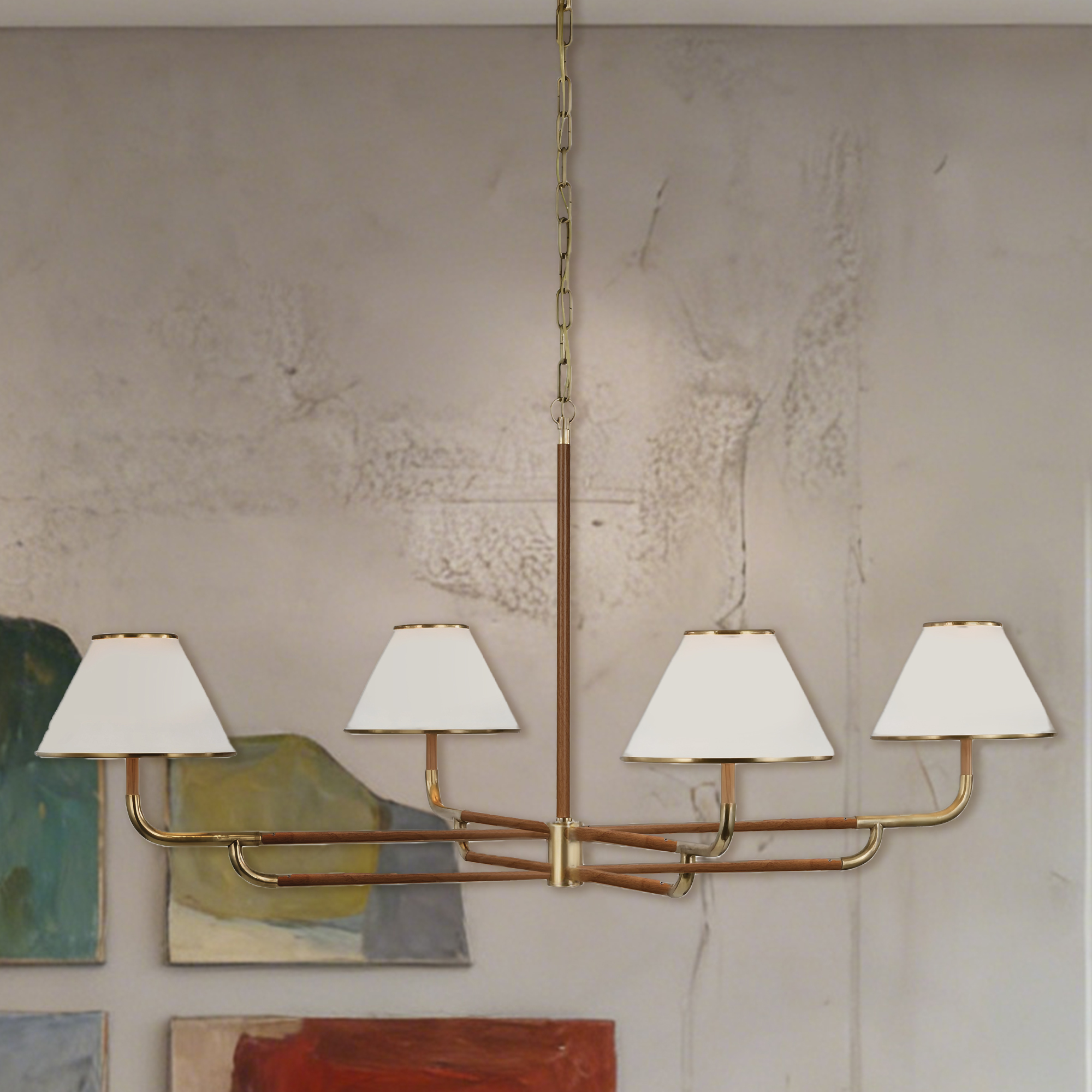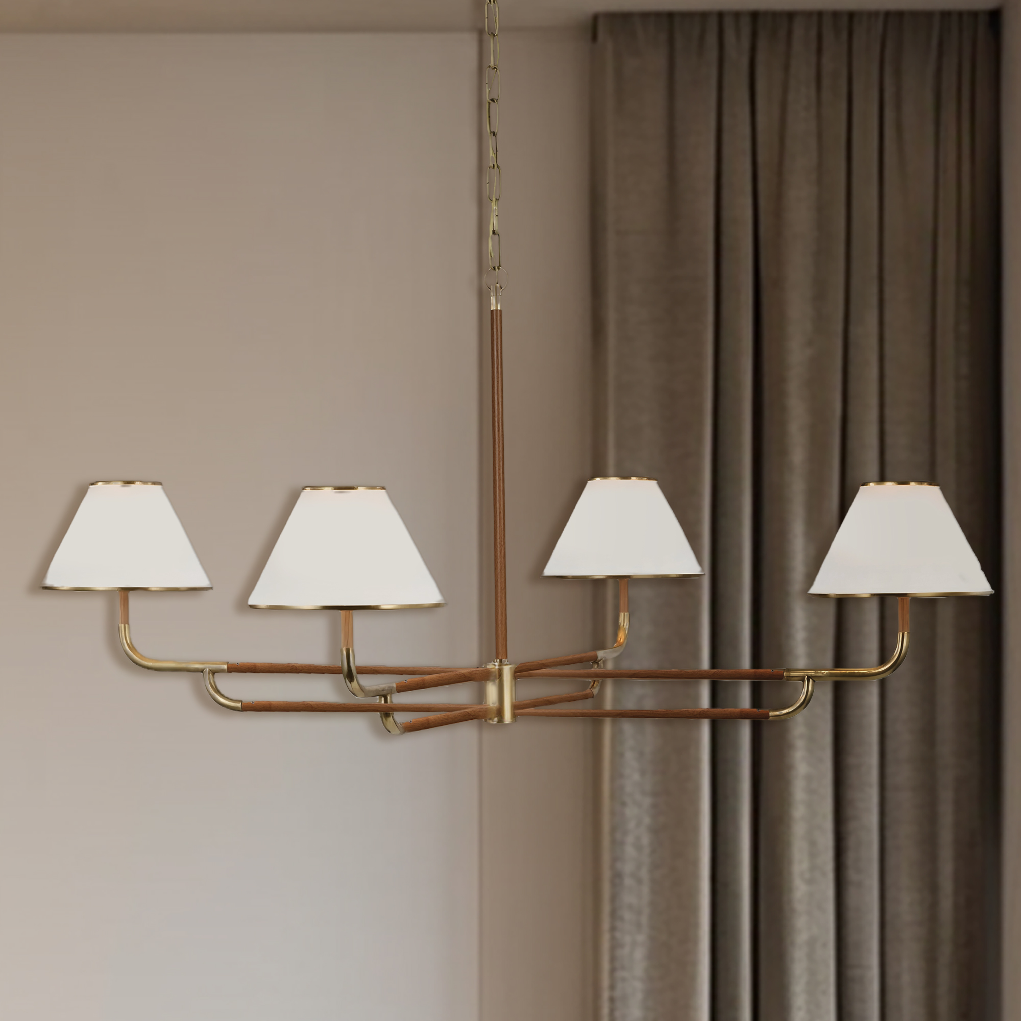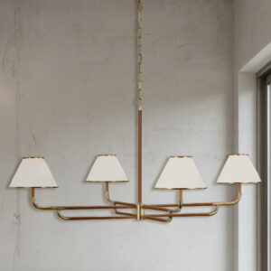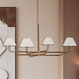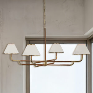 - The Rigby Grande Chandelier showcases a linear design with elegant, contemporary refinement. The chandelier is all accented with unexpected natural oak with brass or ebony with polished nickel. All profiles feature single or multiple trimmed linen shades and will serve as novel conversation pieces for any space in the home.