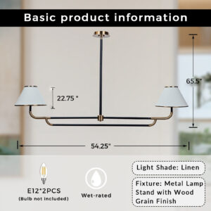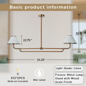 - Crafted with wood arms and white linen shades, this chandelier is built to last. You can adjust the hanging height to suit your space and it comes with multiple metal rods for customization.