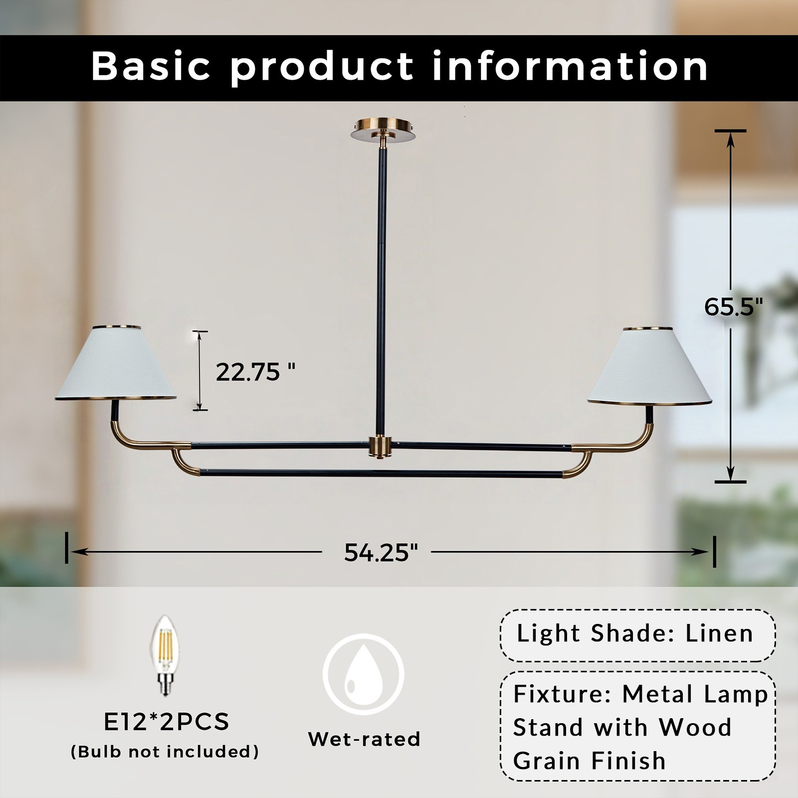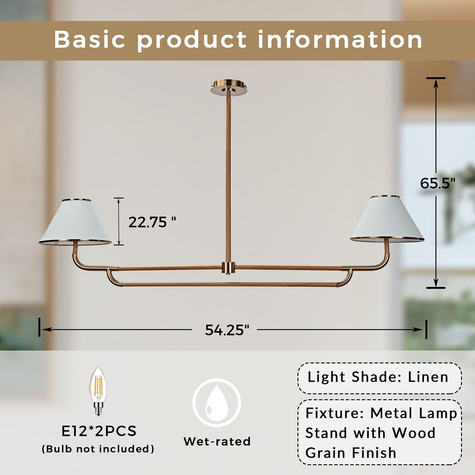- With a modern silhouette, the Rigby Linear Chandelier brings simplicity to your decor with a unique mix of materials. The white linen fabric shades are accented by wood arms that contrast the metal structure in two bold finishes.