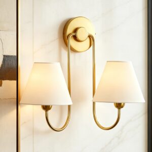 • The brass body gives it a vintage feel, complemented by simple linen shades that allow for versatile styling with any decor.