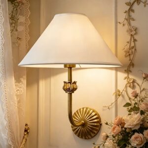 - An ornamental floral bobéche, swooping solid brass arm, and textured canopy reference traditional forms, while a fine linen shade brings a layer of soft light to your entryway, hallway, dining room, hearth, or bedroom.