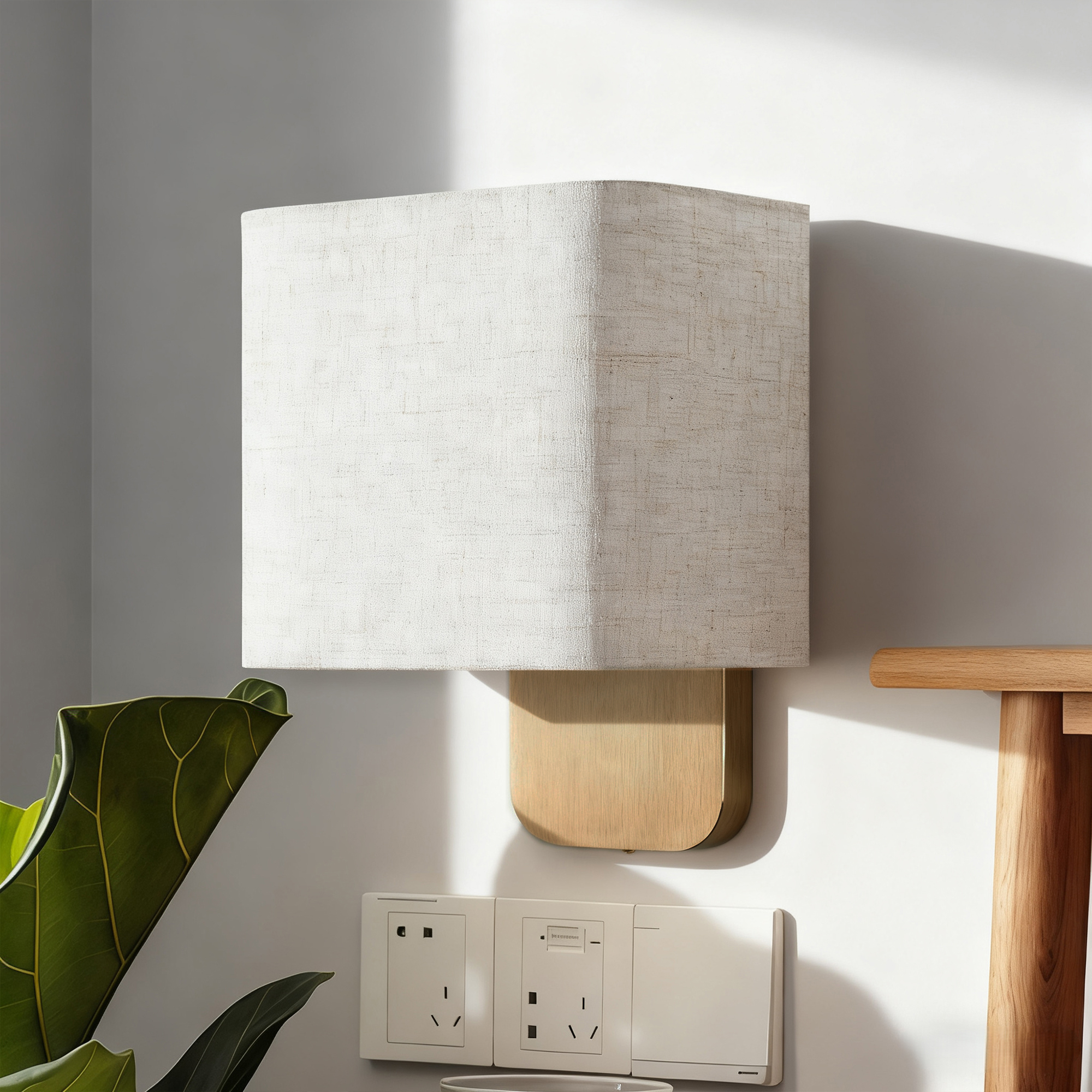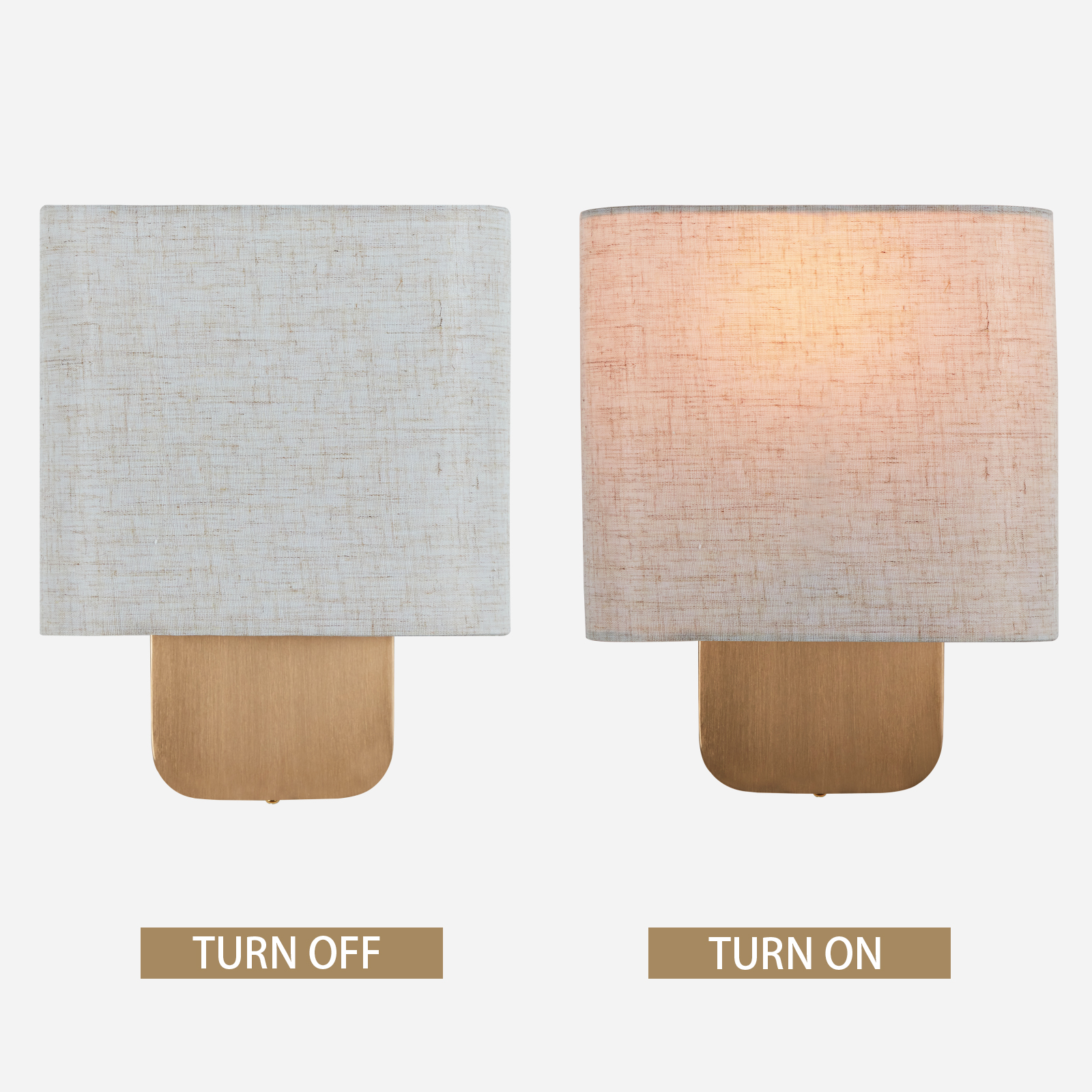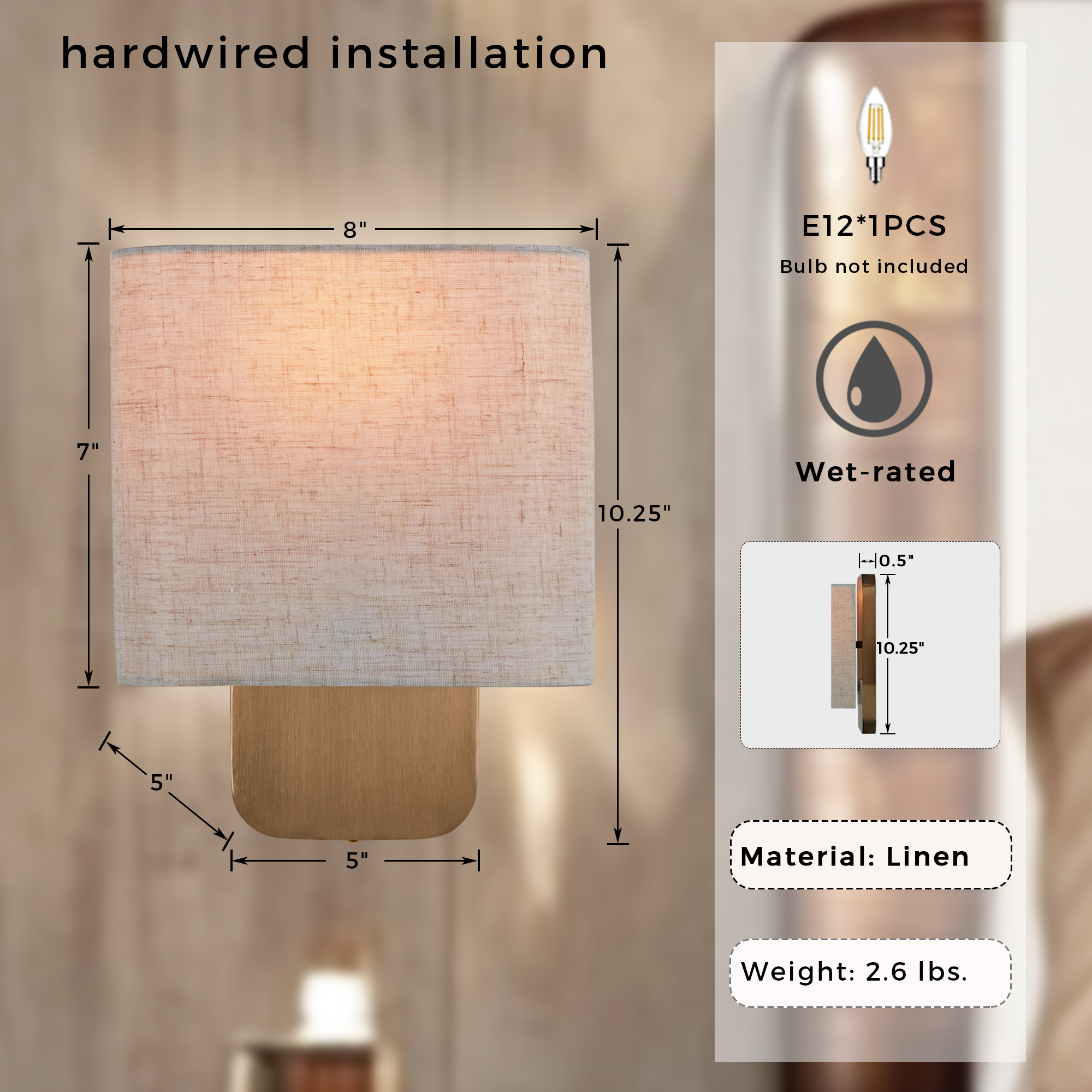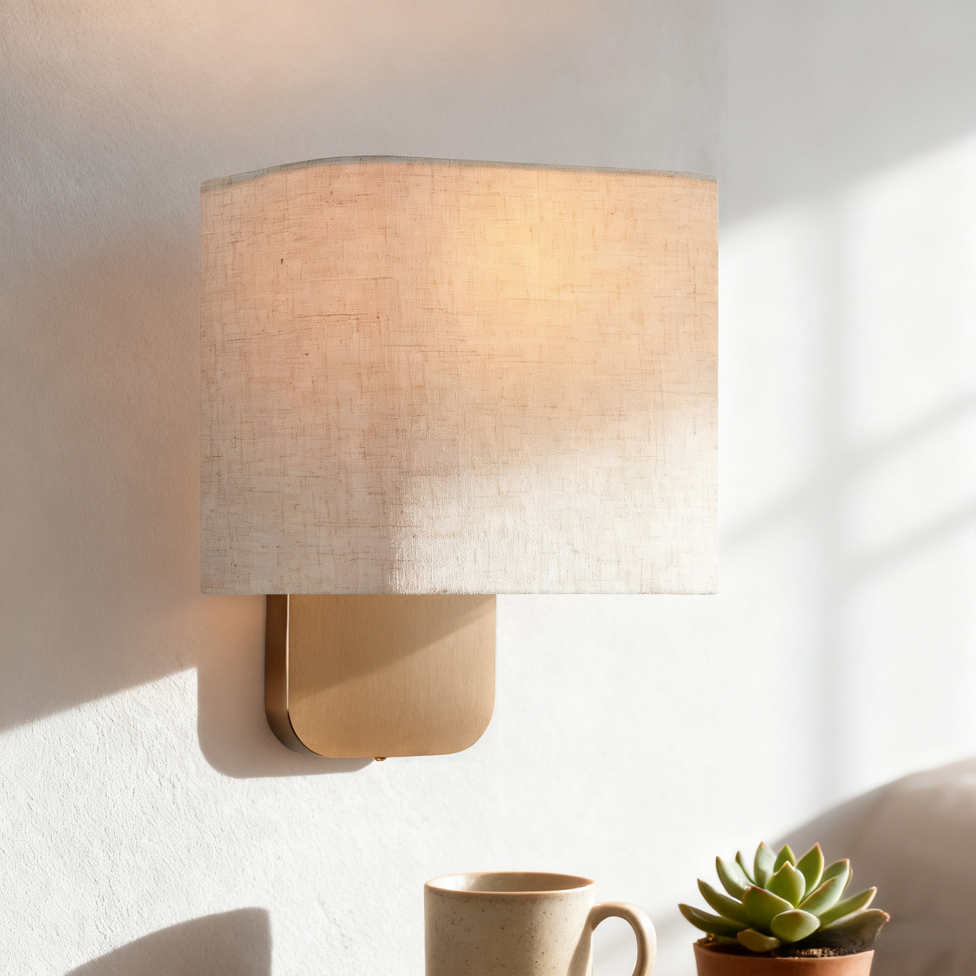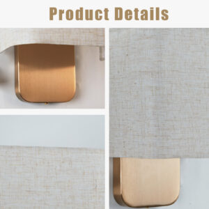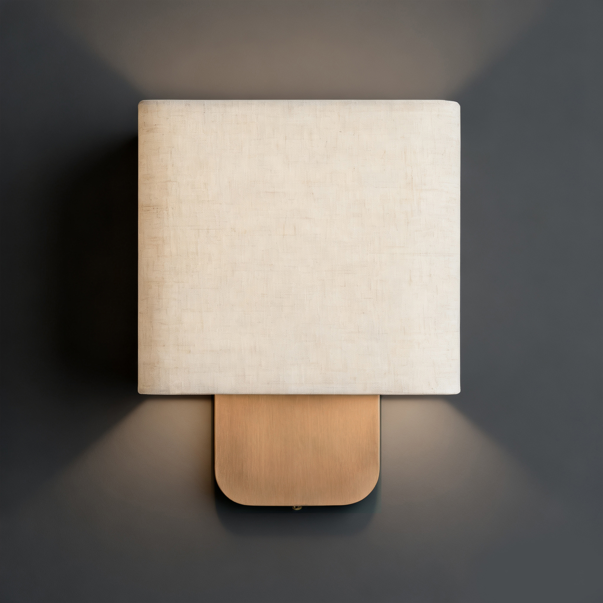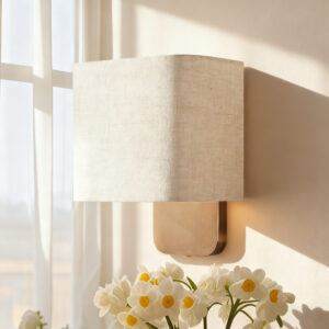 - The natural linen shade brings warmth to the sleek metal canopy.