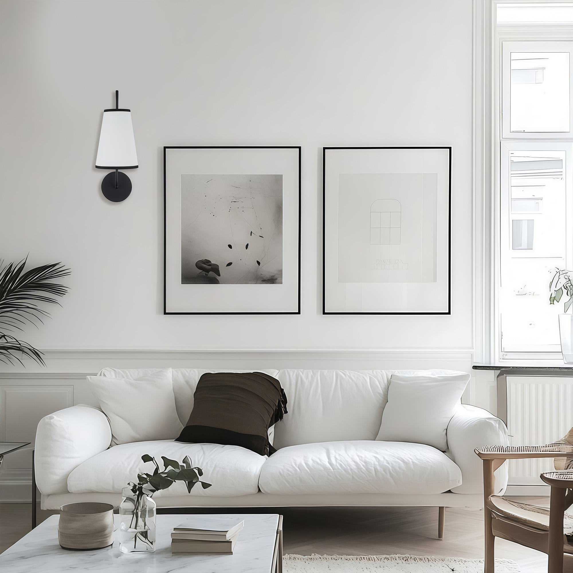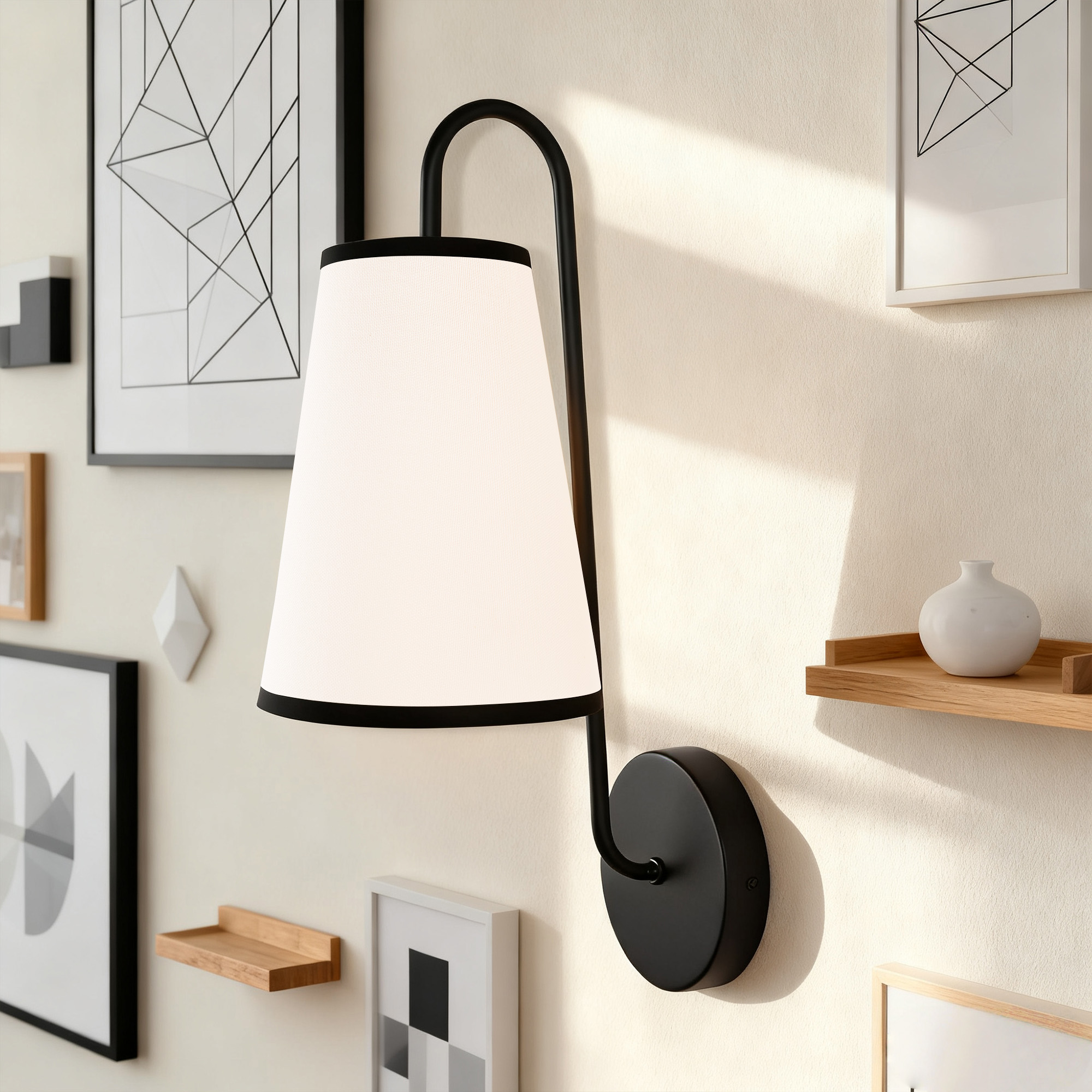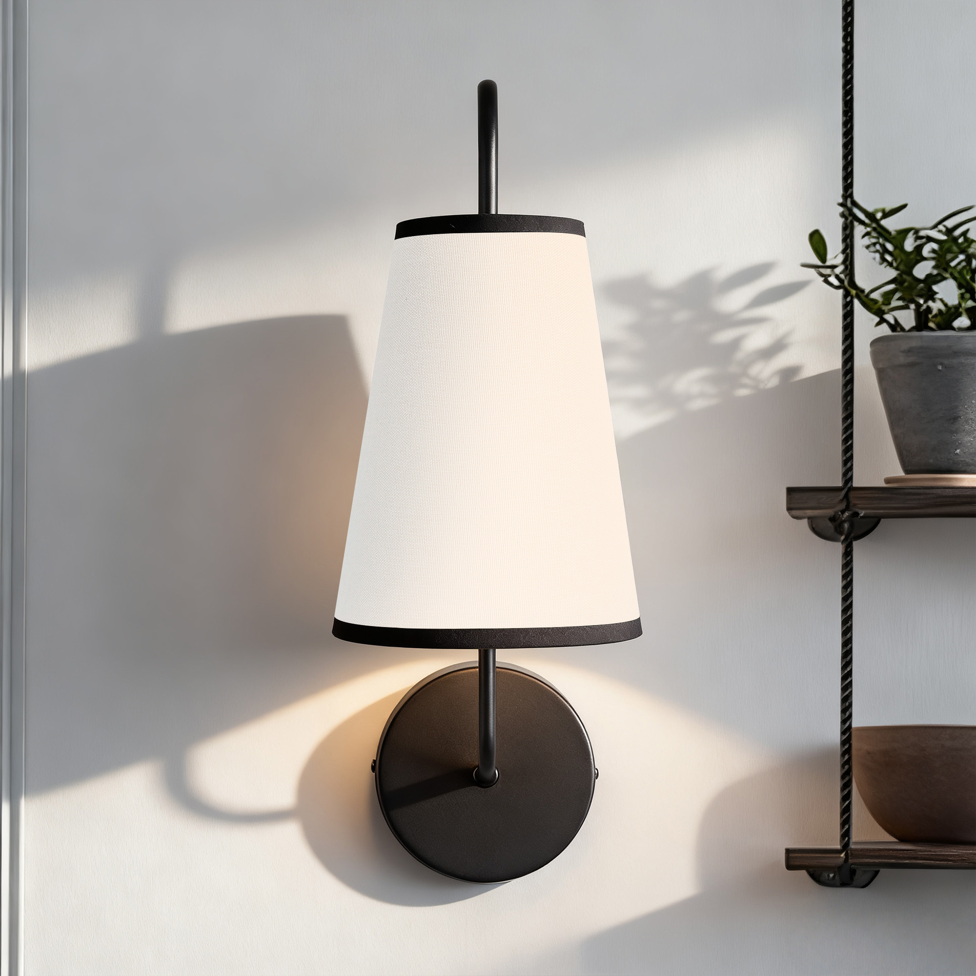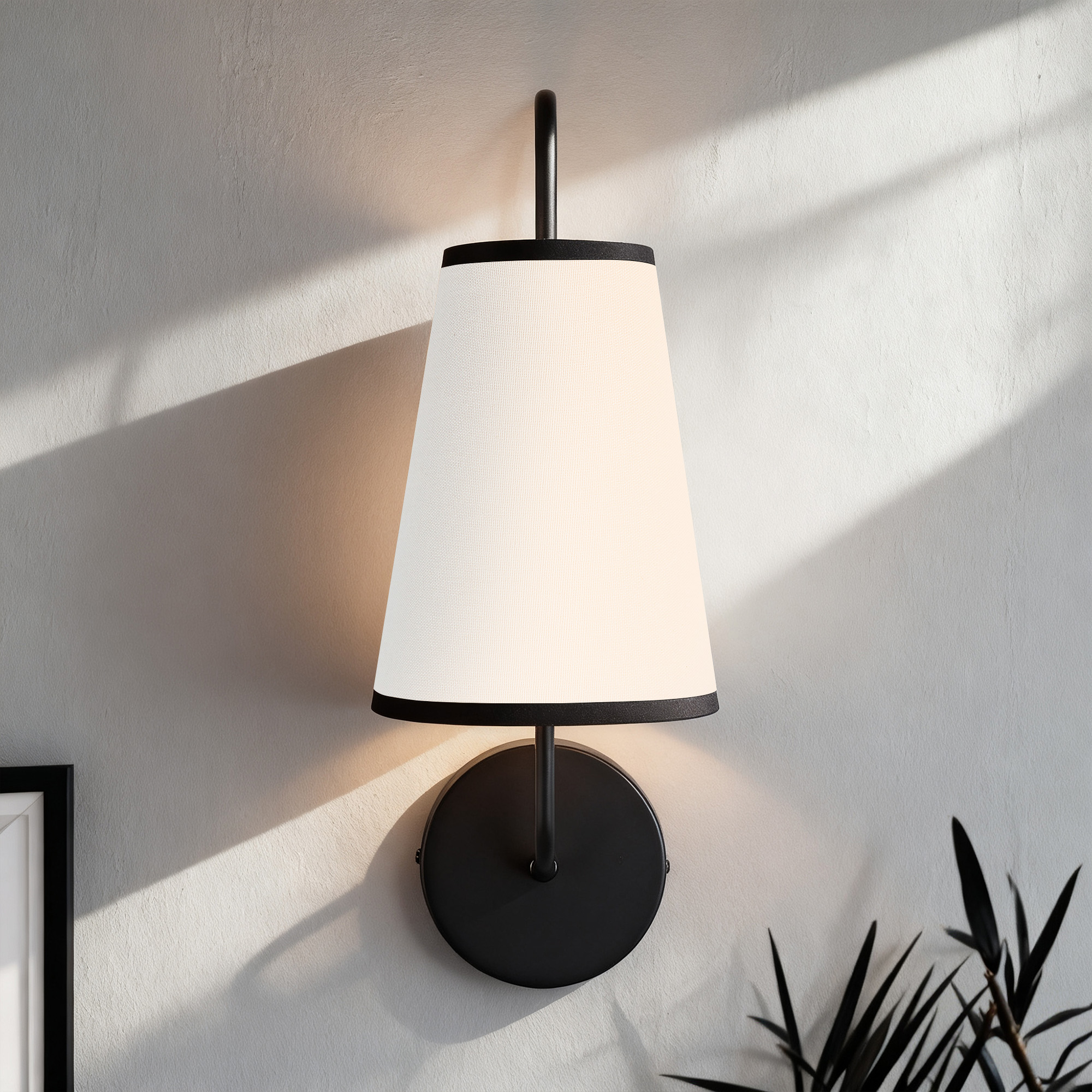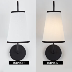 - Brighten up your space with our Elegant Minimalist Sconce, the perfect addition to any room! This stylish wall light features a subtly curved arm and a sleek design that effortlessly complements modern décor. With its narrow white linen shade, this sconce lamp provides a warm glow that creates a cozy atmosphere, making it ideal for bedroom wall light sconces or any wall lights for bedroom.