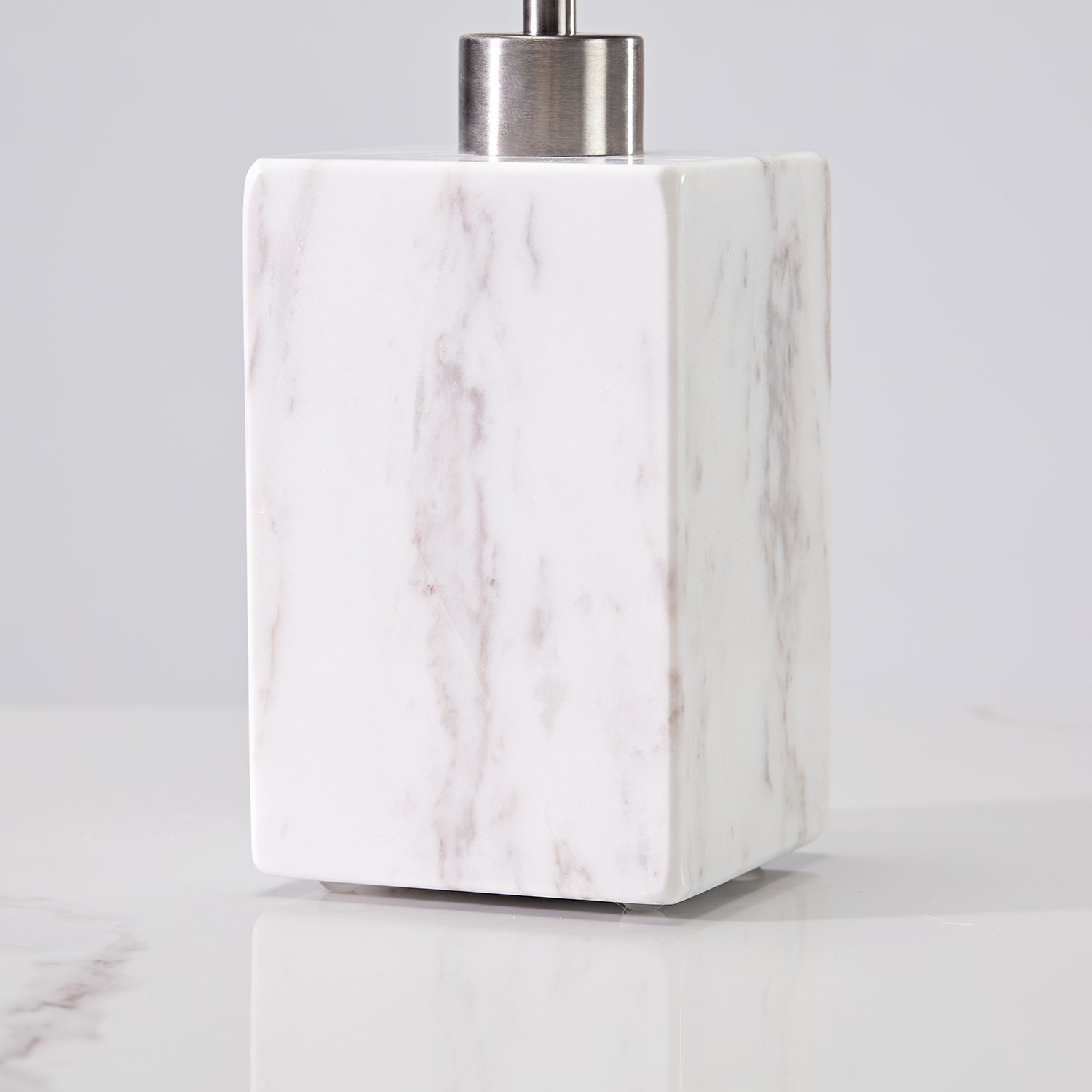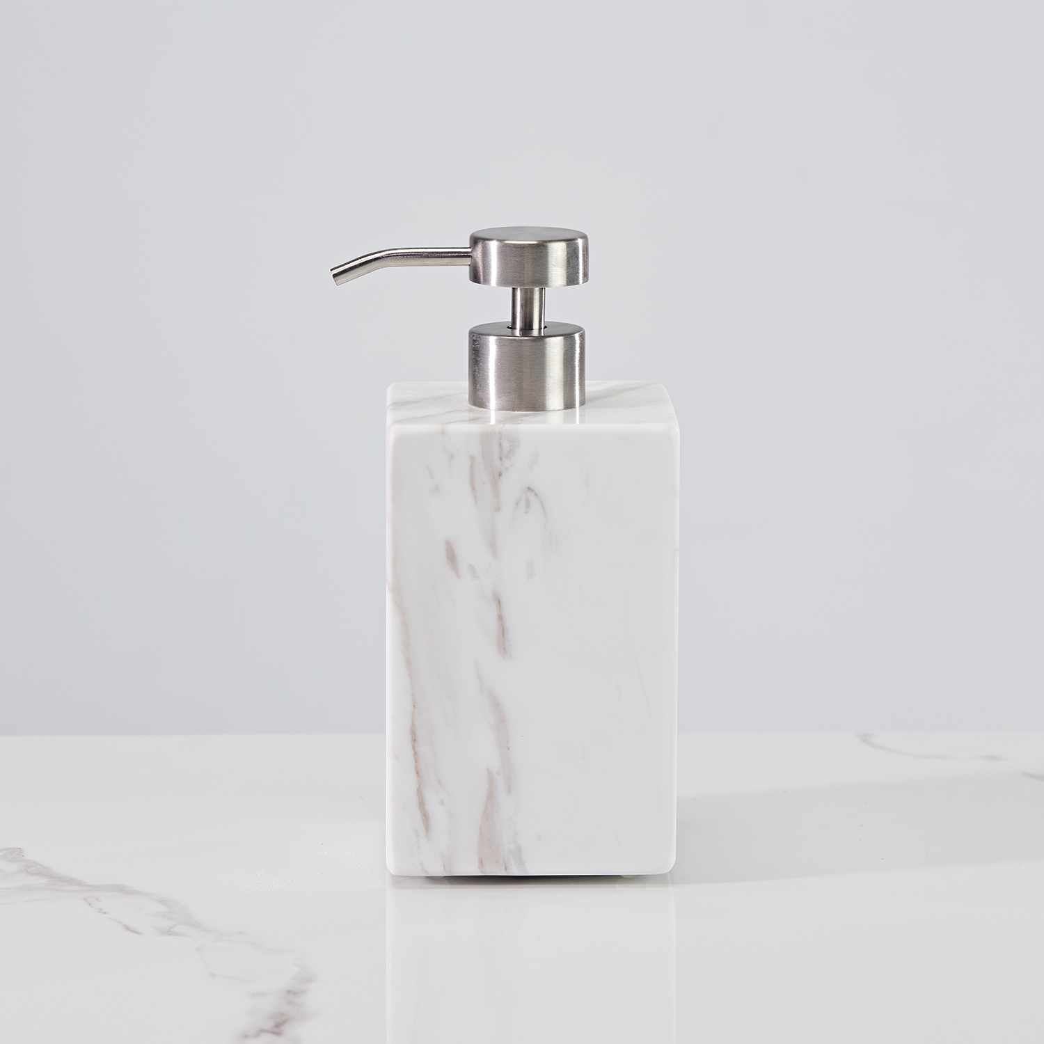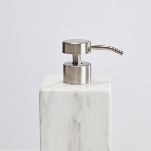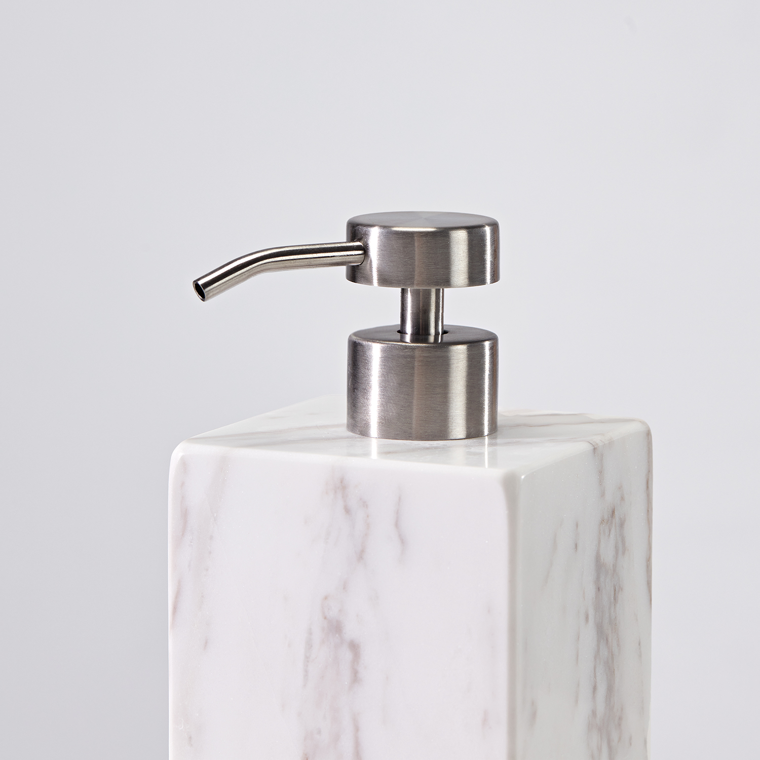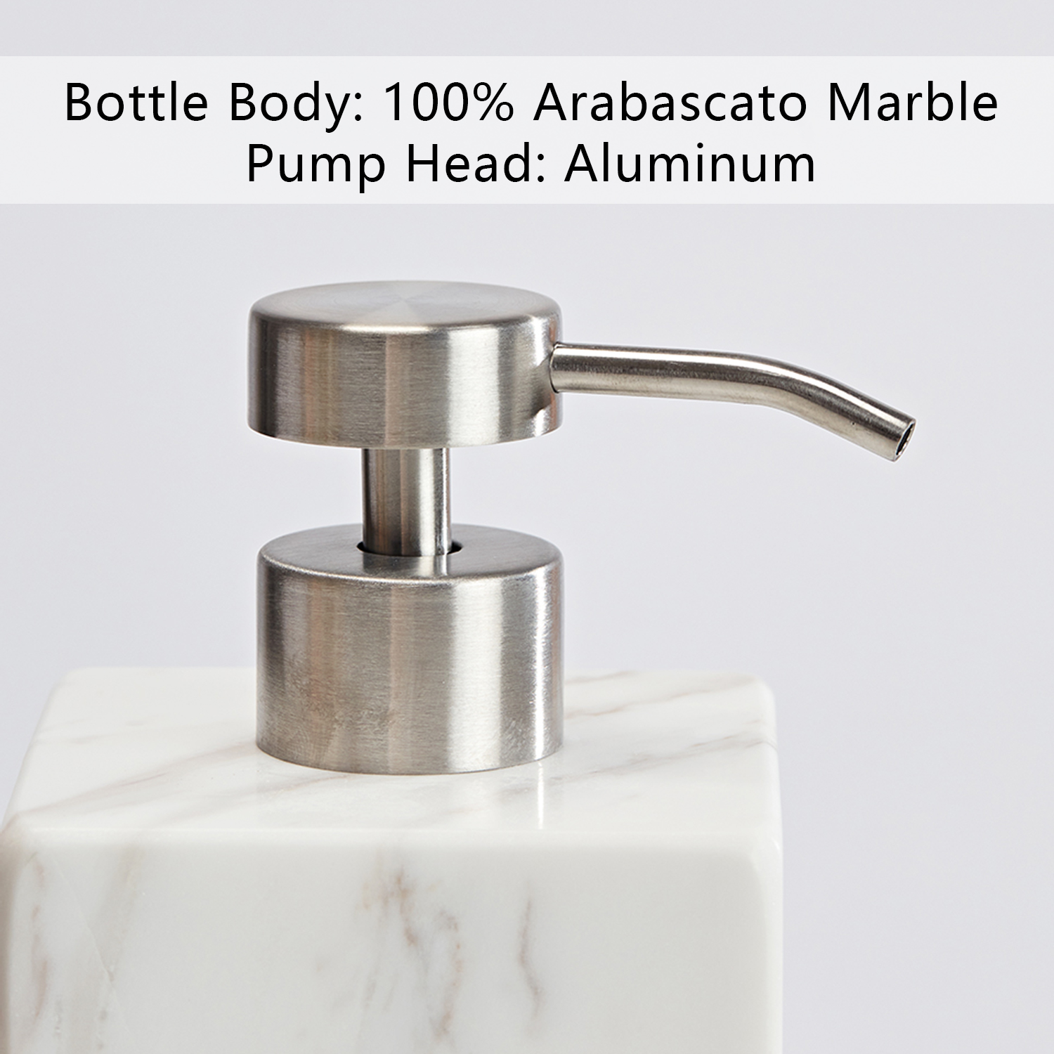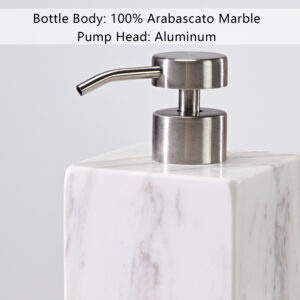 • Material: Crafted from Arabascato marble, known for its strength and distinctive dusty grey veining, complemented by a sleek stainless steel pump.