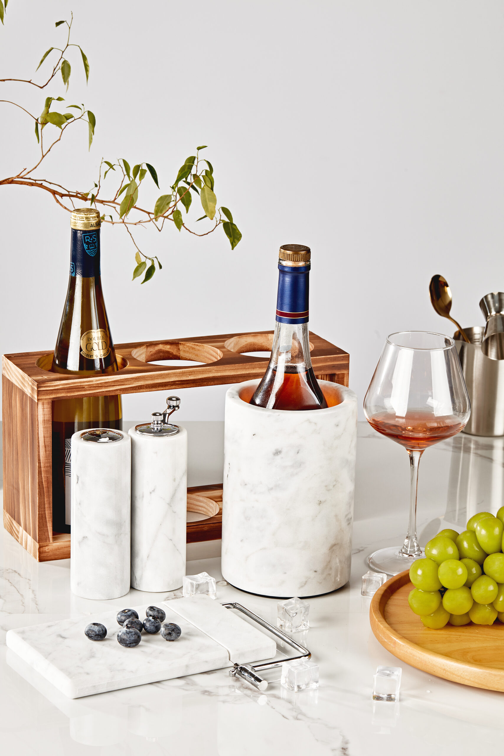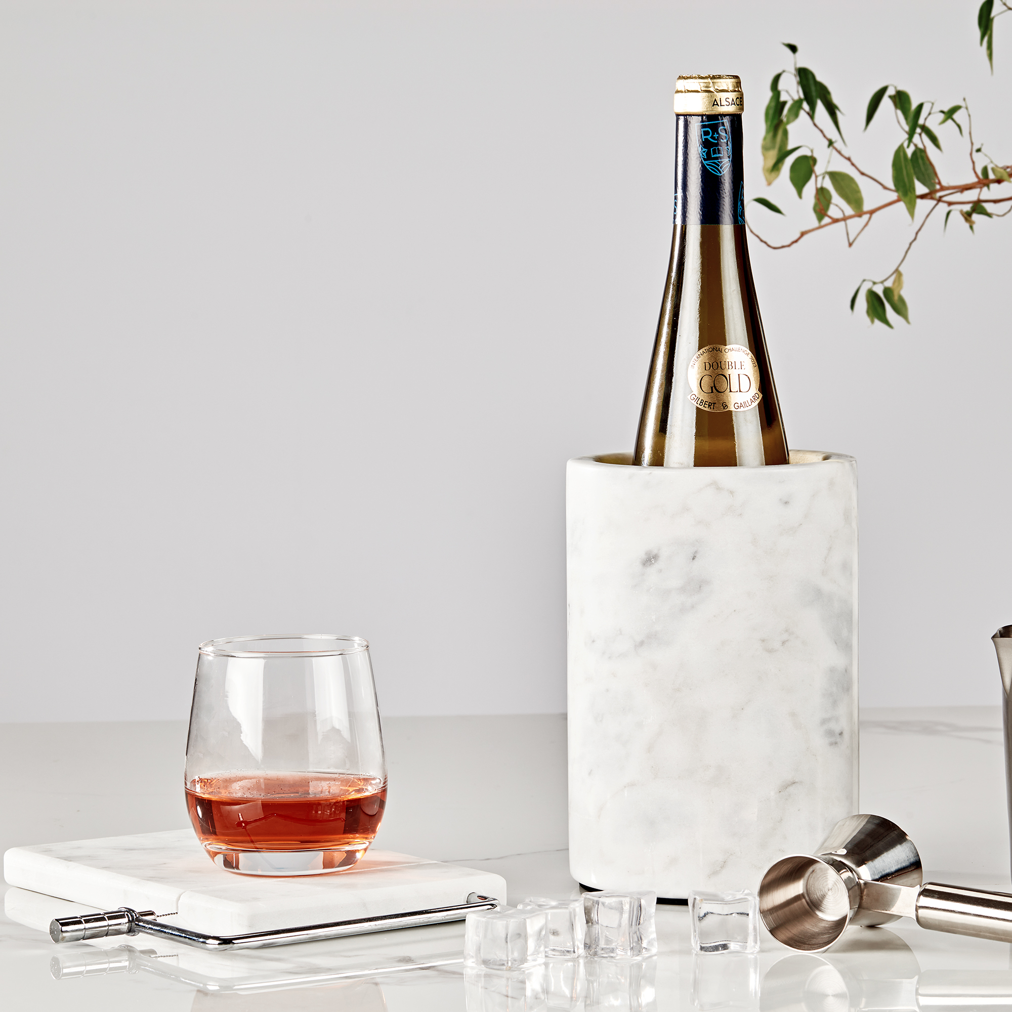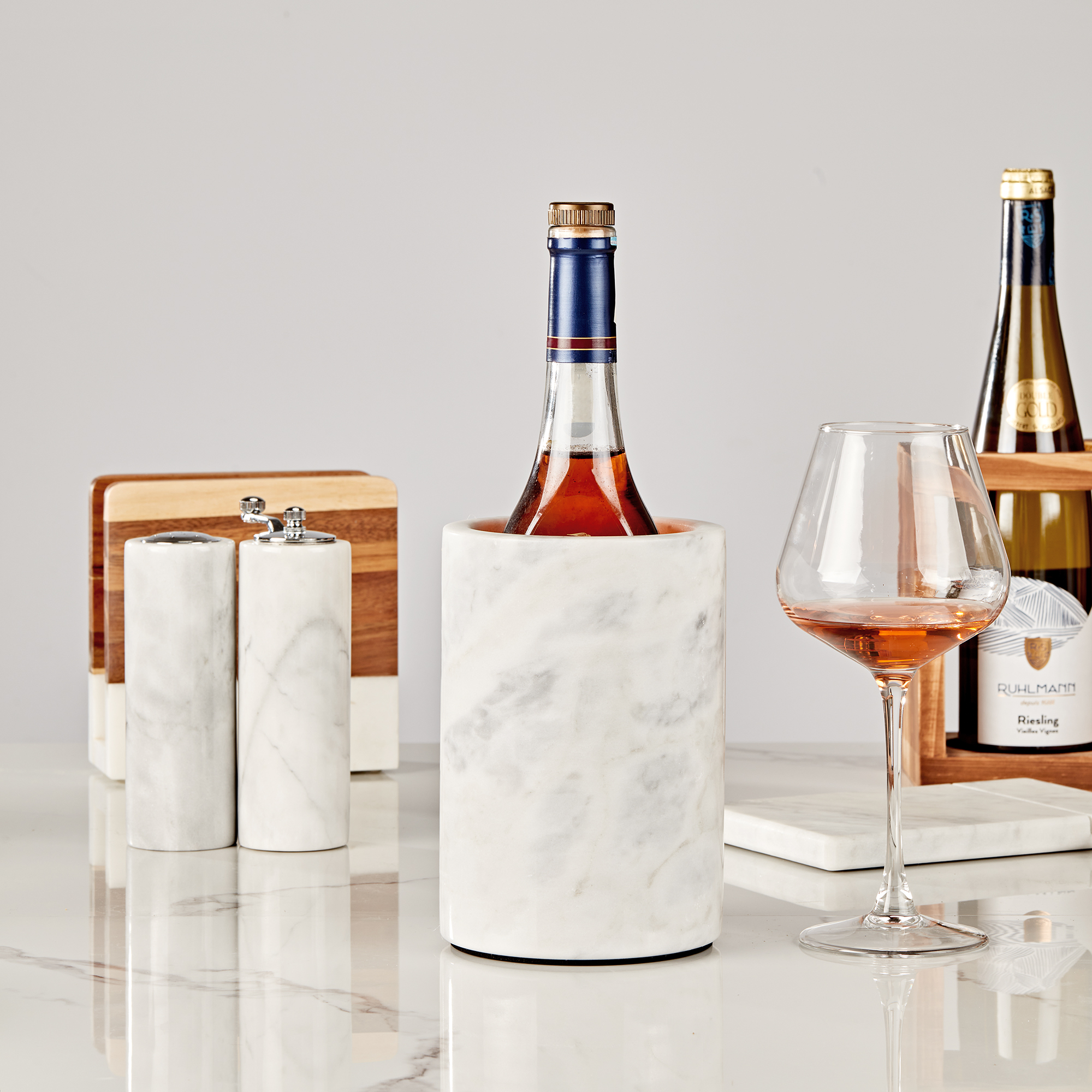 - This stylish piece, reminiscent of the marble wine cooler, features cool white marble with unique grey veining to chill your favorite wines in classic style.