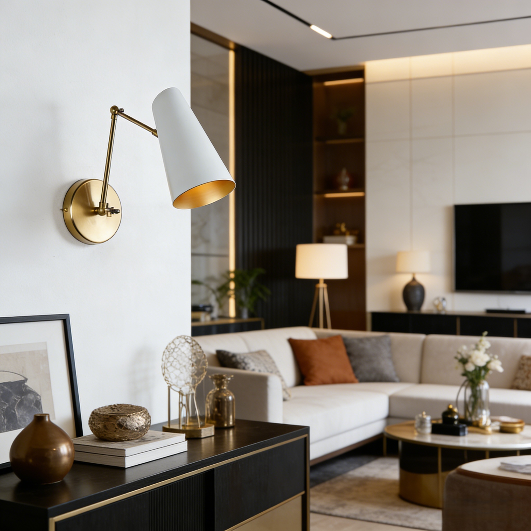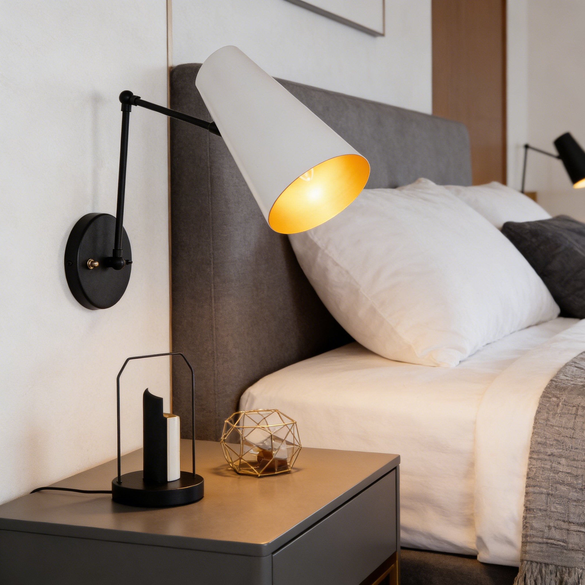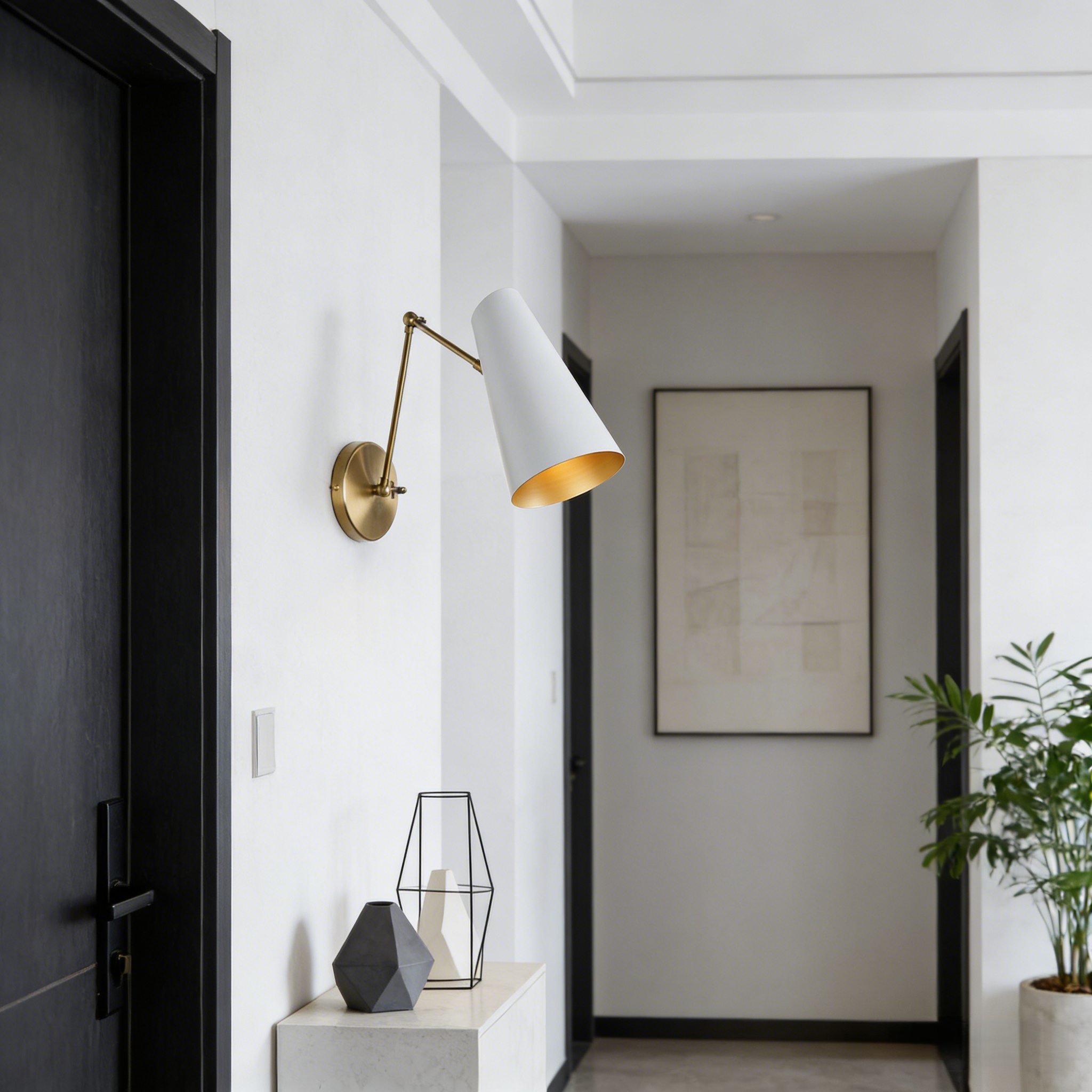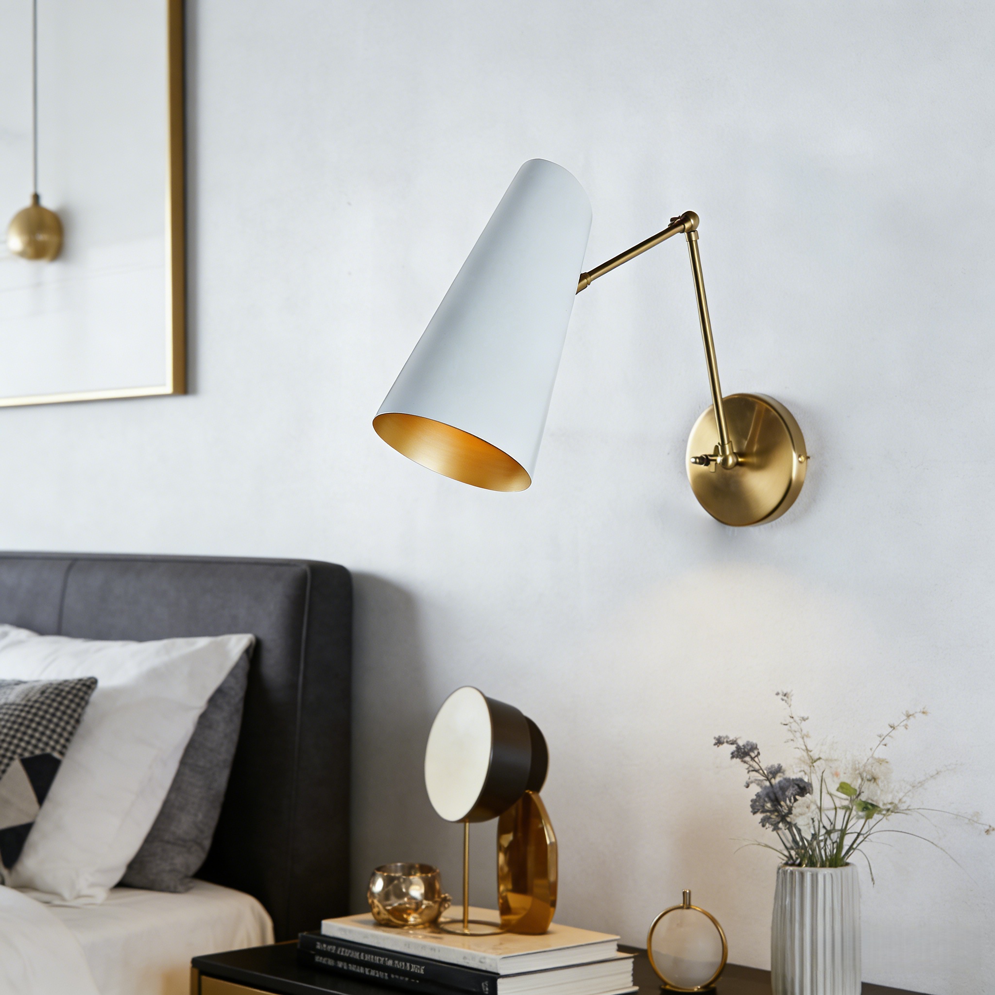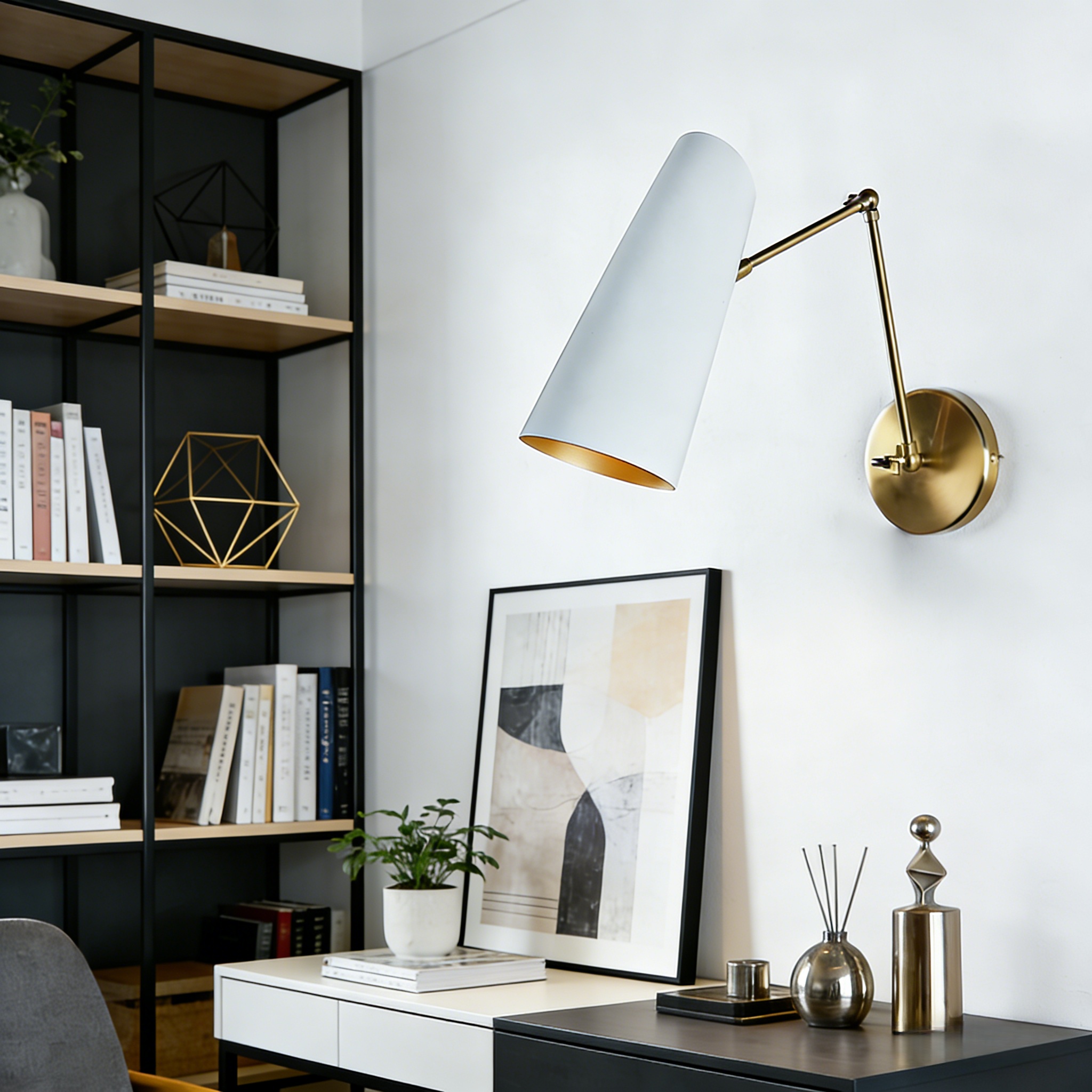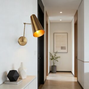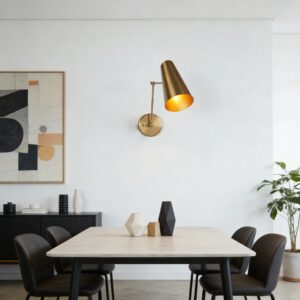 - The Mid-Century Modern Metal Double Sconce is a chic lighting fixture with two adjustable articulating shades crafted with brushed brass and a perforated diffuser, inspired by mid-century styles.