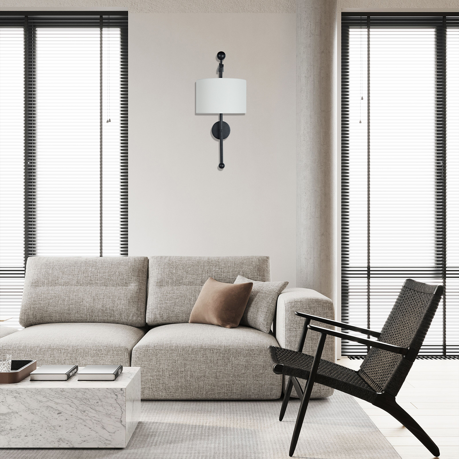 • A fresh take on traditional design with a linen shade for modern proportions.