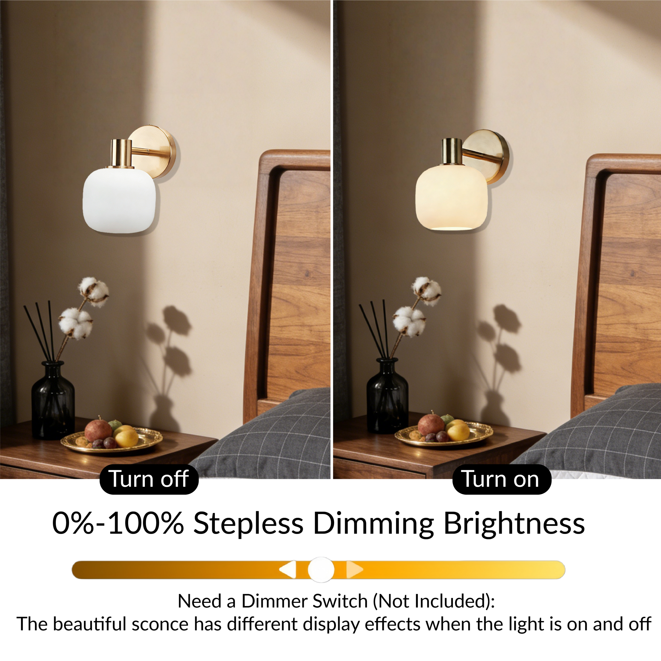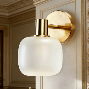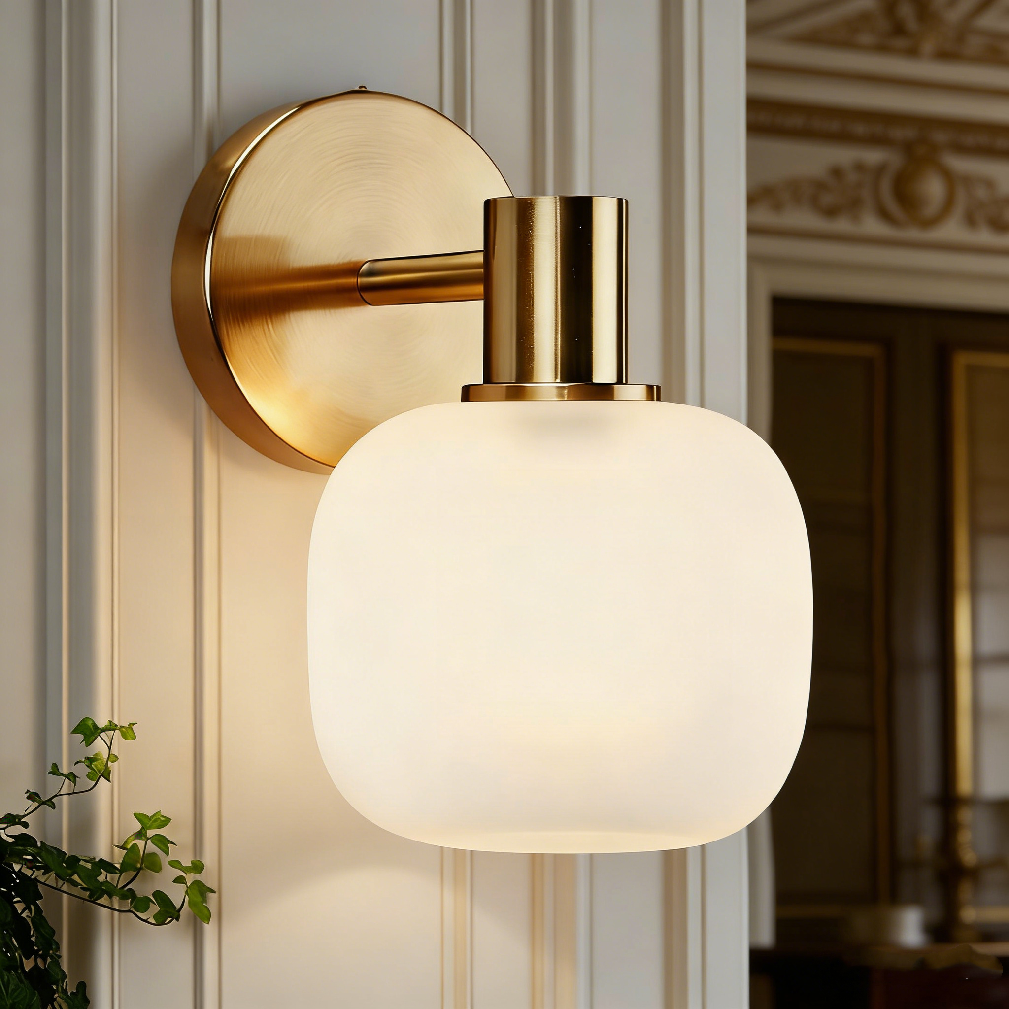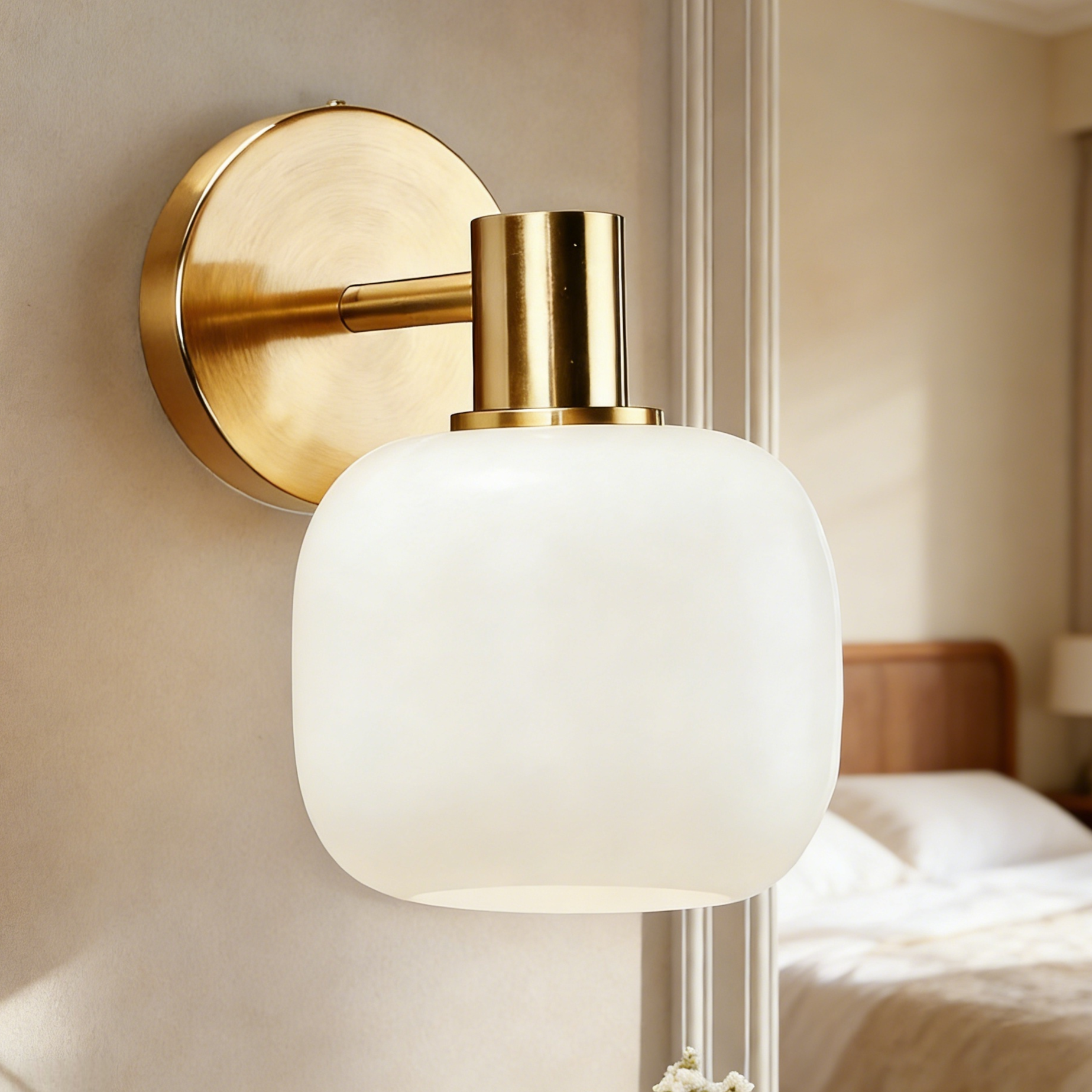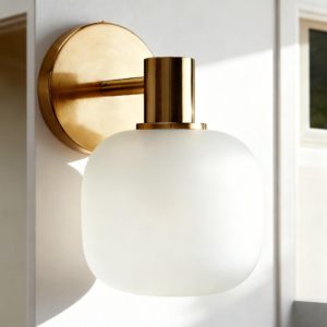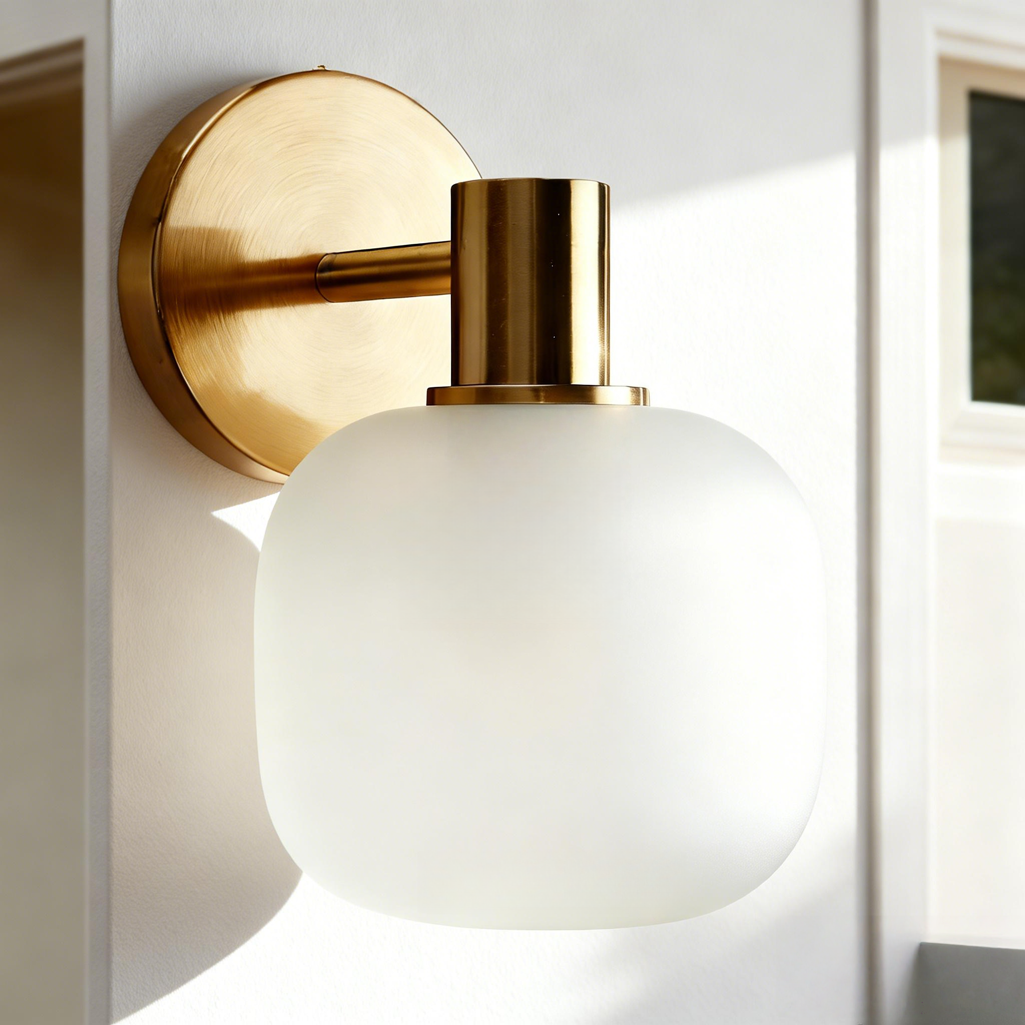 - Frosted glass curves the organic cylinder shade, complementing the fixture’s warm burnished brass finish. The subtly concave wall plate completes our exclusive single-light sconce with a final touch of softness.