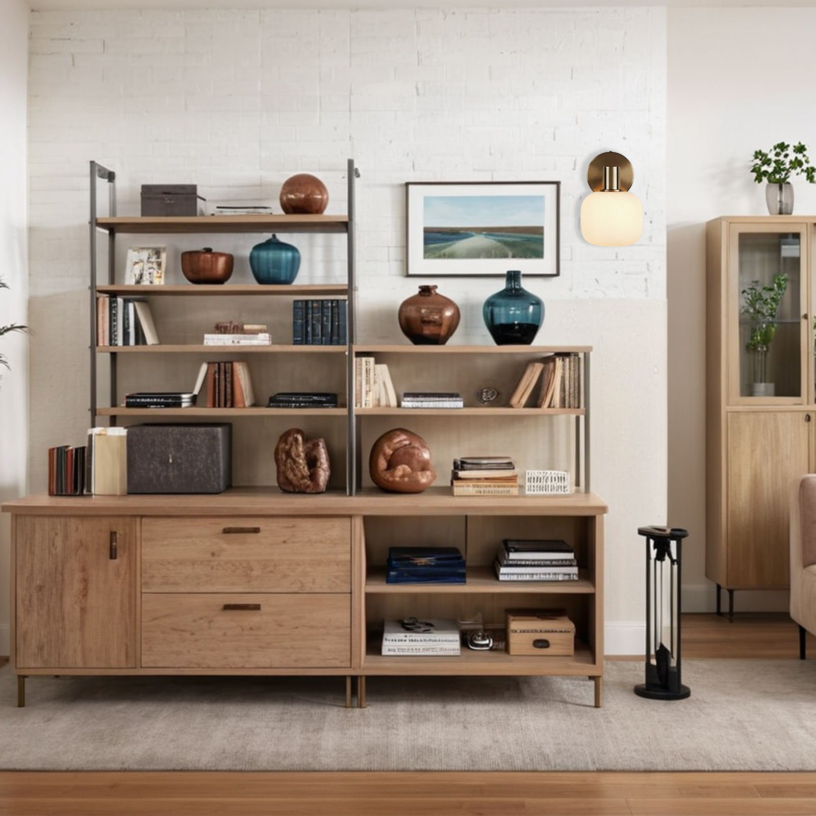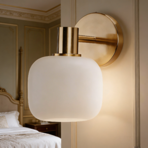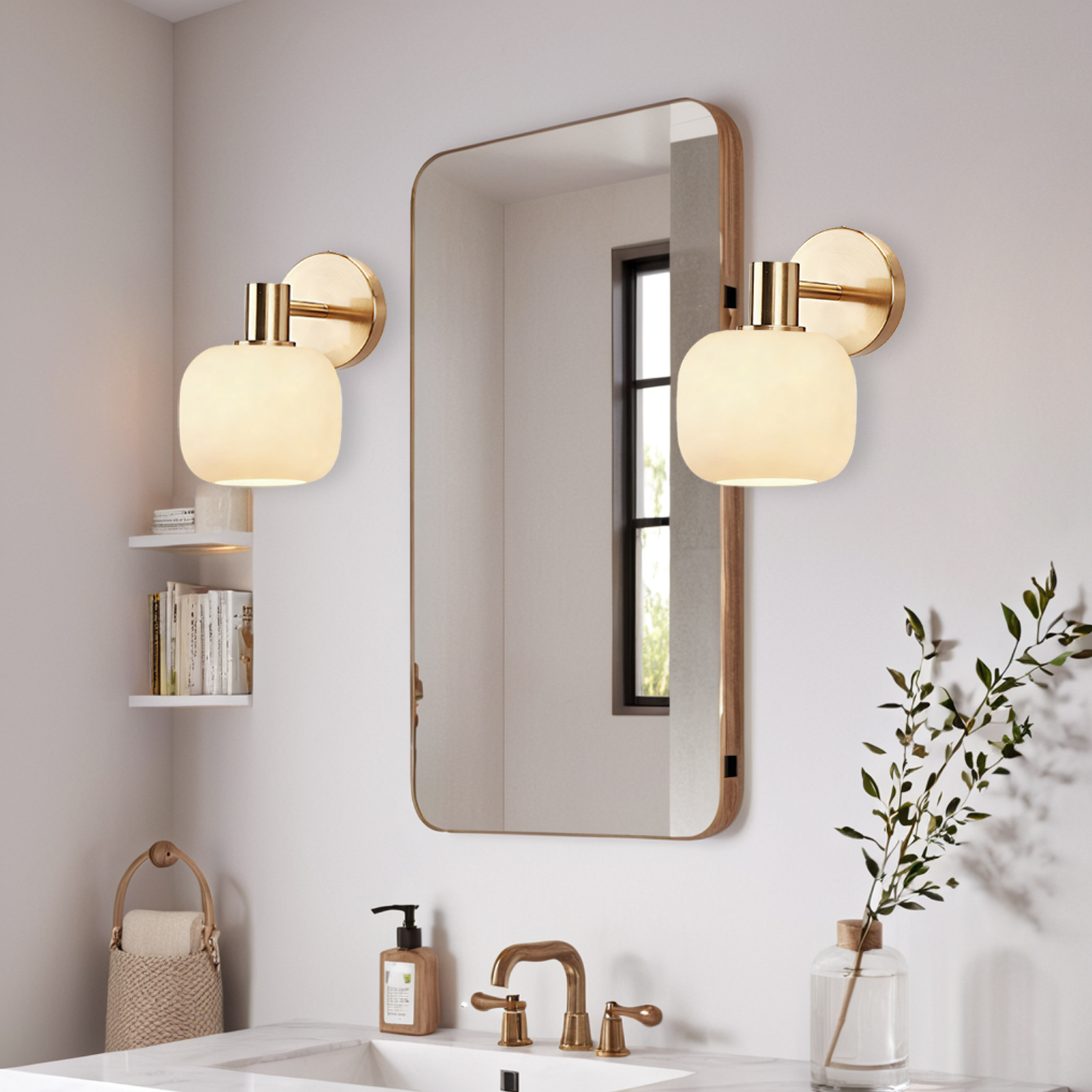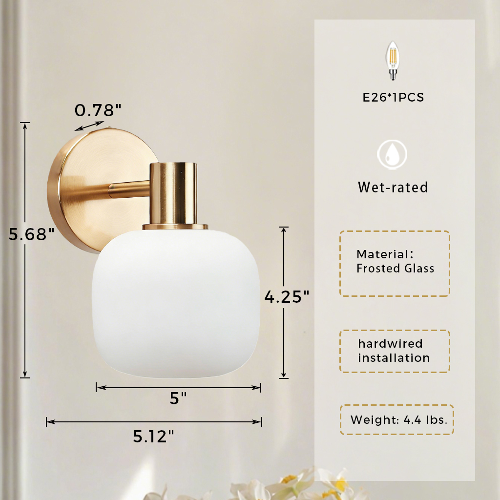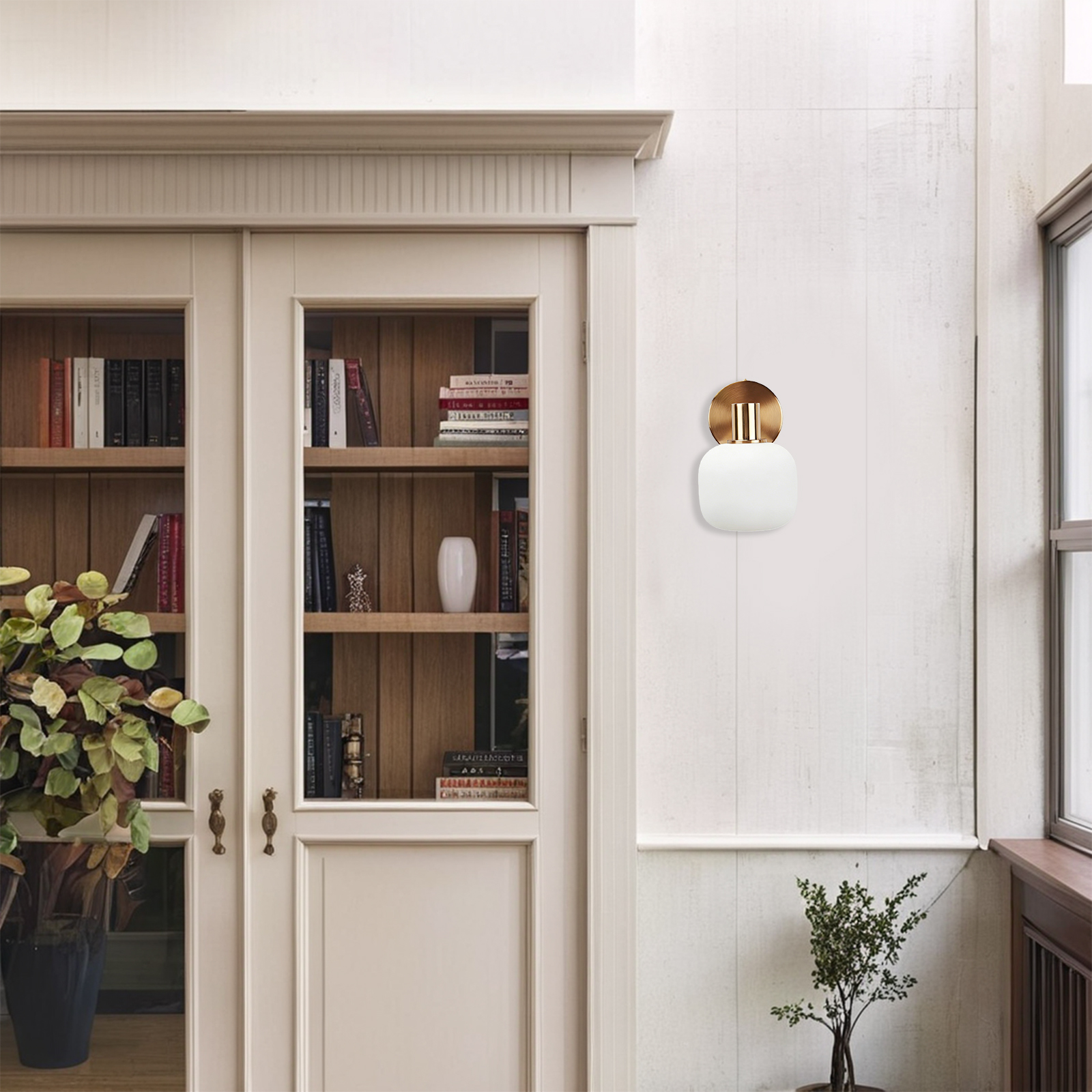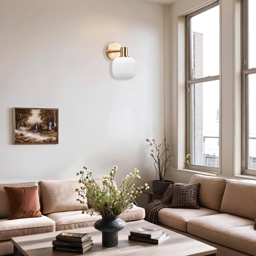 - Frosted glass curves the organic cylinder shade, complementing the fixture’s warm burnished brass finish. The subtly concave wall plate completes our exclusive single-light sconce with a final touch of softness.